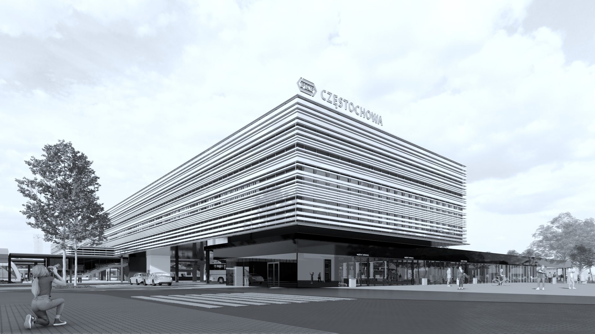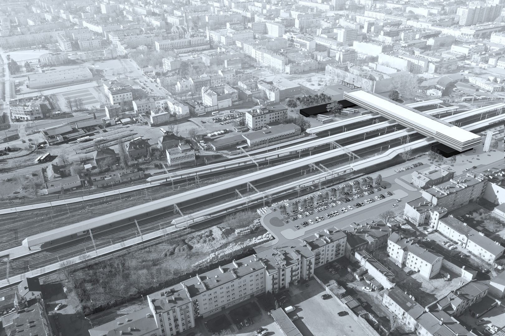 In terms of spatial decisions, the second phase of design is a continuation of phase 1. The upper volume(bridge) of the station is stretched up to the western frontage of Avenue Wolności and supported on two additional glass volumes on the ground floor.In the newly created part, it will be possible to locate any commercial functions, of which the hotel function seems to be the most reasonable due to the touristic & pilgrimage nature of the city. On the ground level would be other hotel functions: lobby, restaurant, and conference rooms. The height of the ground floor part will allow mezzanine functions to be used for services.