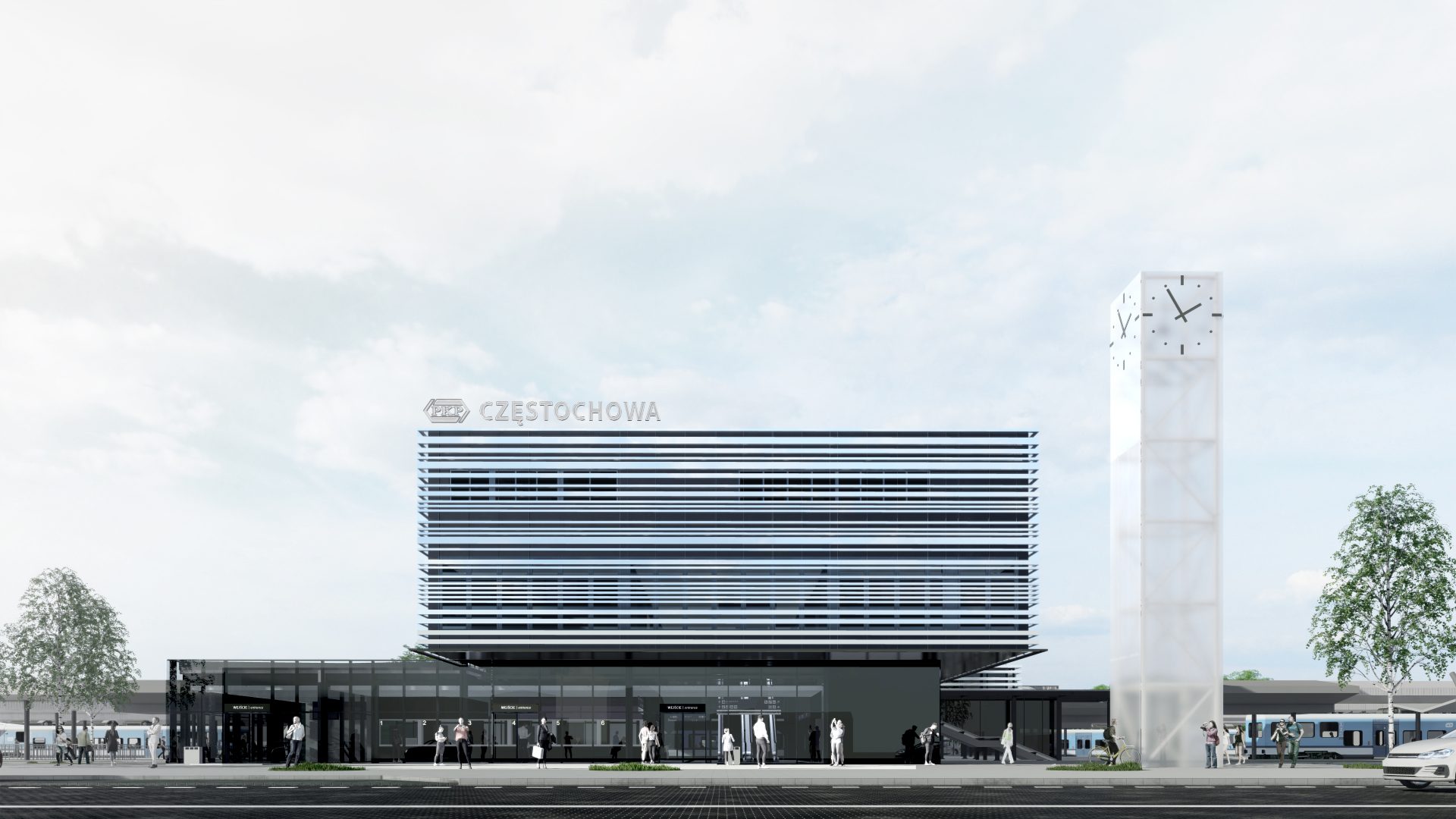 The escalator and elevator, as well as a small staircase, leads to the first floor. At the highest level of the eastern part are located rooms for railway services and technical rooms. The clock tower on the east side is the reminiscence of the original Warsaw-Vienna Railway station. It’s designed in a steel structure covered with white milk glass, thanks to which it will be reflecting the sunlight during the day and at night through the internal lighting. The tower is visible not only from Marszałka J. Piłsudskiego Street but also from the Council of Europe square and Avenue Wolności.