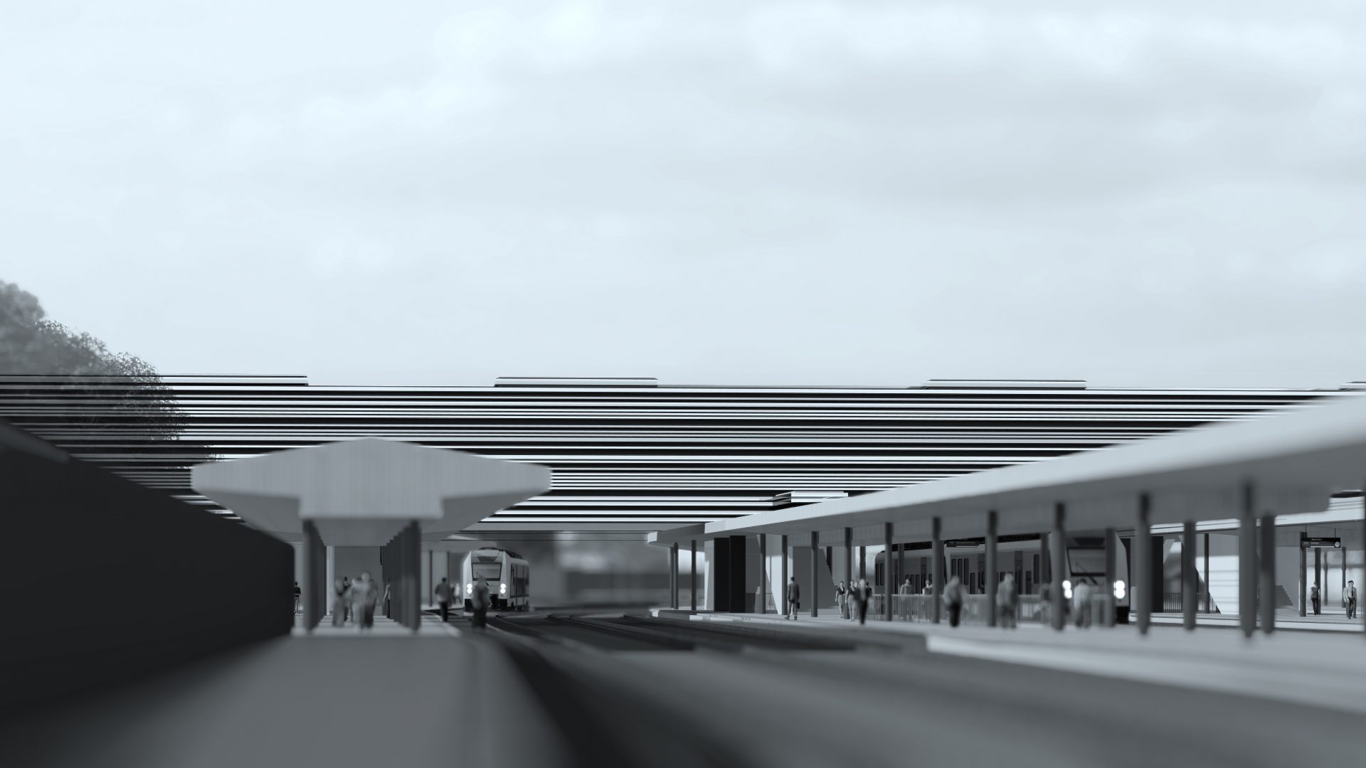 The station’s program here is limited to ticket vending machines, ATMs, information and toilets on the ground floor and waiting room with a point for serving drinks and sanitary facilities. Communication between levels is facilitated by escalator and elevator. Additional elevators allowing for the disabled access to internal platforms are designed on the intersection of the arcade and stairs.