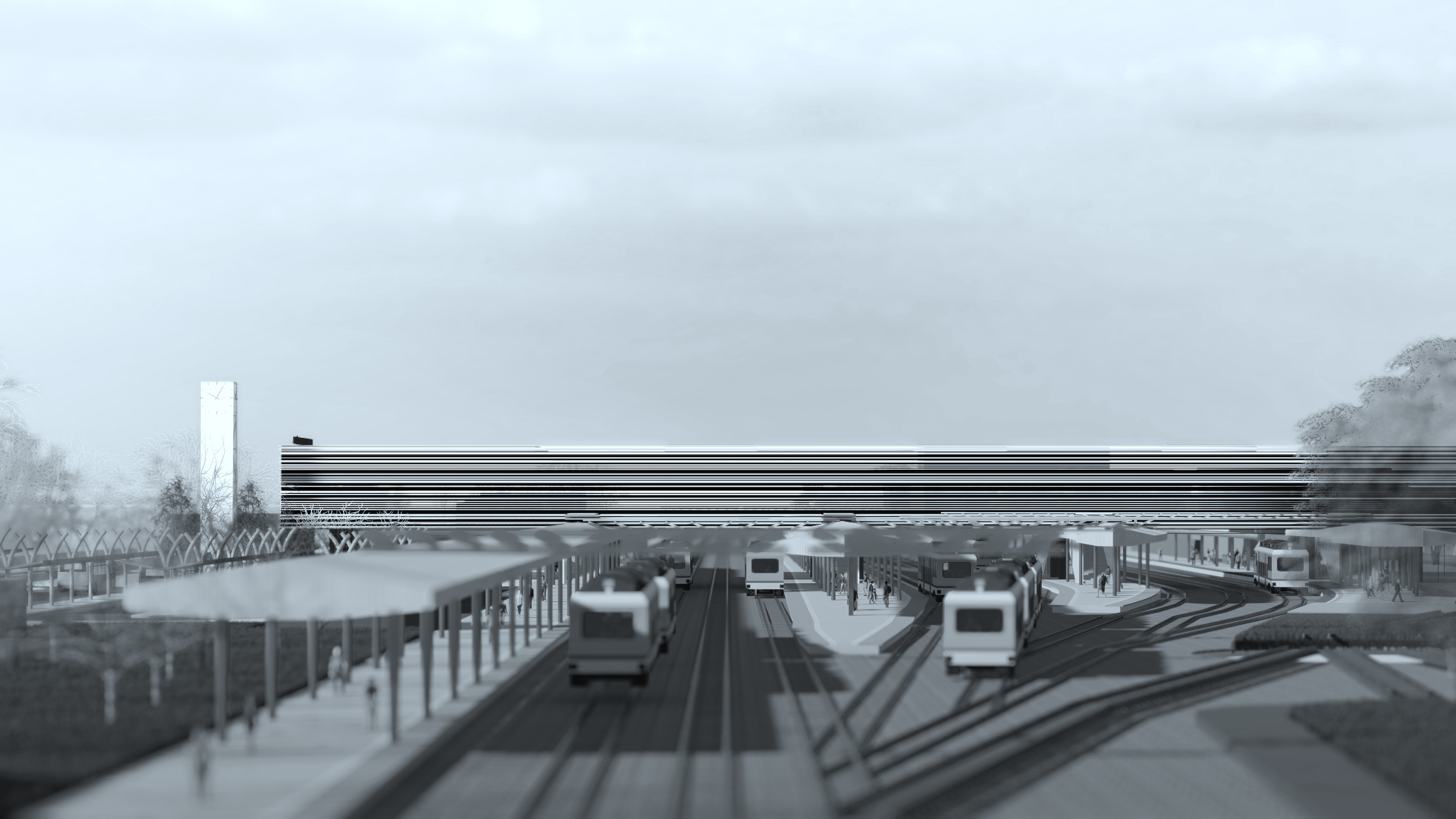 Life in the city of Częstochowa revolves around the Avenue NMP. Its strong spatial structure dominates the urban layout of the city. The existing Władysław Biegański Square never took over the role of the main market square unlike other European cities and its functions spills all over the axis of Avenue NMP right from the church of St. Zygmunt to the Jasna Góra hill. As a result, the center of the city has become slightly blurred due to the linear activity zone. The proposed railway station will not only provide as an alternative route for the people to reach from old city to a new city but will also create a new active loop comprising of various public functions that will connect both parts of the city via the new building. In order to achieve this a strong and long, almost a city park-shaped volume is thrown over the tracks which connect Avenue Wolności on the west with Marszałka J. Piłsudskiego street on the east. Because of its prominent appearance, the station post Phase 2 will be visible from Avenue NMP from over a distance of 300m.