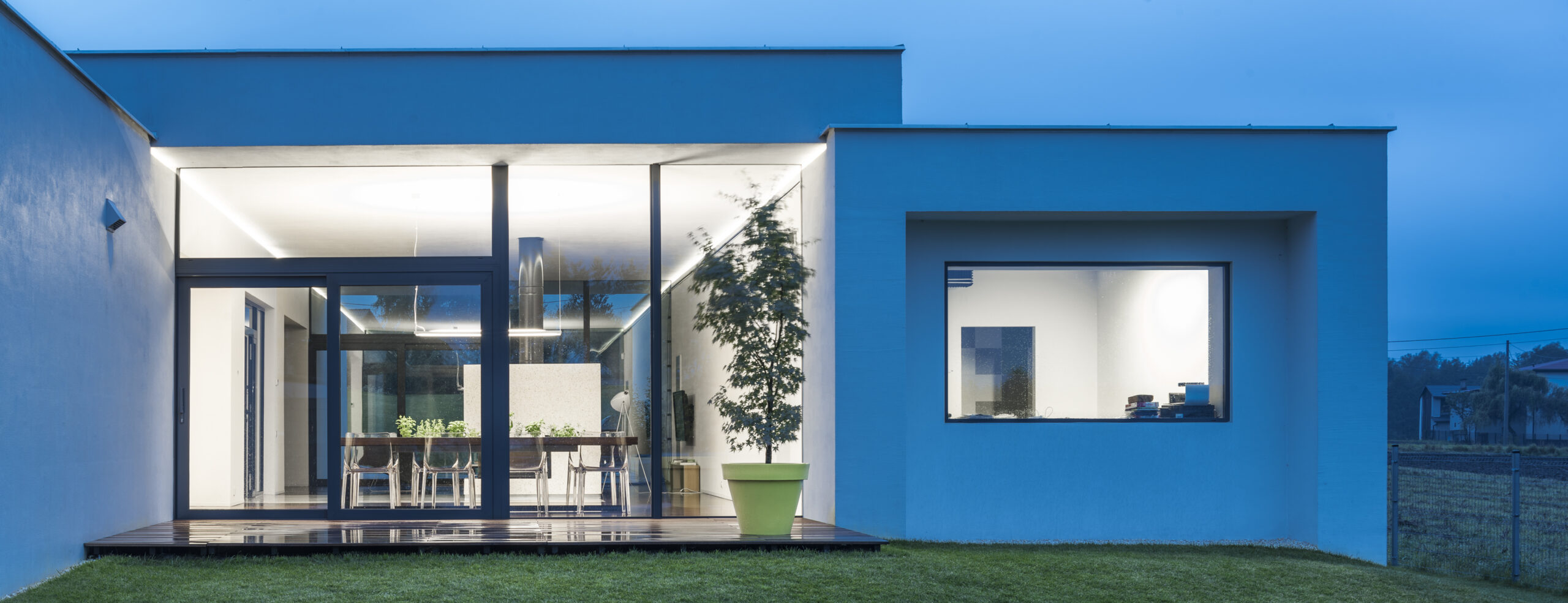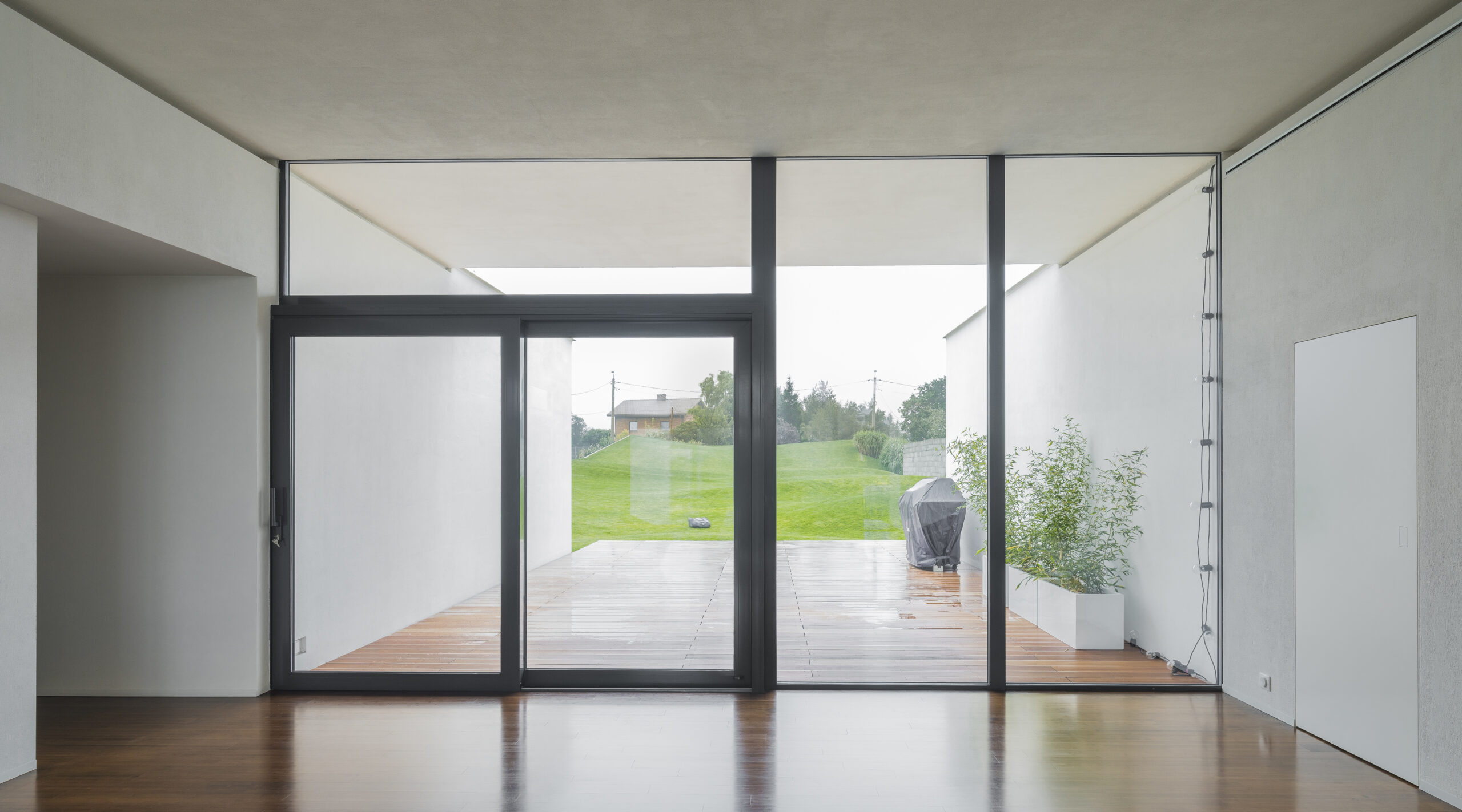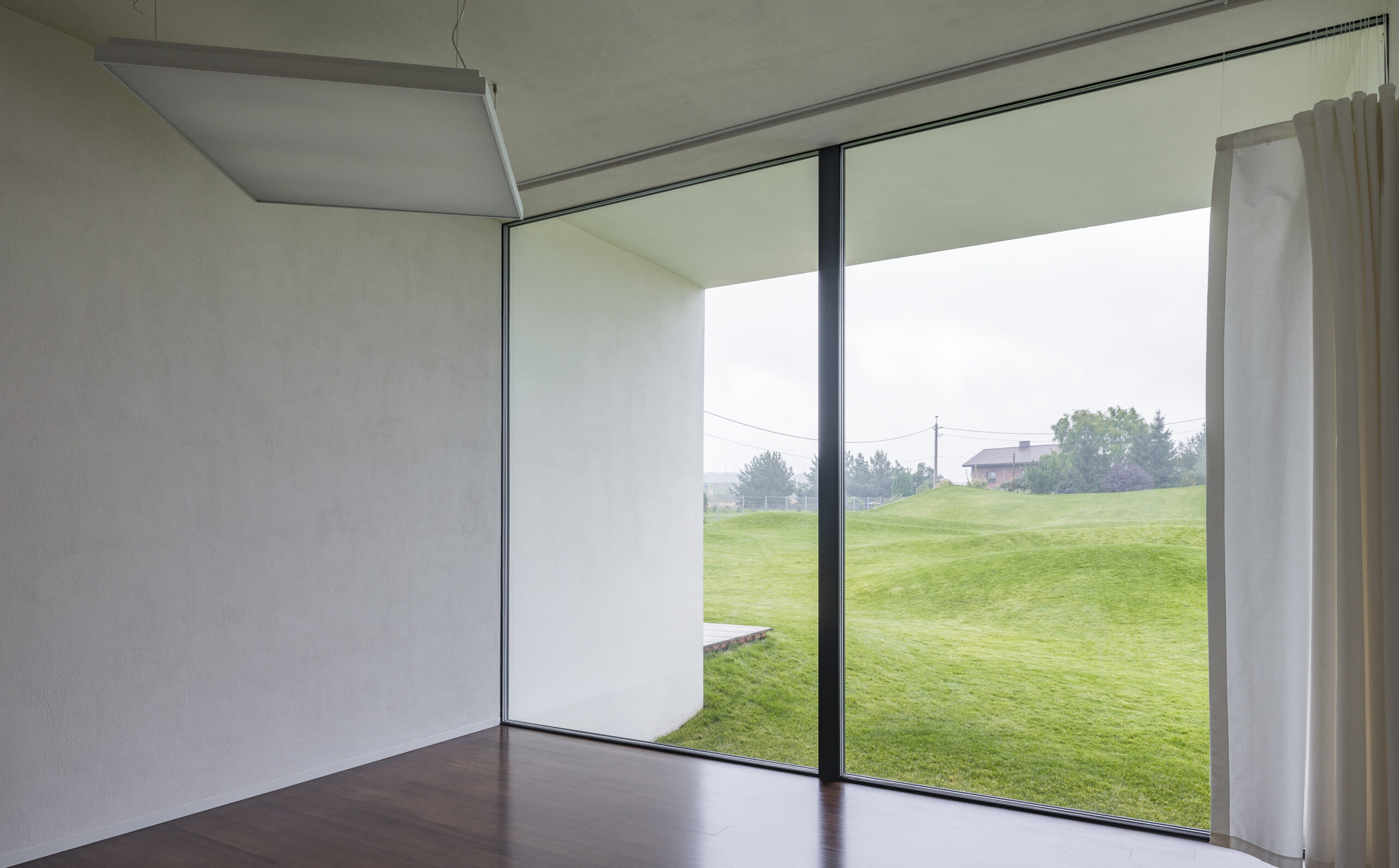 Dom to właściwie cztery ściany – bariery akustyczne, pomiędzy którymi rozlokowane zostały wszystkie funkcje. Wysunięcie ścian i dachów poza przeszklenia wychodzące na ogród ma dwa zadania: ogranicza dźwięki z autostrady i jest tak dobrane, żeby wysokie słońce w lecie nie wpadało do środka, a niskie w zimie tak. To działa.