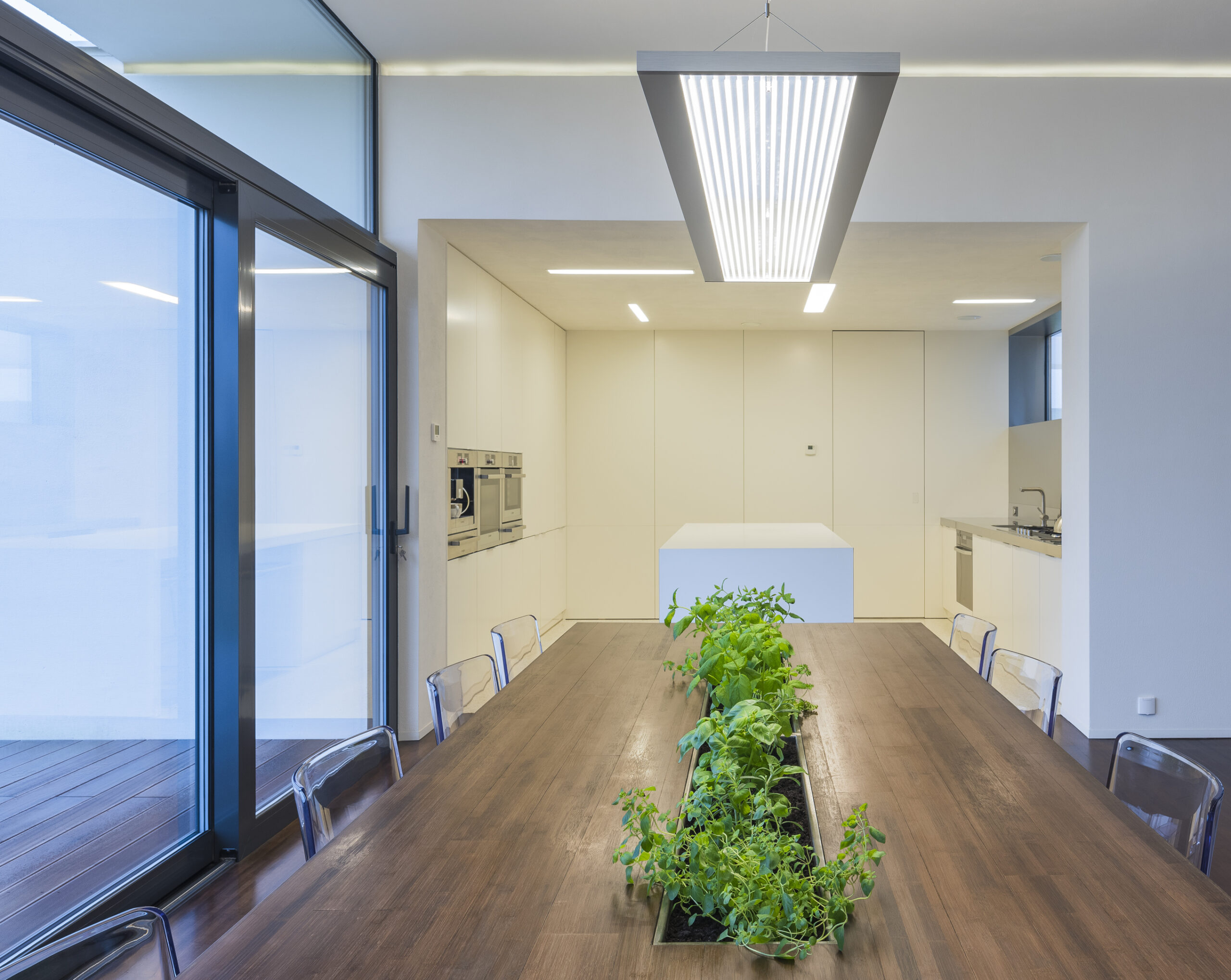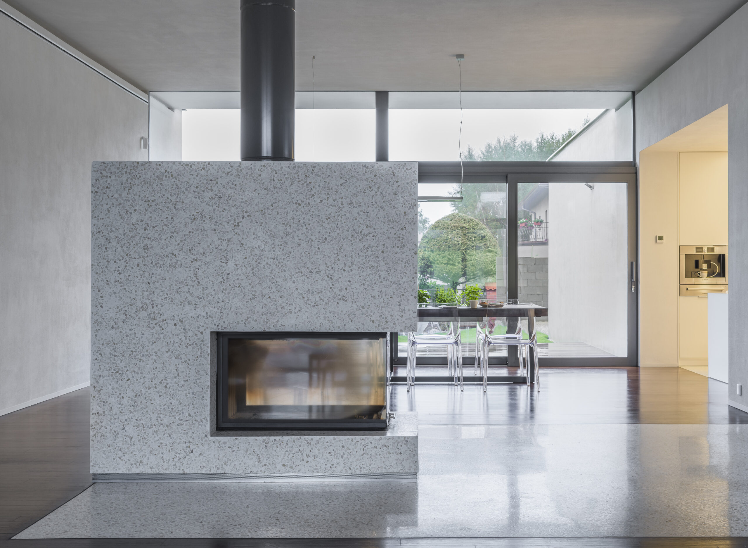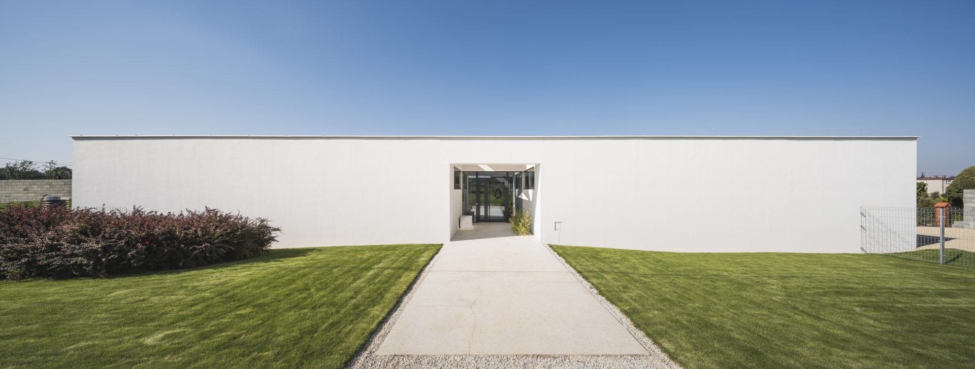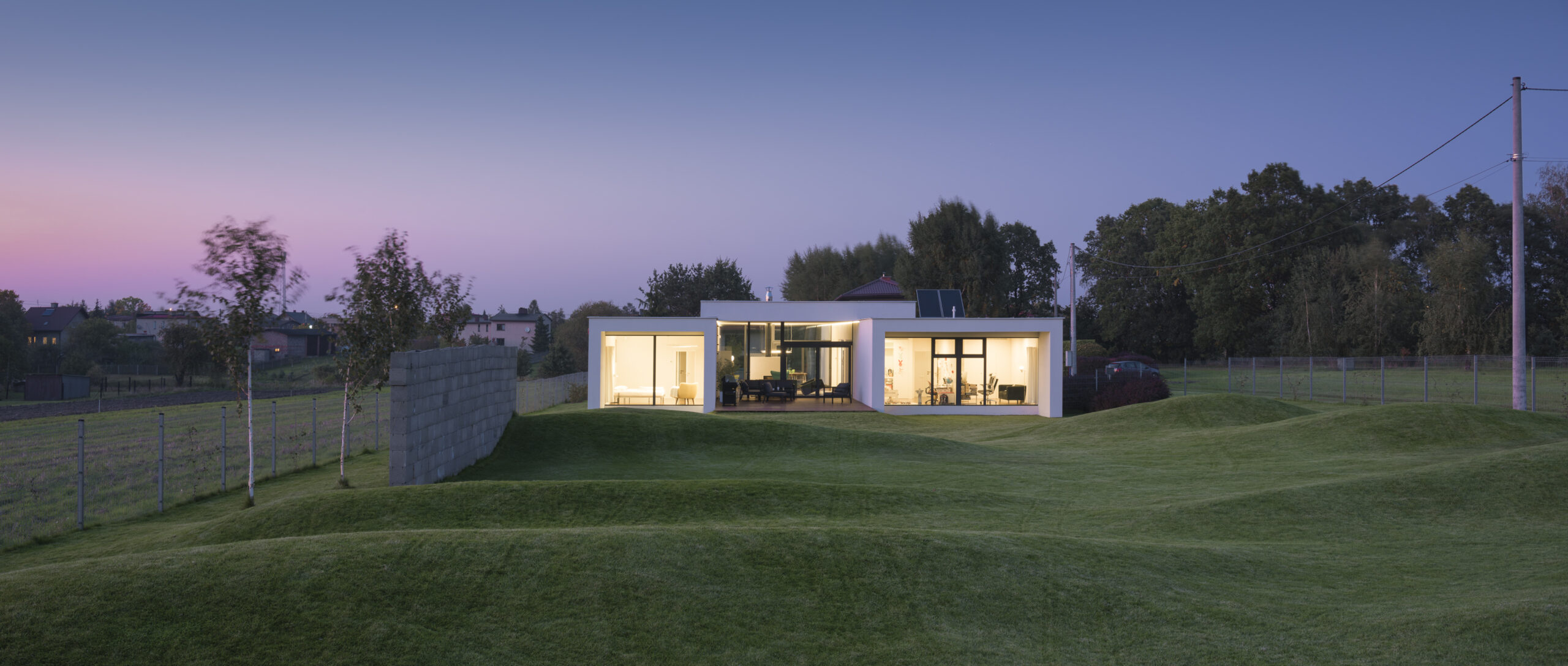 Pierwotnie ściany miały być wykonane z betonu architektonicznego, ale kłopoty ze znalezieniem wiarygodnego wykonawcy spowodowały, że ostatecznie zastosowany został tynk malowany na biało. Dom to właściwie dwa tunele (większy i mniejszy) o kierunku N-S równoległym do autostrady. Pokój dzienny powstał przez przekrycie przestrzeni pomiędzy tunelami. Otwarty na północ i południe w stronę ogrodu i tarasów jest miejscem spotkań pomiędzy rodzicami mieszkającymi w tunelu zachodnim, a dziećmi okupującymi tunel wschodni. W samym środku domu stoi kominek wylany tak jak cała strefa wejściowa z lastricko, pięknego materiału, który warto przywrócić do łask.