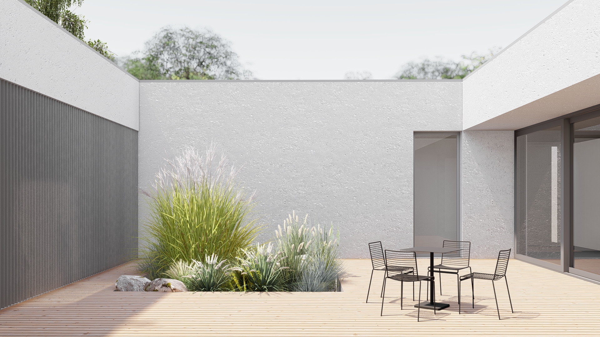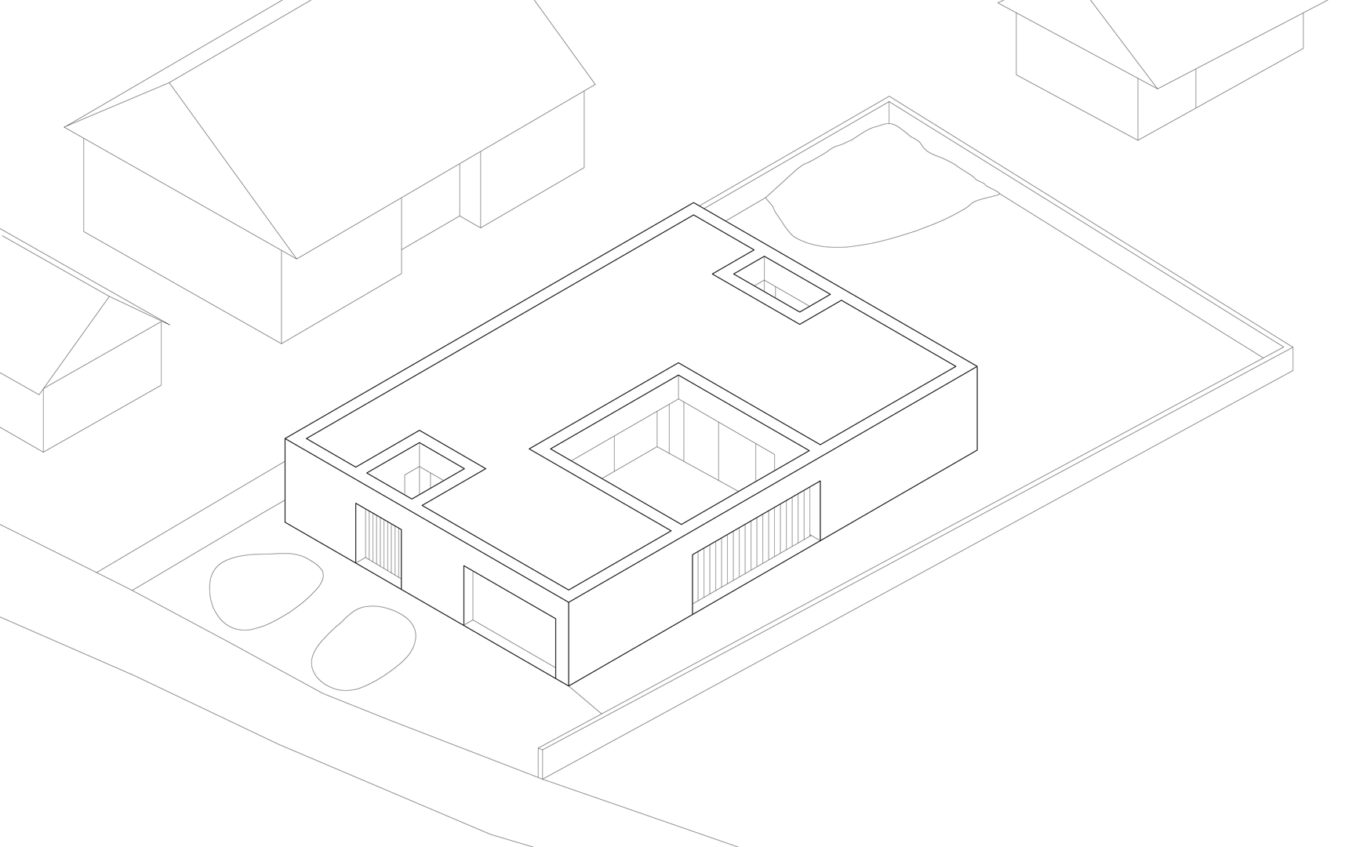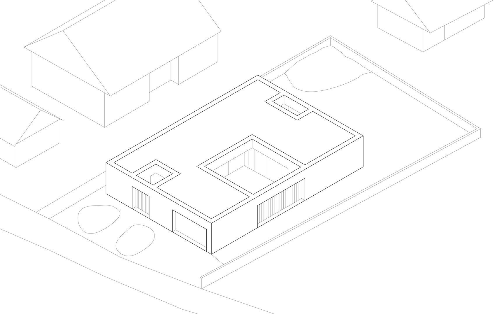 Bryłę sperforowaliśmy trzema atriami. Średnie-wejściowe stanowi śluzę odgradzającą dom od drogi. Duże – środkowe to serce domu, przedłużenie pokoju dziennego, miejsce do którego można się dostać łatwo z każdego pomieszczenia w domu. Wreszcie małe, z widokiem na ogród, całkowicie przynależne do sypialni właścicieli, przeznaczona na poranną kawę w szlafroku lub zwierzenia przyjaciółek. Z widokiem na ogród, bo i ten udało się wygospodarować jednak nie jako przestrzeń użytkową a jedynie obraz do oglądania. Okna wszystkich sypialni zwrócone są w tą stronę i nie mają podziałów co czyni z nich ramy kadrujące widok. Na końcu ogrodu zieleń ma zasłaniać stodołę póki ta sama się nie przewróci. Taka całoroczna fototapeta.