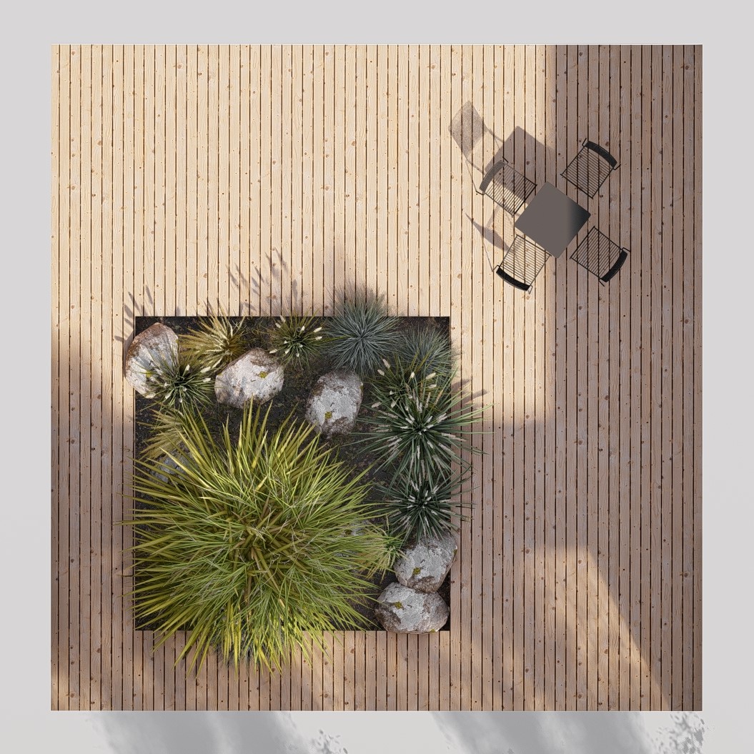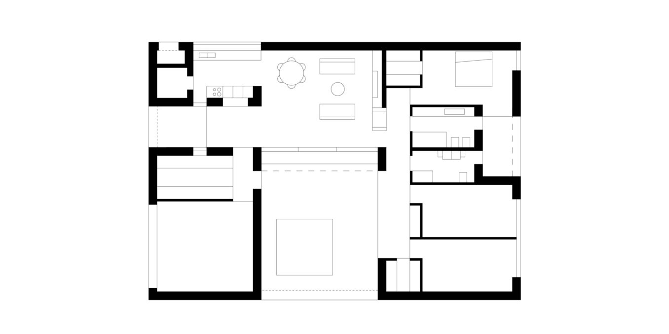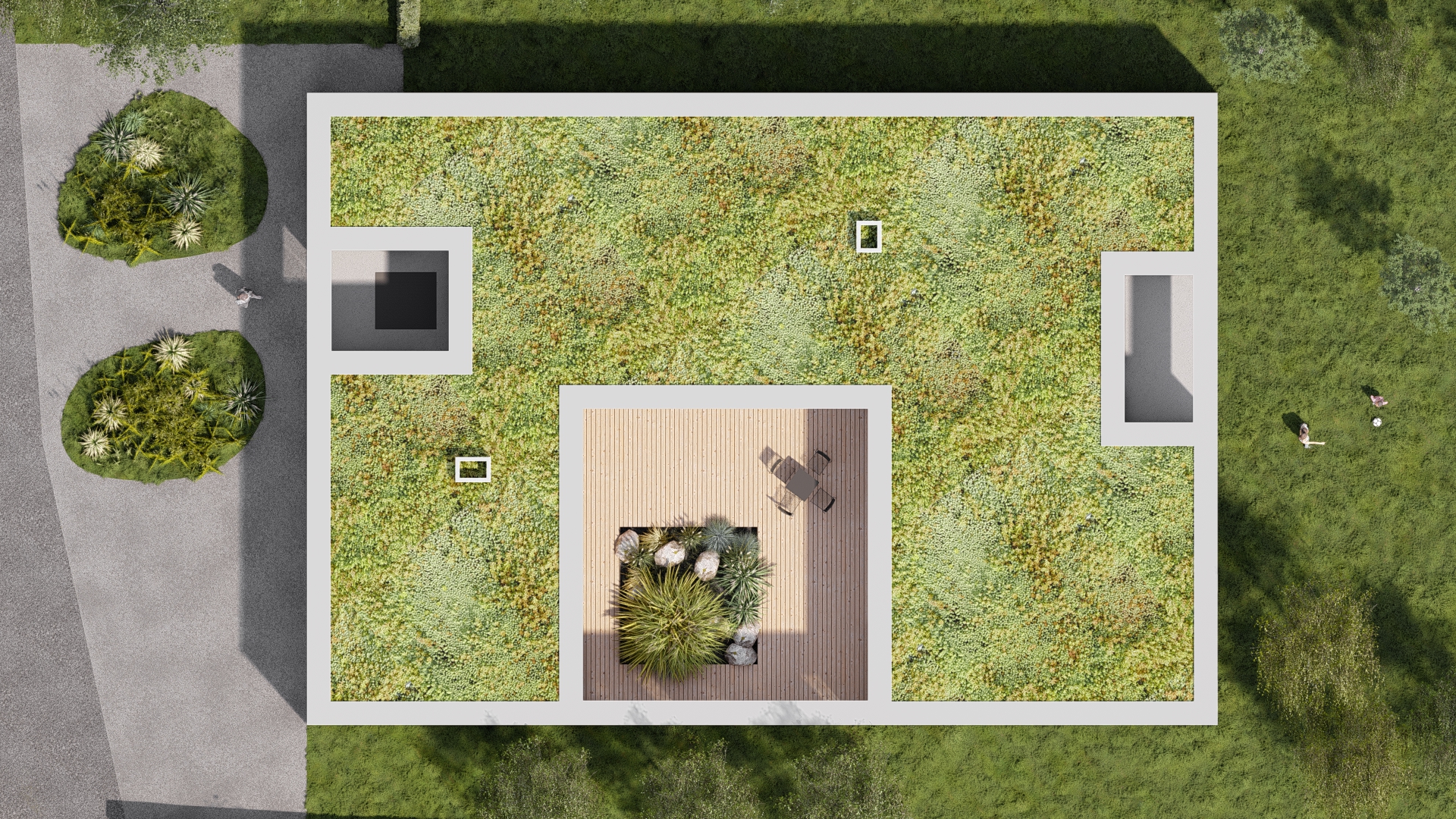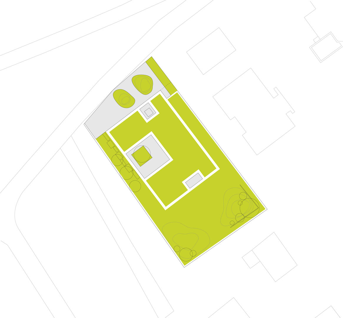 Bryłę sperforowaliśmy trzema atriami. Średnie-wejściowe stanowi śluzę odgradzającą dom od drogi. Duże – środkowe to serce domu, przedłużenie pokoju dziennego, miejsce do którego można się dostać łatwo z każdego pomieszczenia w domu. Wreszcie małe, z widokiem na ogród, całkowicie przynależne do sypialni właścicieli, przeznaczona na poranną kawę w szlafroku lub zwierzenia przyjaciółek. Z widokiem na ogród, bo i ten udało się wygospodarować jednak nie jako przestrzeń użytkową a jedynie obraz do oglądania. Okna wszystkich sypialni zwrócone są w tą stronę i nie mają podziałów co czyni z nich ramy kadrujące widok. Na końcu ogrodu zieleń ma zasłaniać stodołę póki ta sama się nie przewróci. Taka całoroczna fototapeta.