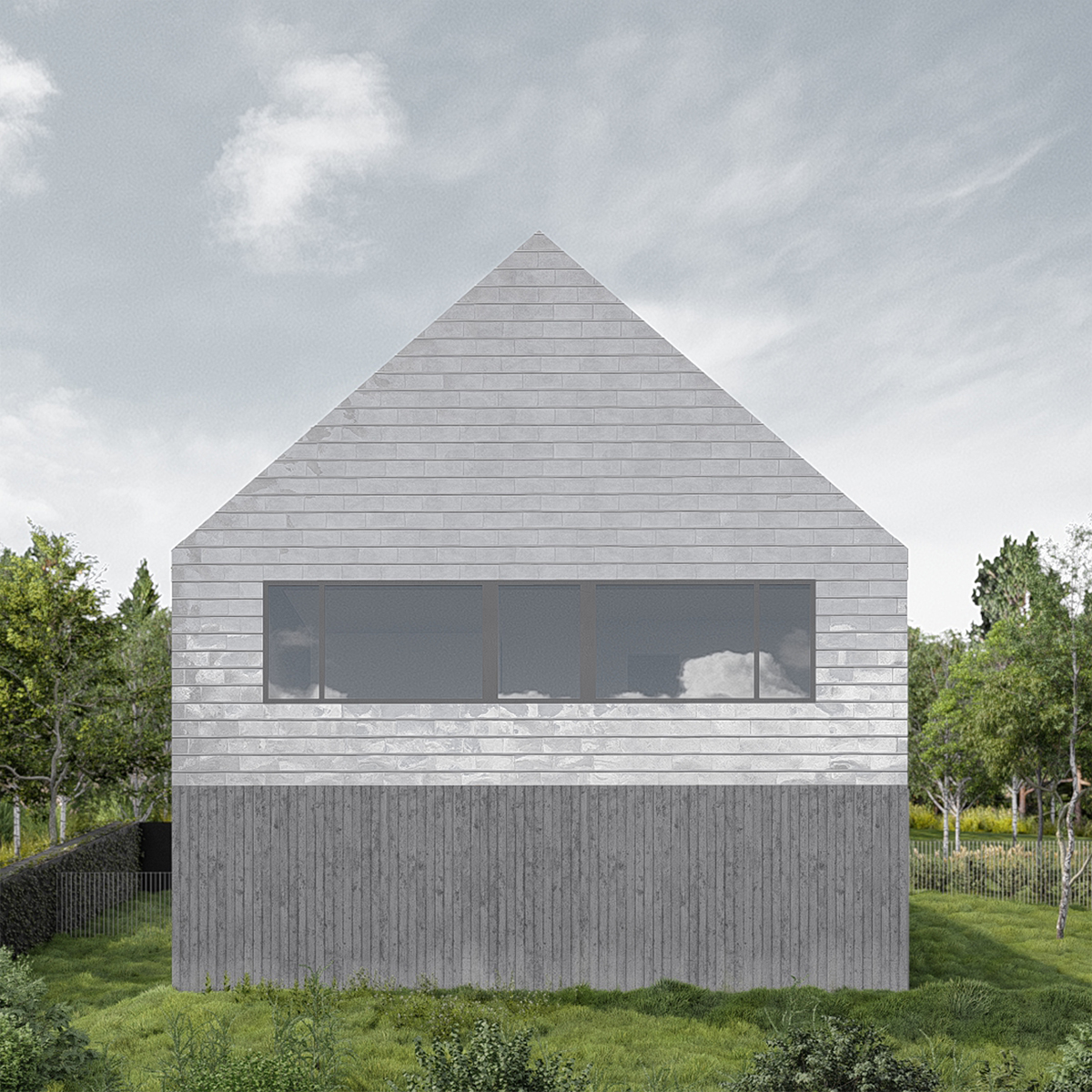 Na koniec dom kształtuje się z czterech kwadratów 9x9m po dwa na kondygnację. Od północy kwadrat garażu i wejścia pod którym kwadrat prawie całkowicie zagłębiony w ziemi mieszczący pomieszczenia techniczne i królestwo pana domu gabinet, siłownia i pomieszczenie odsłuchowe w jednym. Na południe kwadrat sypialni, które wiszą nad w pełni przeszklonym na wschód i zachód pokojem dziennym – czwartym kwadratem. Taras przy pokoju lekko zagłębiony w bryle budynku jest dodatkowo przesłaniany od drogi przez kładkę wejścia mieszczącego się kondygnację wyżej. Pełna intymność.