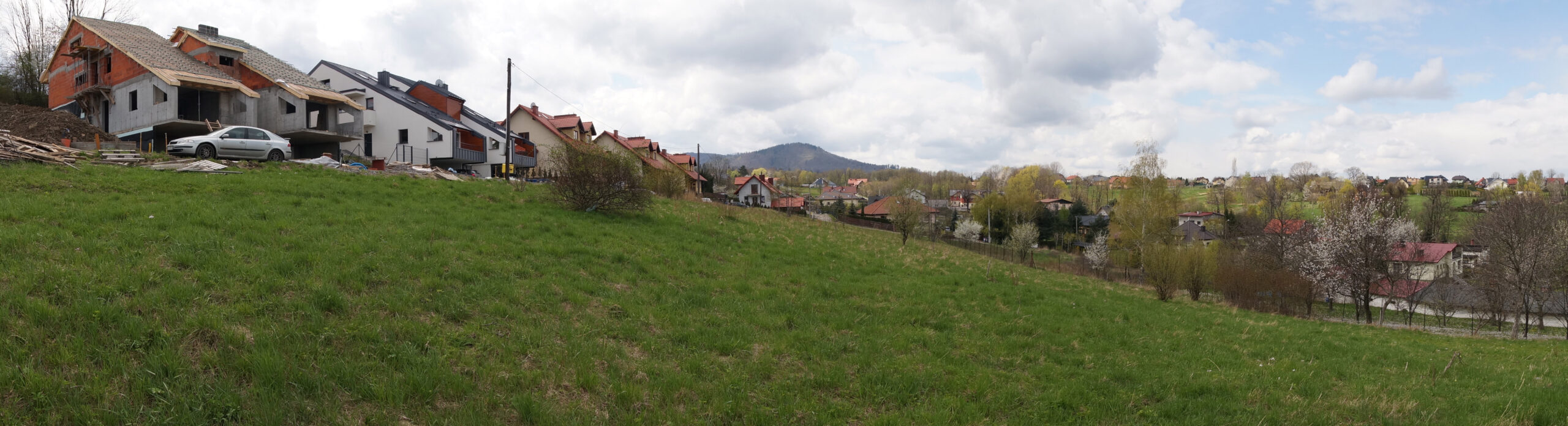Dom na stoku, brzmi nieźle. Na mapce też wyglądało to całkiem fajnie. Działka spora, z dość szerokim frontem. Ostry spadek – to daje szansę na malownicze rozwiązania, teren uzbrojony, dobry dojazd z centrum Bielska. Może północna ekspozycja nie jest optymalna, ale z tym można sobie poradzić.