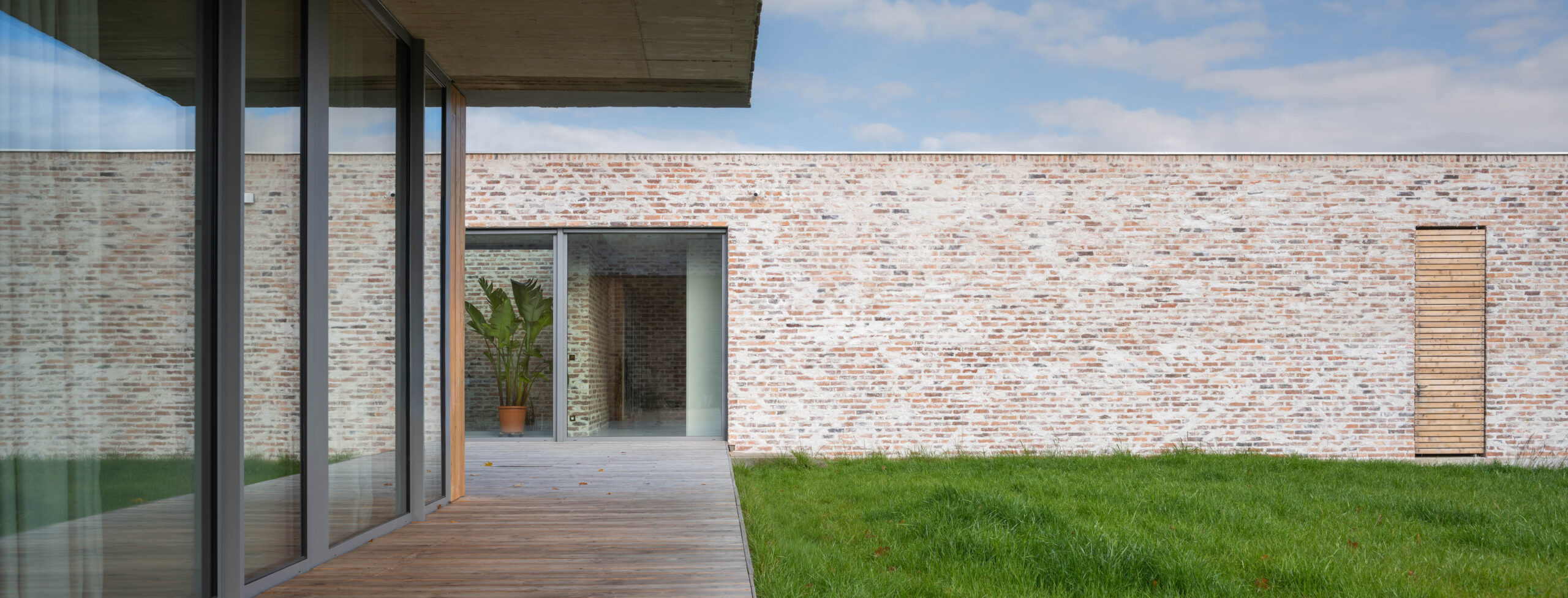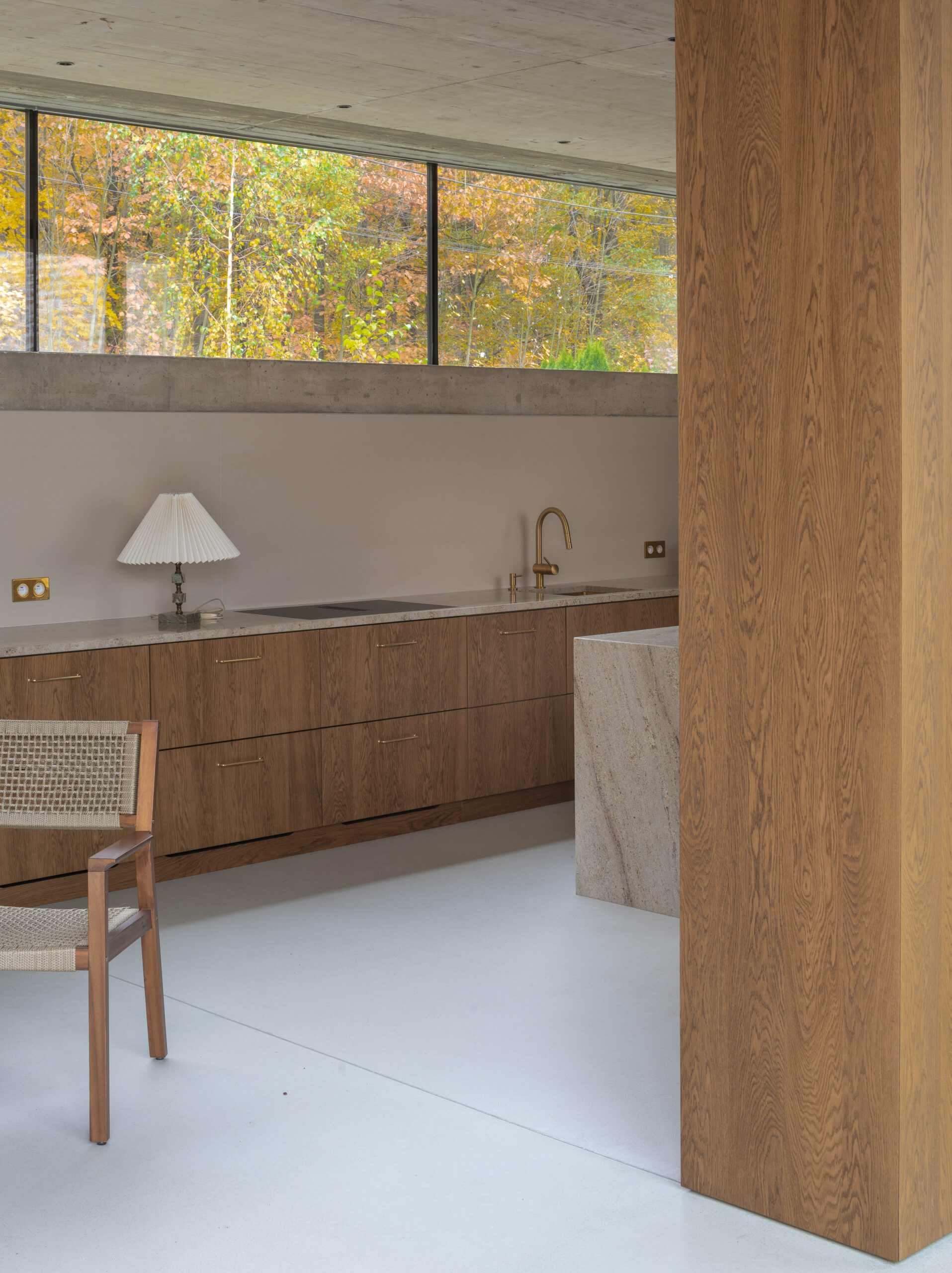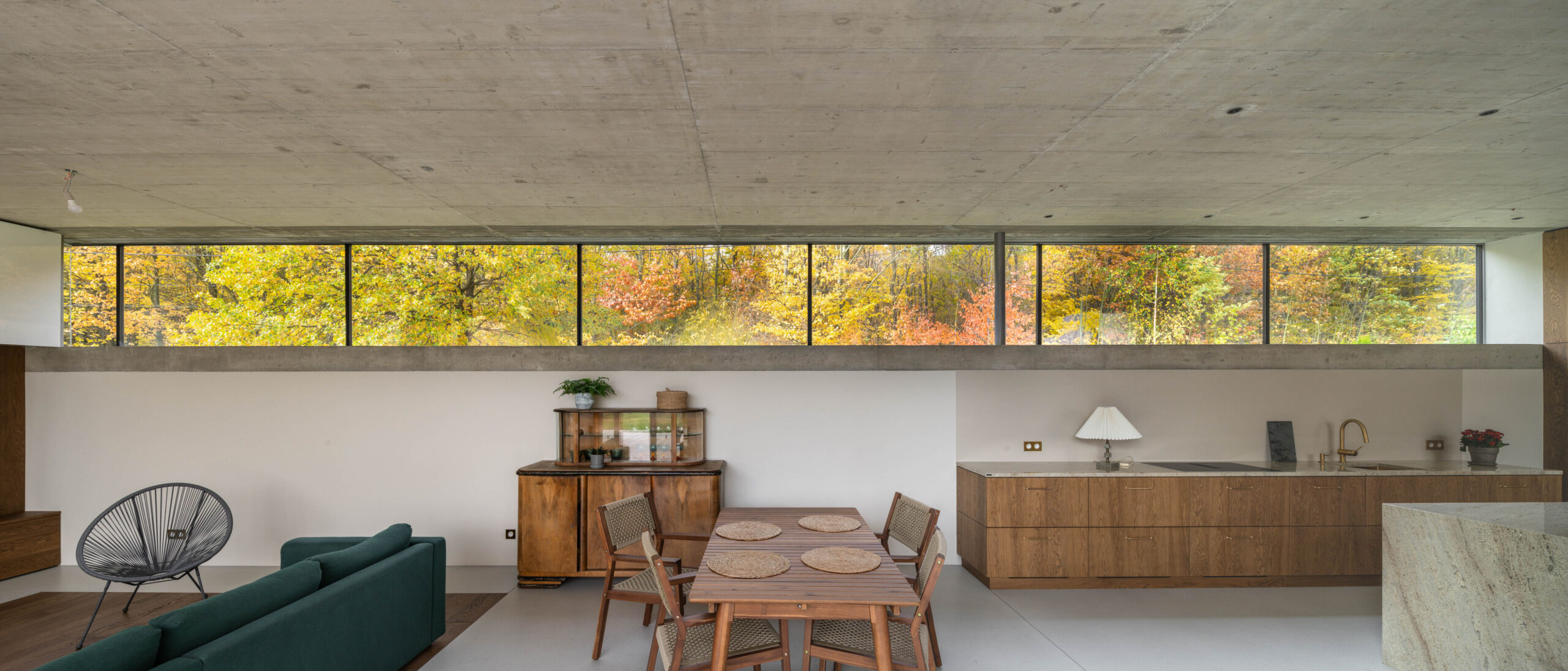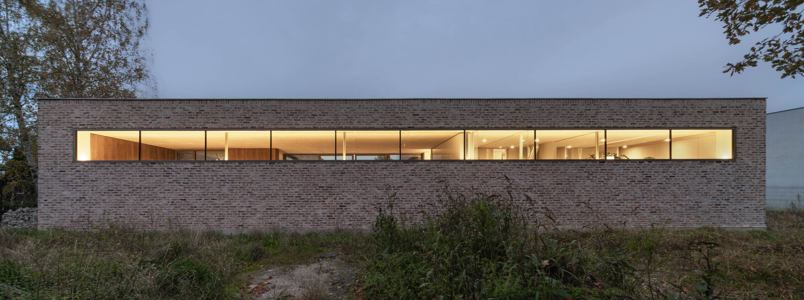 Wąskie, położone powyżej poziomu wzroku okno biegnące wzdłuż całej zachodniej elewacji kadruje widok z wnętrza domu na korony drzew i zachodzące za nimi słońce. Jednocześnie kontakt wzrokowy pomiędzy ulicą a mieszkańcami domu jest niemożliwy.