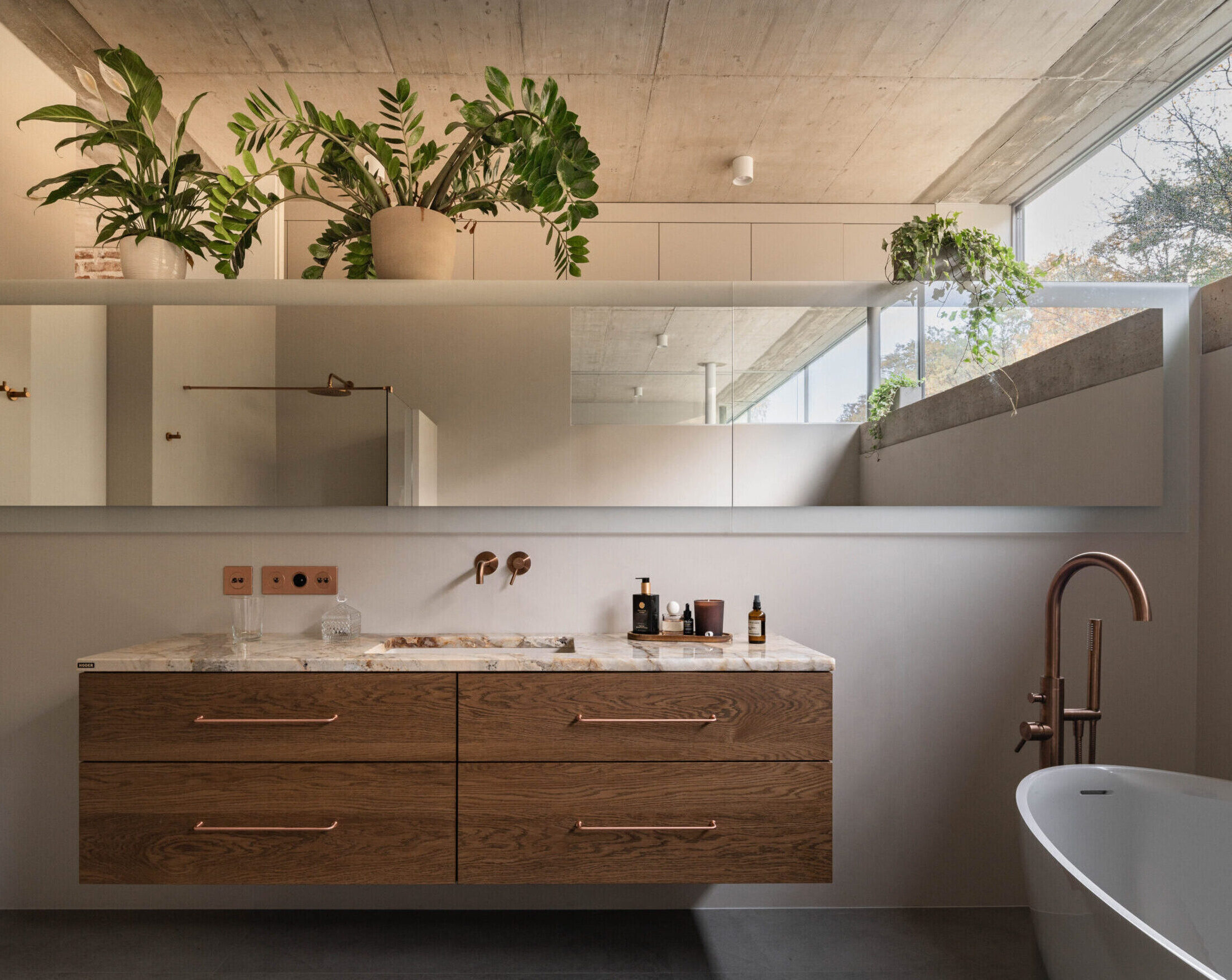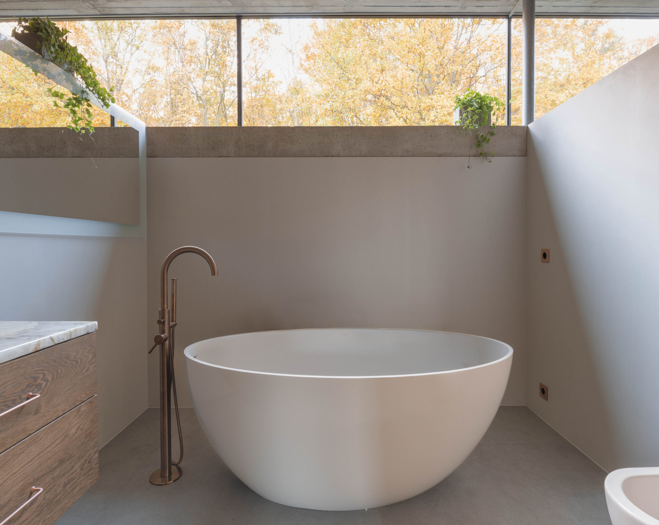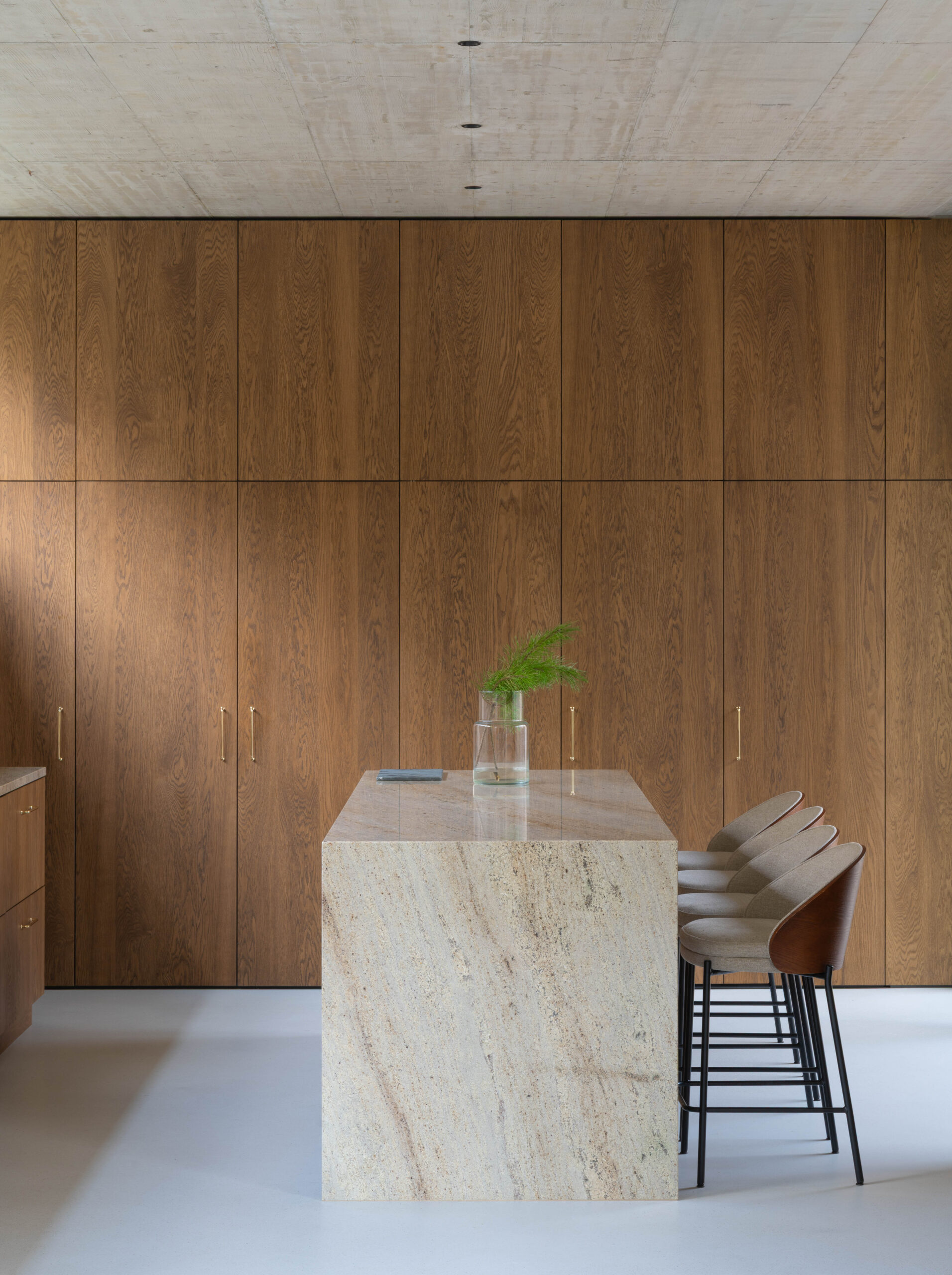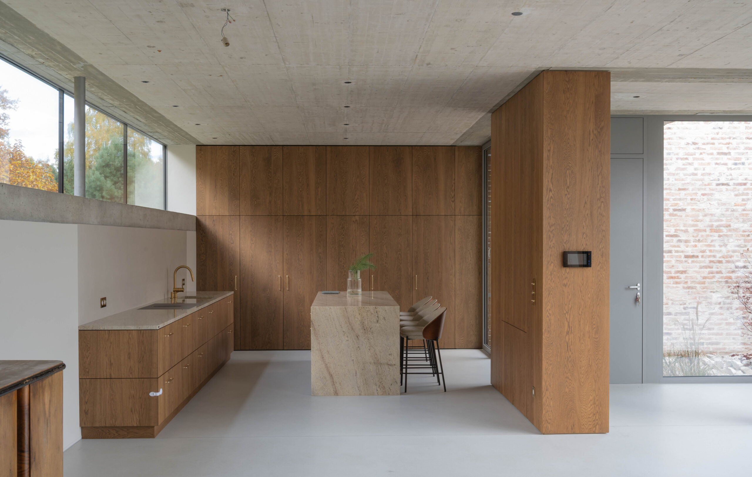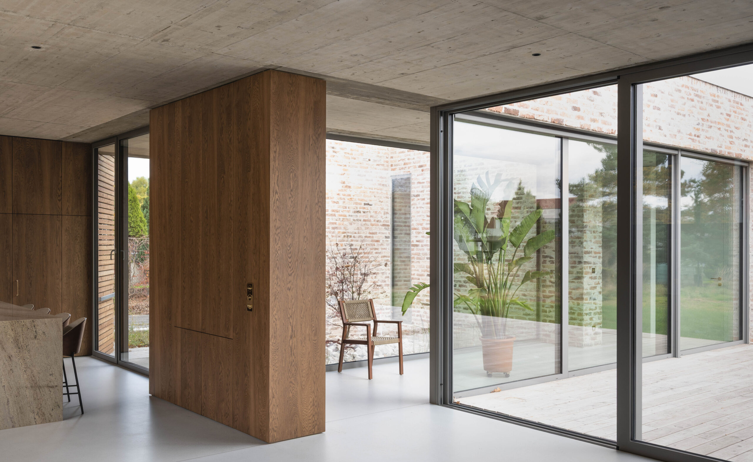 Żelbetowe sufity przechodzą w zadaszenia zewnętrzne w taki sposób, że zaciera się granica między wnętrzem i ogrodem.