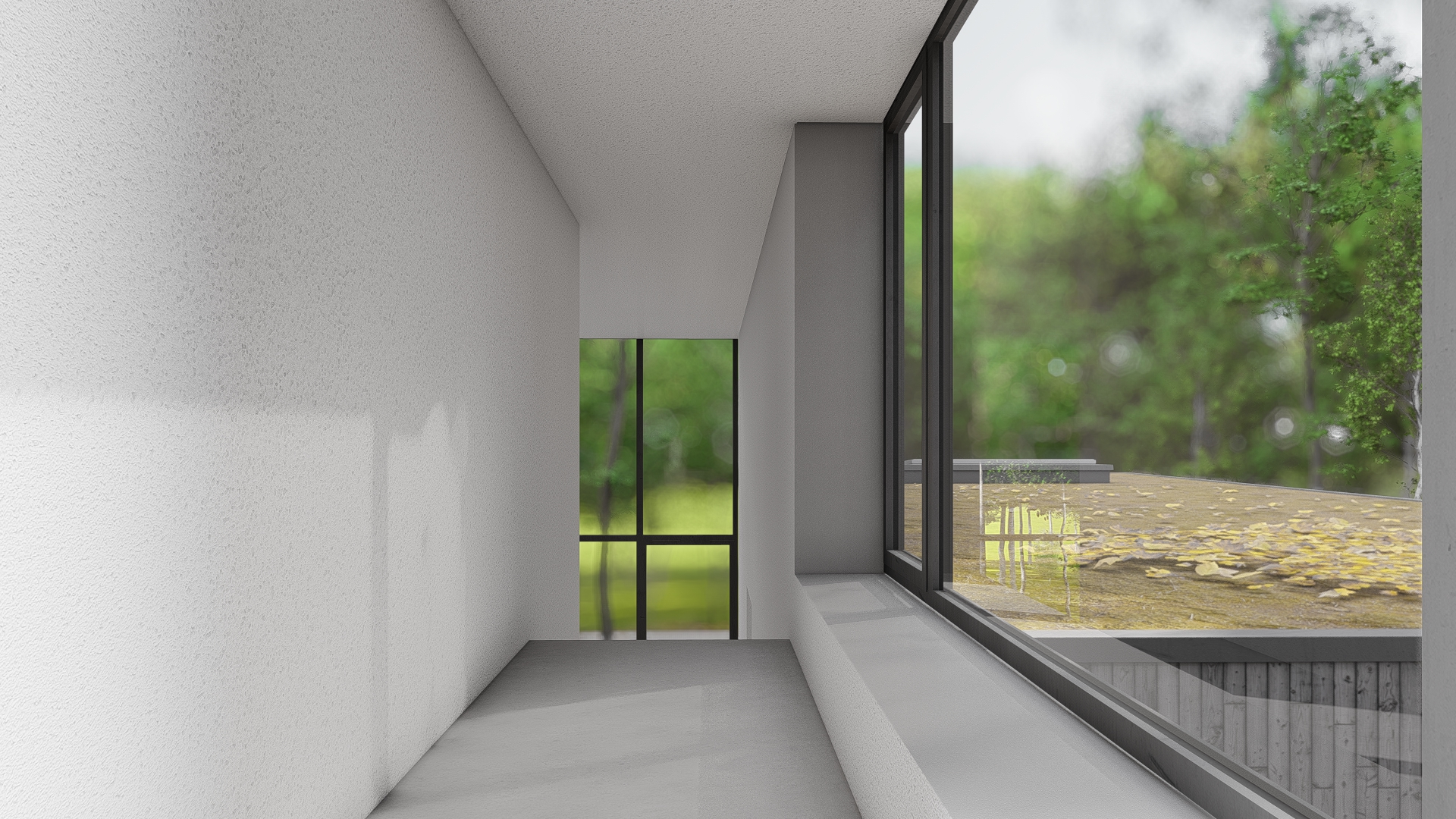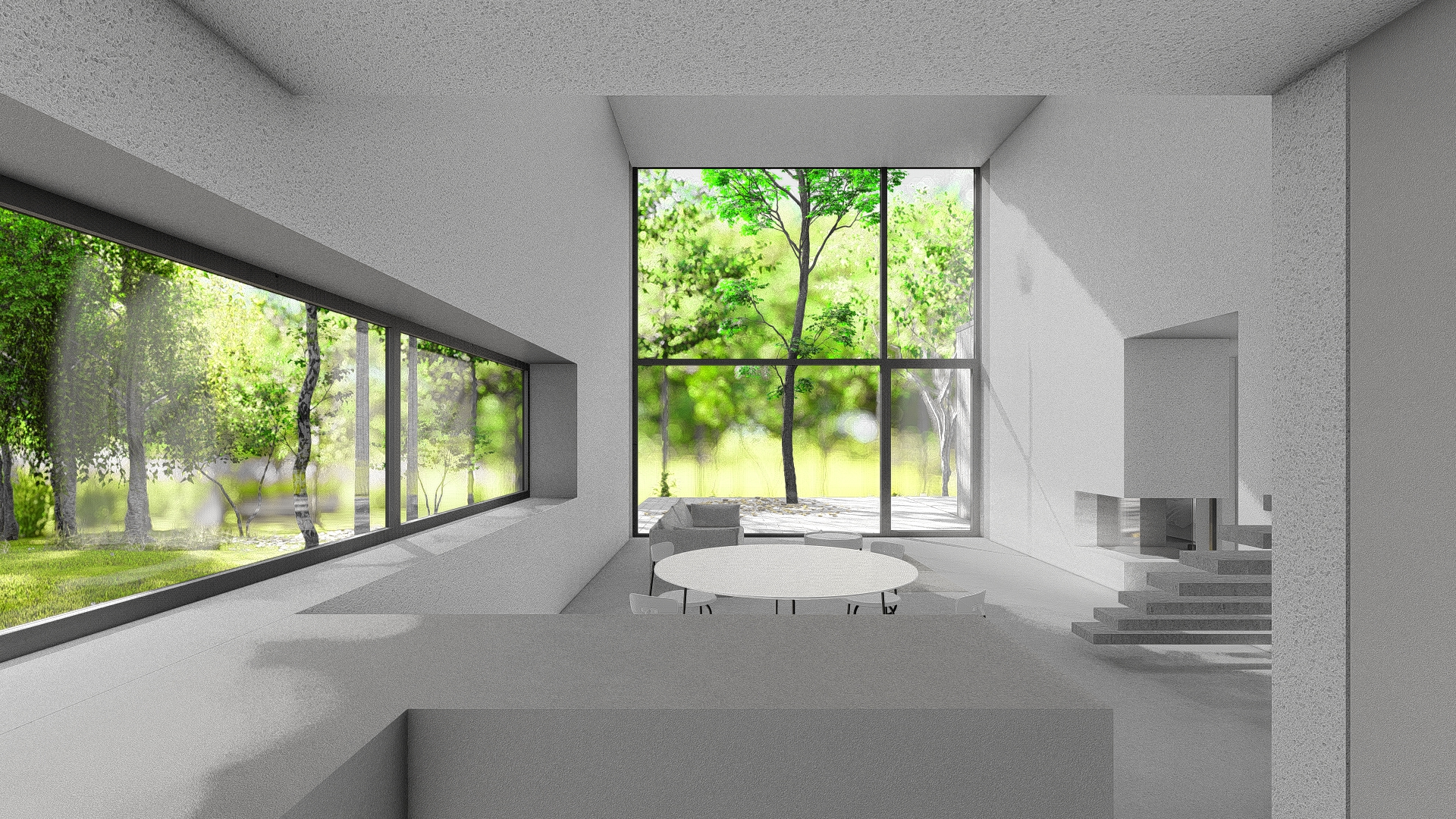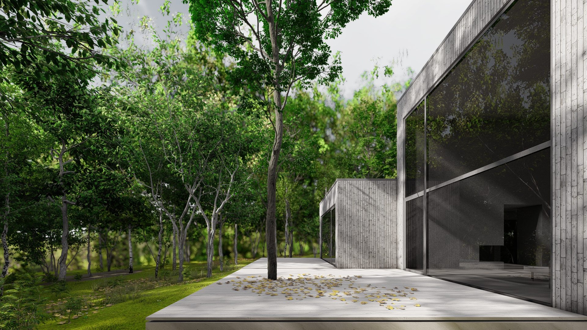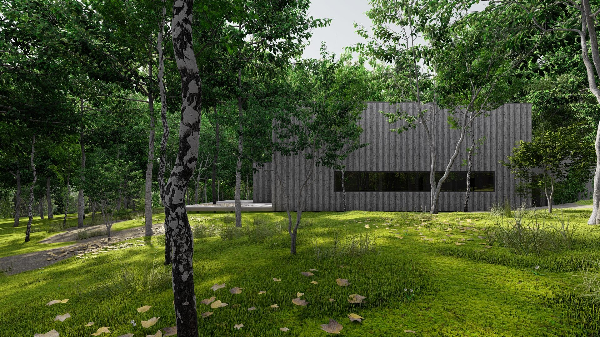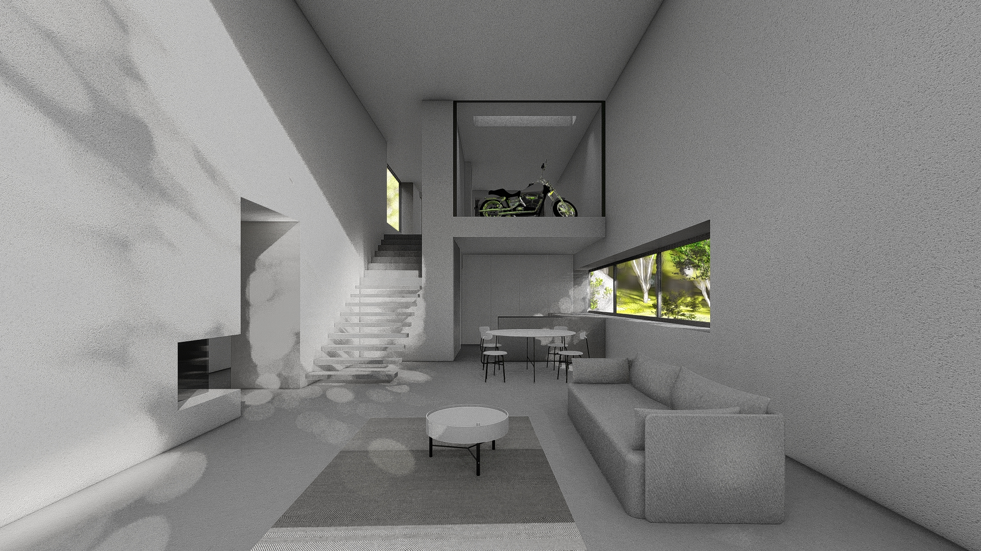 Dom zaprojektowano na niekarczowanej od lat, stromej działce na skraju osiedla domów jednorodzinnych w Rybniku. Obiekt usytuowano tak by zminimalizować wycinkę drzew. Duża różnica poziomów terenu pozwoliła na zaprojektowaniu niestandarowego układu funkcjonalnego, w którym garaż przybrał formę antresoli z wyeksponowanym na pokój dzienny motocyklem.