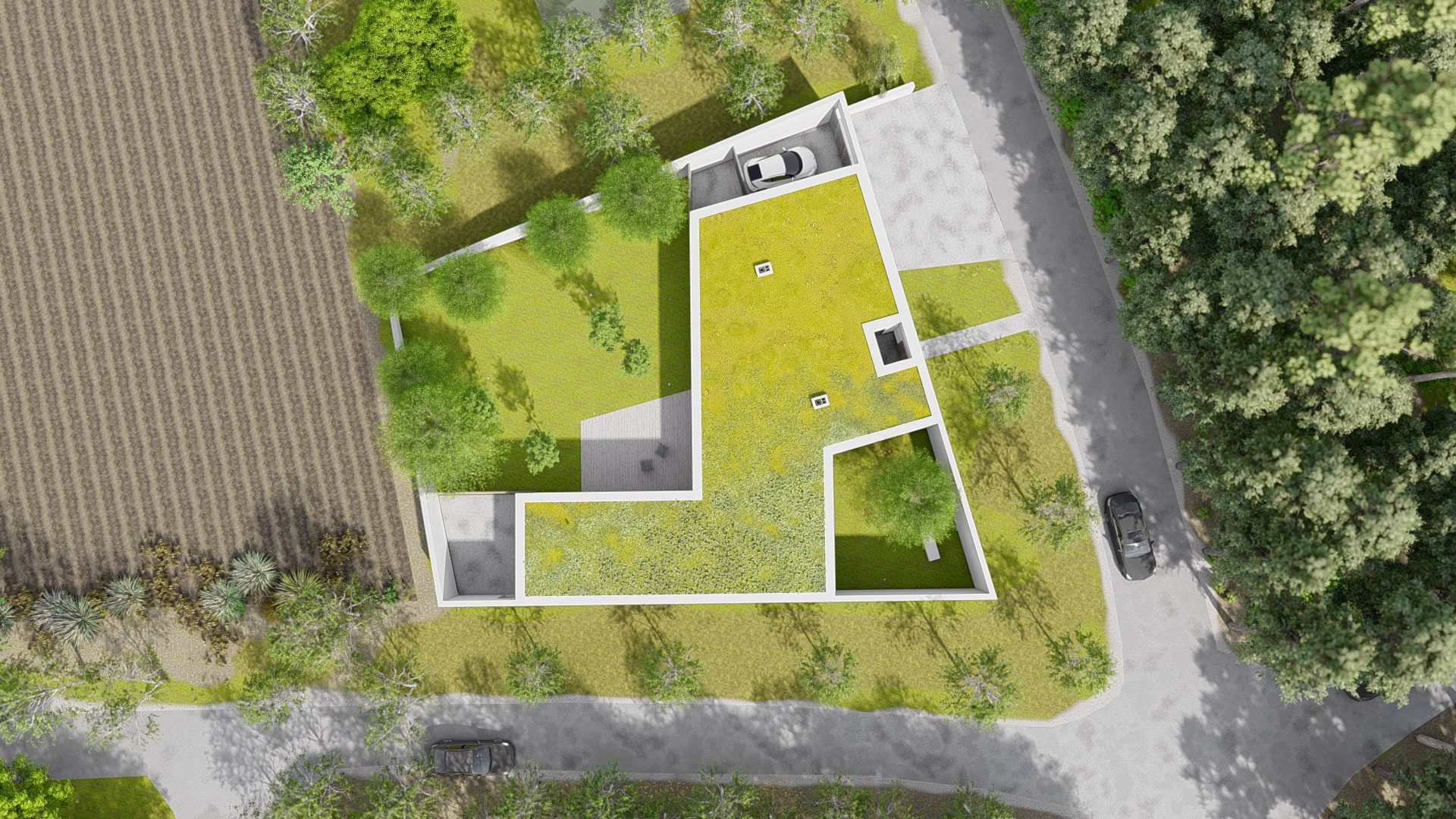 Budynek pokryty jest dachem zielonym. Oprócz niewątpliwych korzyści dla mikroklimatu wnętrza ma to znaczenie dla krajobrazu. Dom widziany z dalekich wysokich perspektyw wtapiać się będzie w otoczenie.