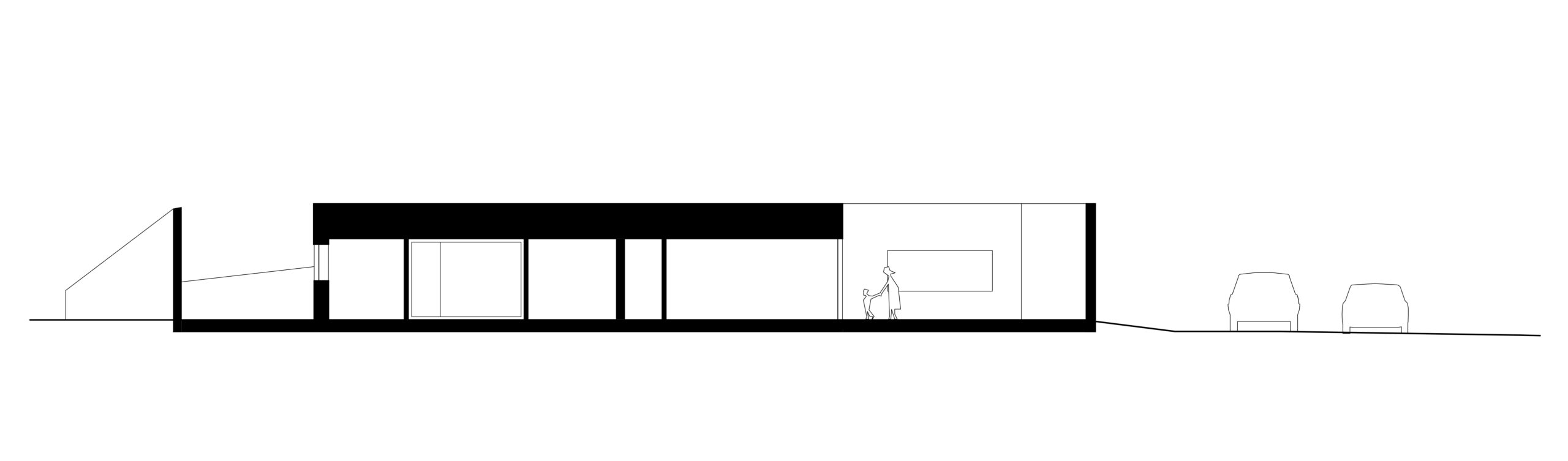 Budynek zaprojektowany został jako bariera akustyczna. Jedyne otwory, które wychodzą na drogę to wjazd do garażu, wejście do domu i okno zamykające korytarzyk przy części sypialnej. Te dwa otwory są przysłonięte drewnianymi, pionowymi szczeblinkami, które są tak zamocowane, aby światło wpadało do środka, ale wgląd z zewnątrz był niemożliwy.