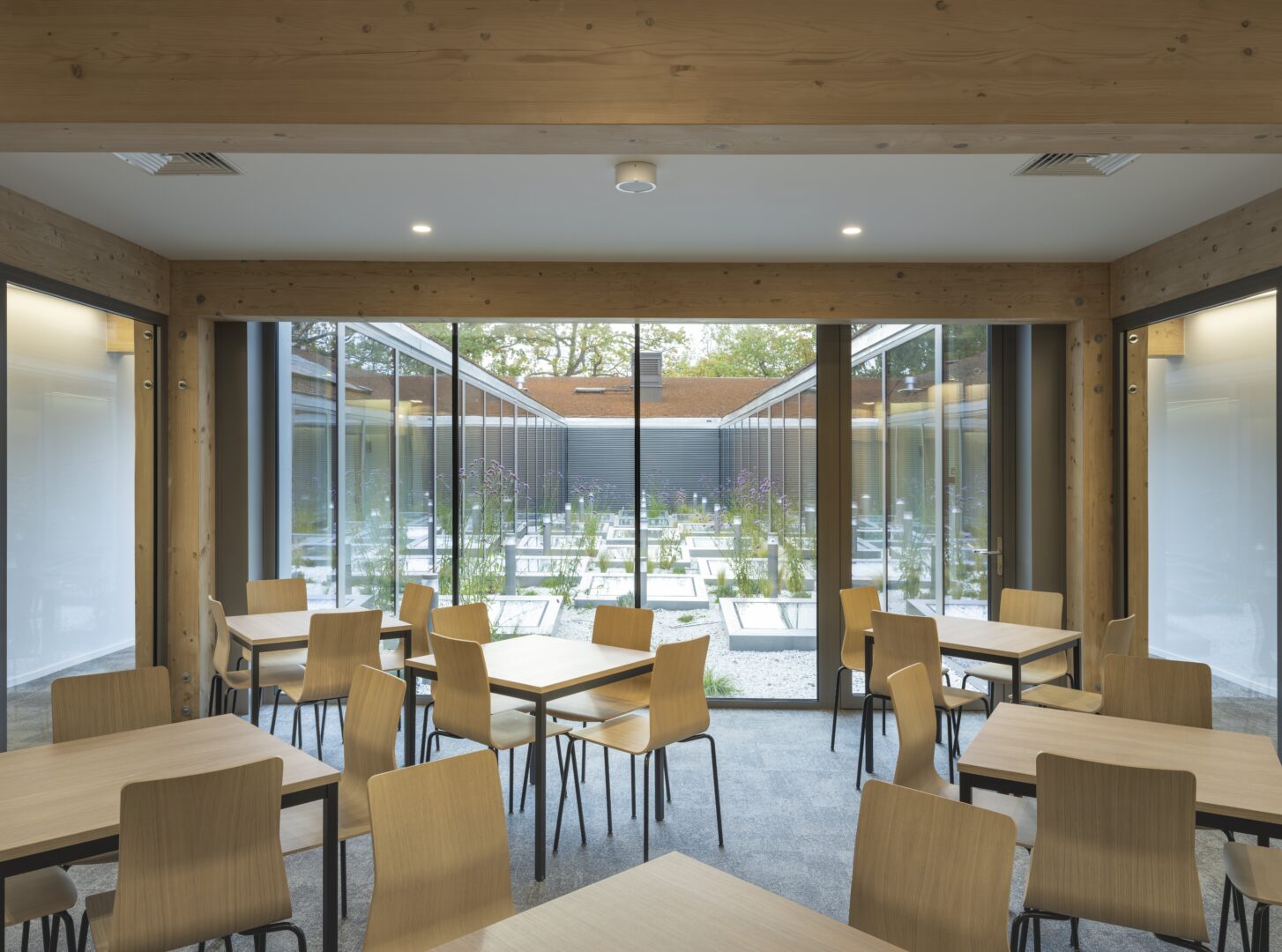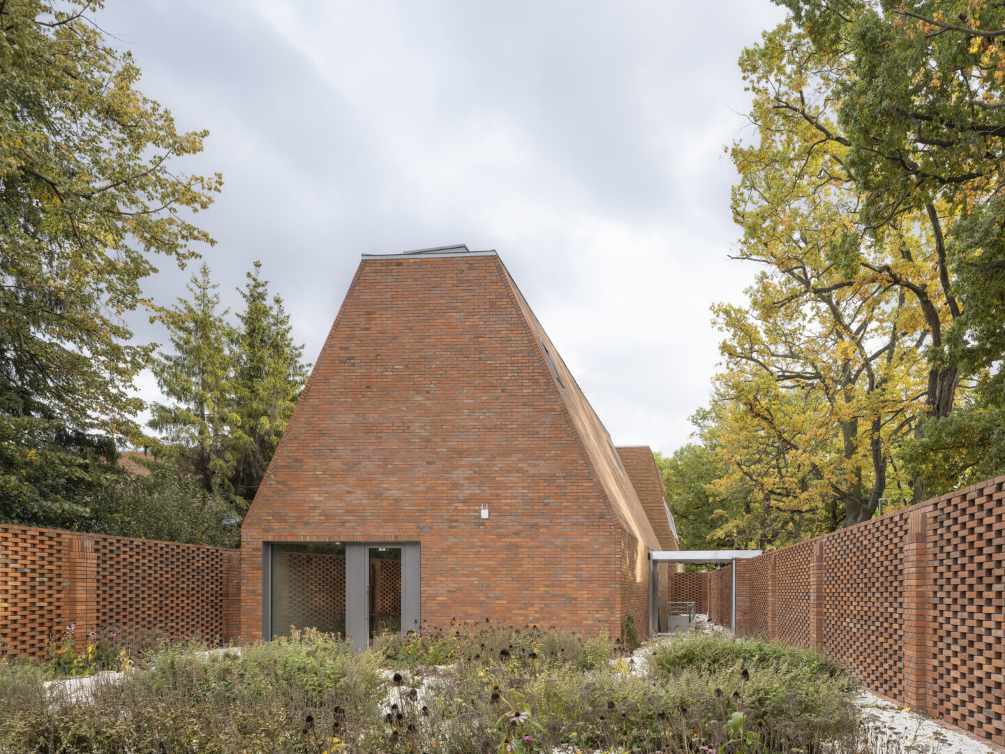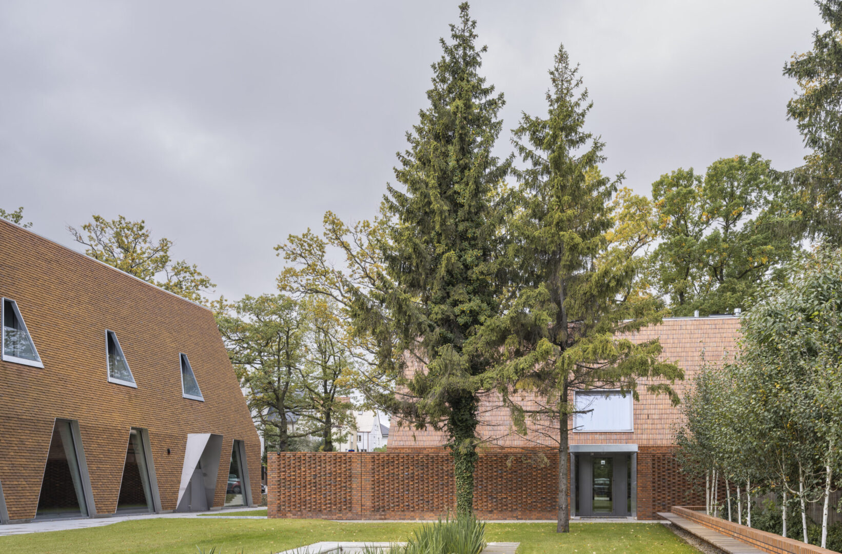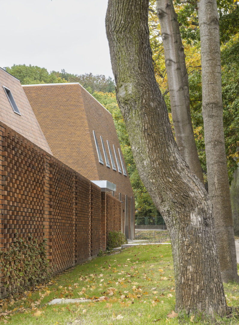 Główna bryła została zaprojektowana jako wolnostojący, osiowy i symetryczny obiekt utrzymany w charakterze pawilonu zatopionego w zieleni parkowej. W budynku mieści się większość programu Ośrodka w tym parking na 53 samochody, pomieszczenia techniczne i część sanitariatów w części podziemnej, strefa szkoleniowo gastronomiczna w parterze i hotel na górnej kondygnacji. Program fitness zrealizowany został w oddzielnym pawilonie położonym w części działki objętej planem i posadowiony na linii historycznego podziału nieruchomości. Ażurowy mur z cegły, który otacza ceglany pawilonik wydziela intymny żwirowo – skalny ogród umieszczony w większym ogrodzie – „parku”. W dni powszednie przestrzeń ta wykorzystywana ma być do ćwiczeń na wolnym powietrzu. Możliwe jest również zamknięcie ogrodu skalnego podczas organizacji spotkań plenerowych. Pozostała część działki może pozostać wtedy nadal ogólnodostępna.