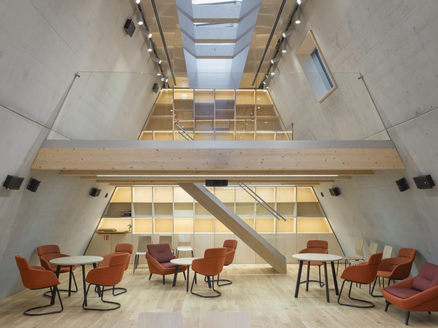 Naturalną konsekwencją zastosowania konstrukcji zespolonej przekrycia i kształtu przeszkleń na parterze jest wykonanie ścian parteru w technologii betonu architektonicznego. Powierzchnię betonową zastosowano również na posadzkach parteru i na tarasach zewnętrznych. Akustyczne mobilne ścianki działowe oraz większość elementów stałego wyposażenia wnętrz (np. lada recepcji) zostały zaprojektowane z jasnego drewna np. brzozy. Szyny do przesuwania ścianek działowych zamocowane są do dolnych pasów kratownic.