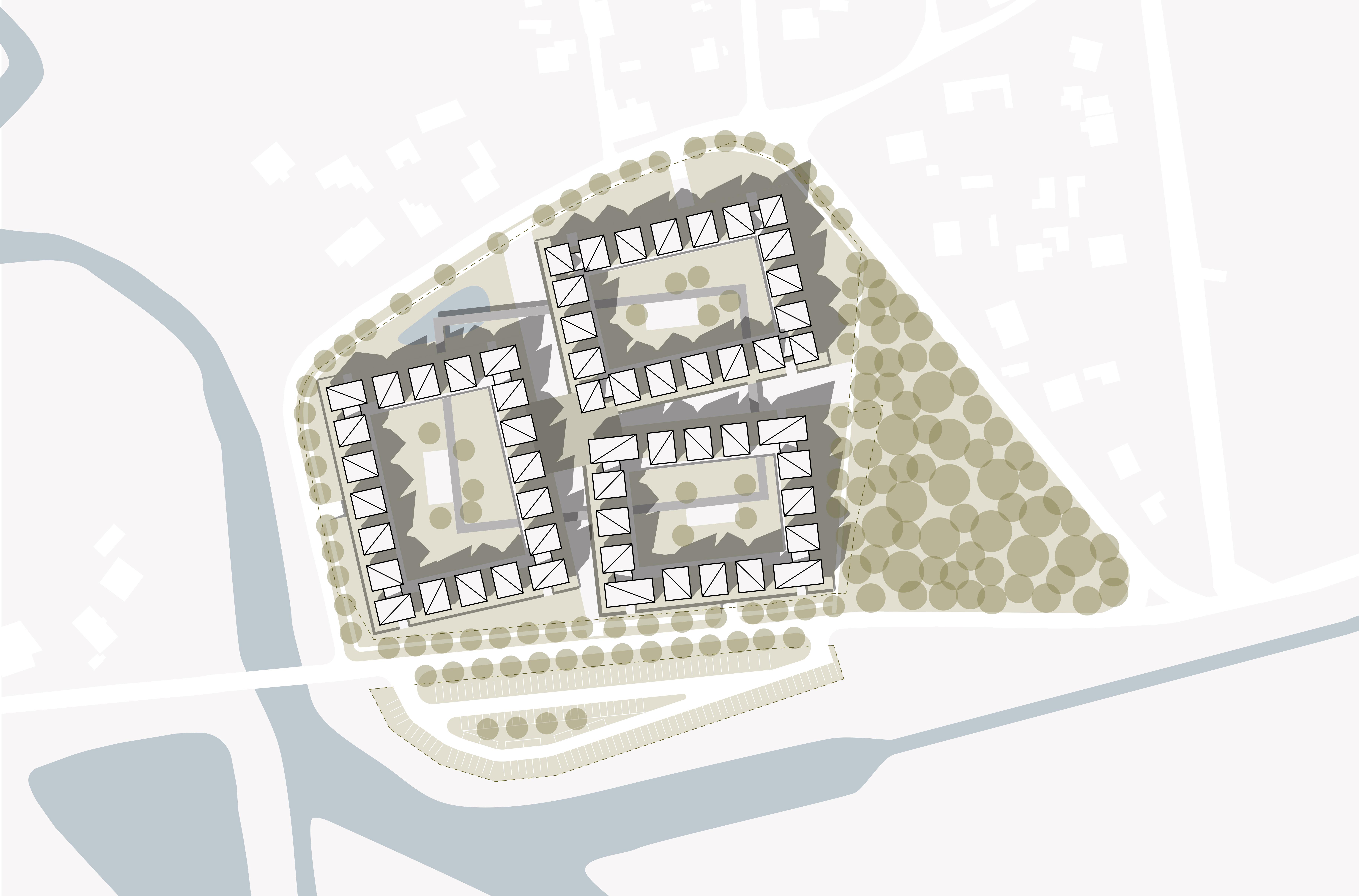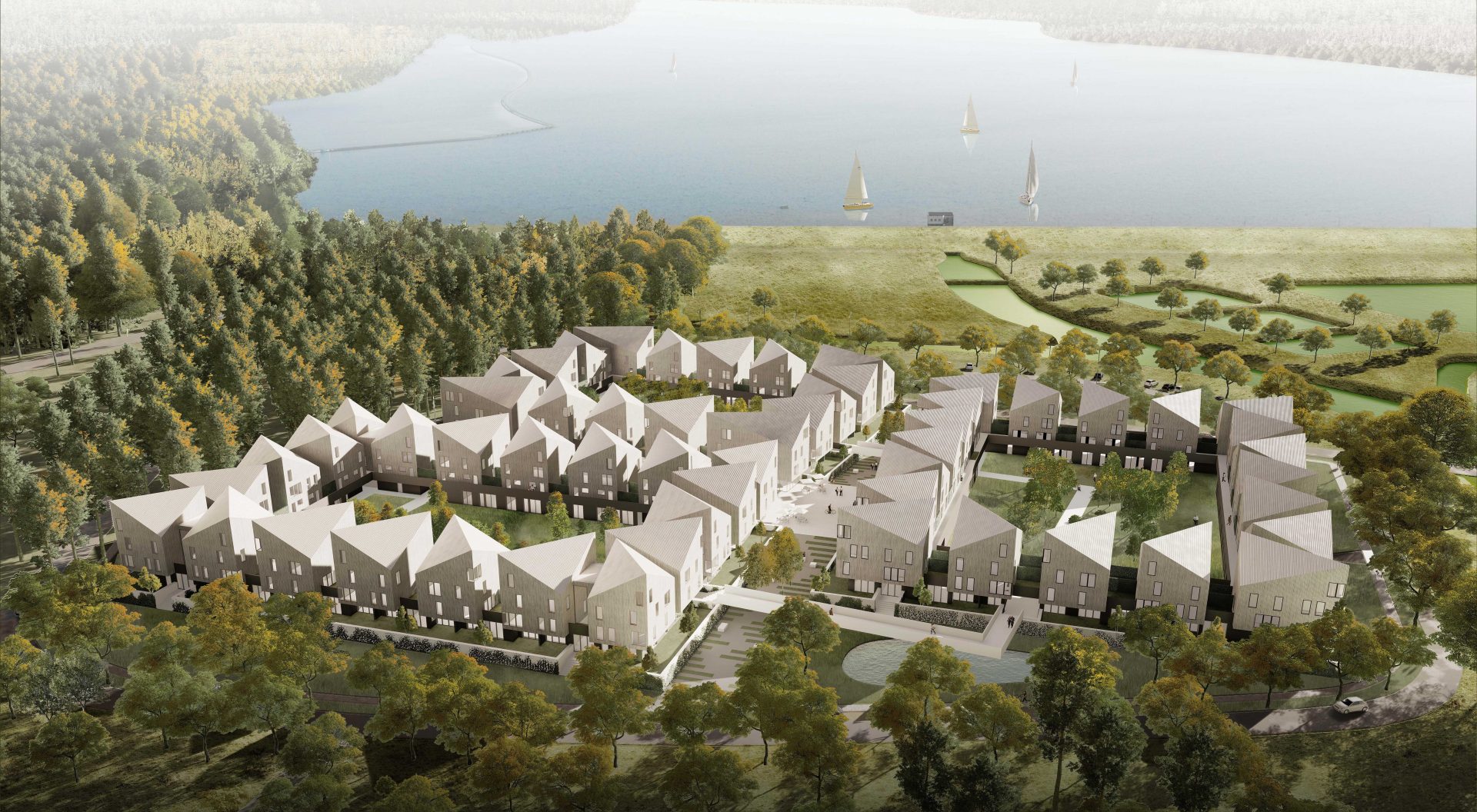 Proponowana koncepcja jest odpowiedzią na potrzeby nowoczesnej, aktywnej osoby – łącząc zalety mieszkania poza miastem, atrakcyjne tereny zielone w bezpośrednim sąsiedztwie jeziora, rzeki, rozległych obszarów leśnych i różnorodnych możliwości uprawiania sportu. Mieszkania ulokowane są w budynku wielorodzinnym, w którym administrator jest zobowiązany dbać o środowisko i stan techniczny budynku. Większe centrum populacji gwarantuje również opłacalność podstawowych usług. Osiedle składa się z trzech prostokątnych kwartałów utrzymanych w skali pobliskich domów jednorodzinnych. Każde z 200 mieszkań ma niezależny, kameralny mini-ogród, którego utrzymanie nie wymaga znacznej pracy.