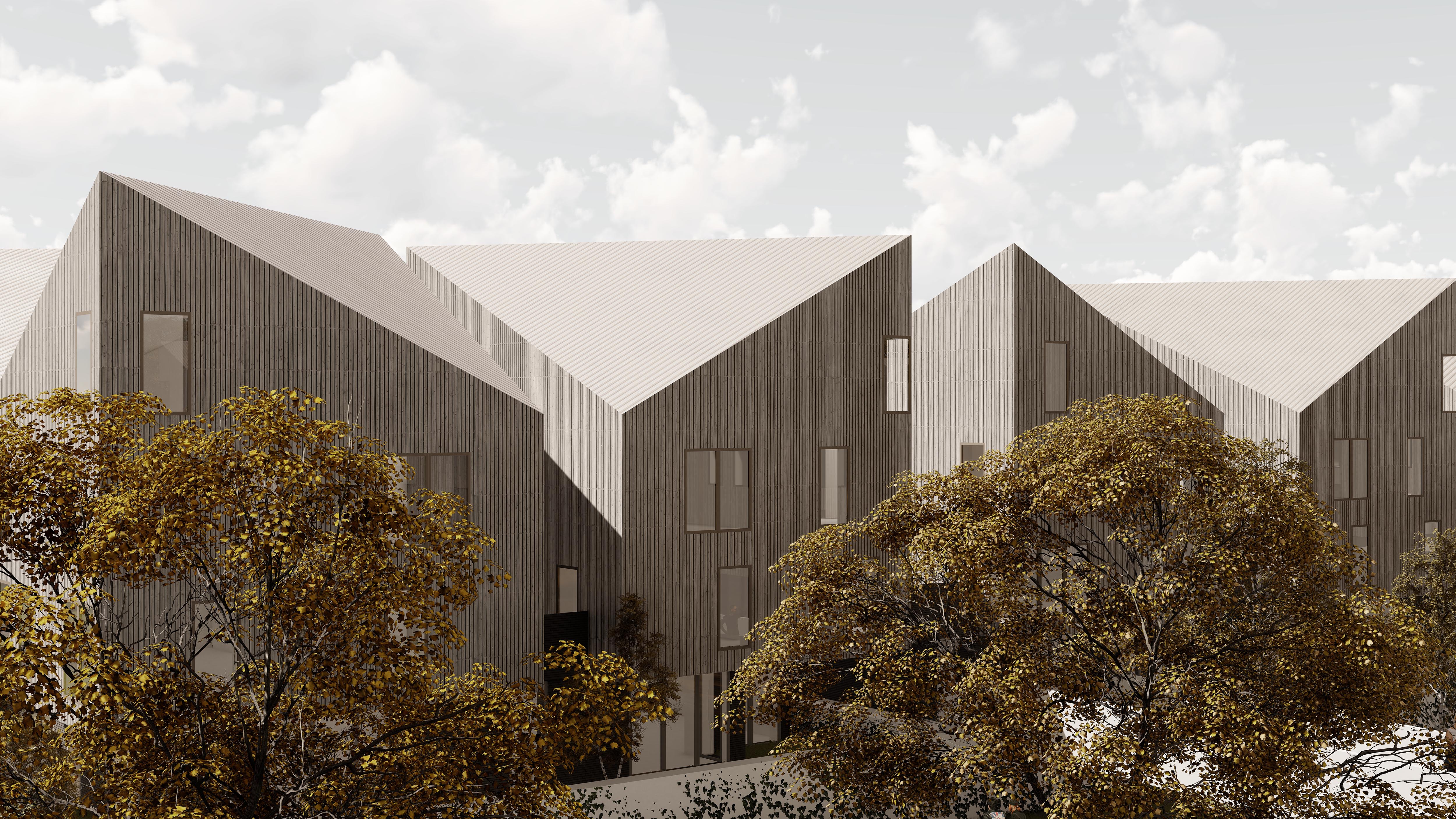 Pomiędzy krytymi asymetrycznym, skośnym dachem bryłami zaprojektowano rozległe taraso-ogródki dostępne bezpośrednio z mieszkań na położonych na wyższych kondygnacjach.