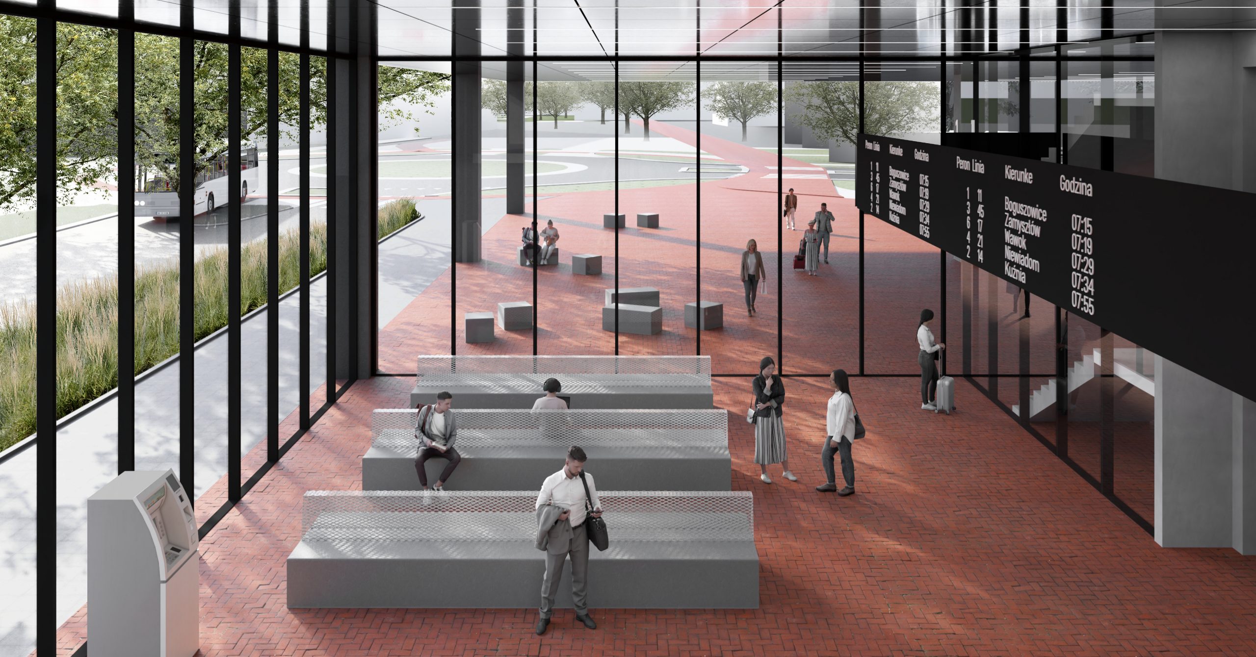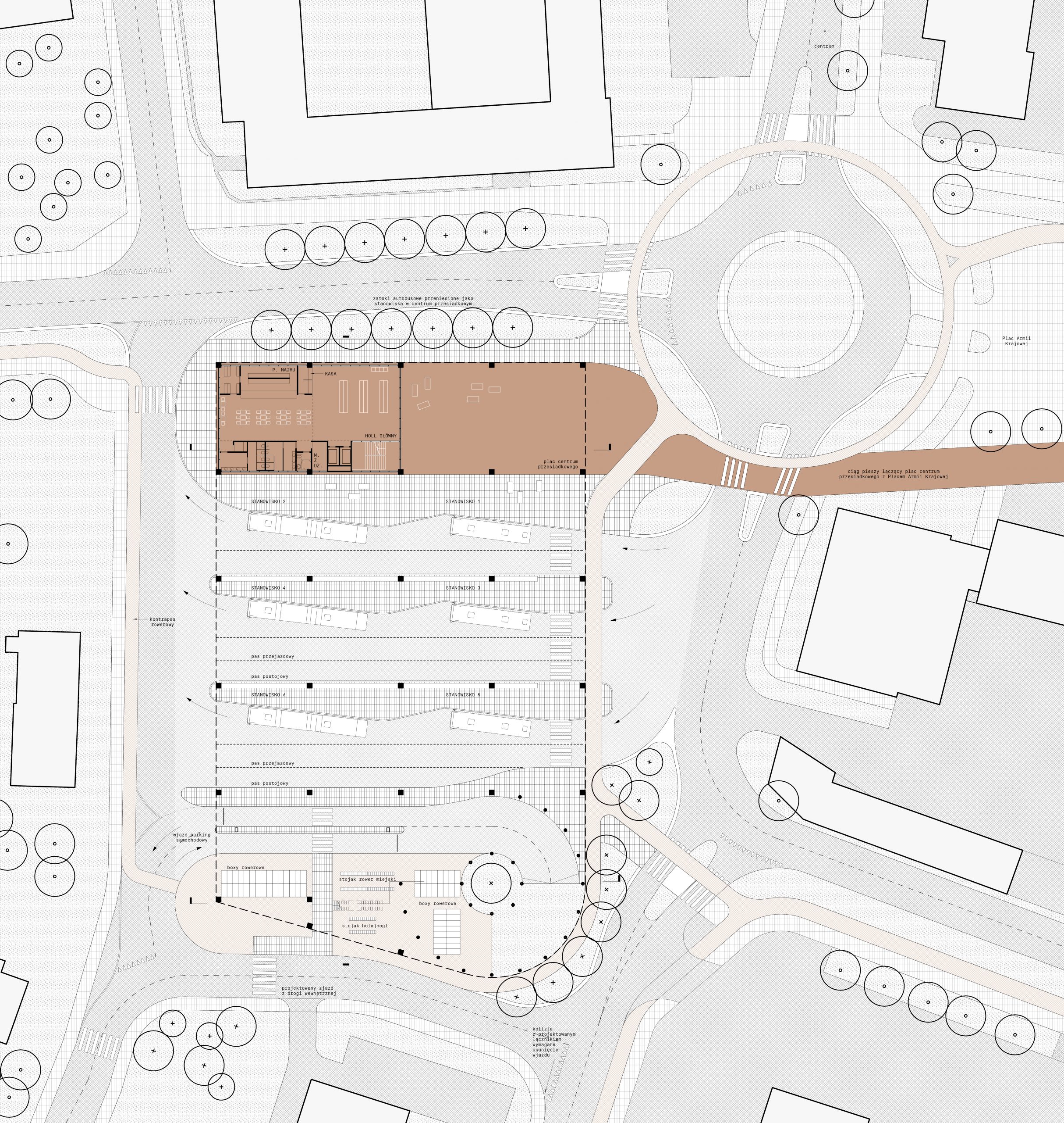 W perspektywie planowanego zamknięcia placu Armii Krajowej dla ruchu samochodowego i przekształcenia go w plac centralny tworzącego się nowego centrum administracyjno – usługowego oraz w nawiązaniu do najważniejszych ciągów komunikacji pieszej zaproponowano usytuowanie placu wejściowego w północno – wschodnim narożniku budynku. Ceglana posadzka przeszklonego holu przechodzi w nawierzchnię placu pod podcieniem i jest płynnie kontynuowana w ciągu prowadzącym do dworca PKP. Zwrócenie się budynku w kierunku placu Armii Krajowej nie eliminuje jego kontaktu z ulicą Reymonta. Całkowite podcięcie północno – wschodniego narożnika i przeszklenie północno – zachodniego powodują otwarcie widoku na perony niemal ze wszystkich stron. Piesi podążający z różnych kierunków z daleka uzyskują informację o tym, czy na przystanku znajduje się autobus linii, z której zamierzają skorzystać. Z placu – podcienia można przejść na poszczególne stanowiska, bez potrzeby przechodzenia przez hol główny.