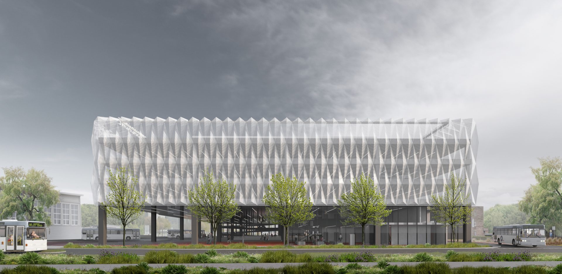 Półprzezroczysta bryła parkingu wydaje się być zawieszona sześć metrów nad peronami autobusowymi. Przez delikatną, białą siatkę w górnych partiach budowli i w jej narożnikach prześwituje niebo. Płaszczyzny paneli pokrywających elewacje nachylone są pod różnymi kątami, dlatego każda z nich inaczej odbija światło. Budynek mimo relatywnie dużej kubatury wydaje się lekki, niemal zwiewny jak obłok. Wrażenie to potęguje lustrzany sufit, w którym odbija się jasna posadzka hali autobusów i podpierające płytę parkingu czarne słupy. Ciemny kolor w transparentnej partii przyziemia wyraźnie odcina „lekką” górę od podłoża.