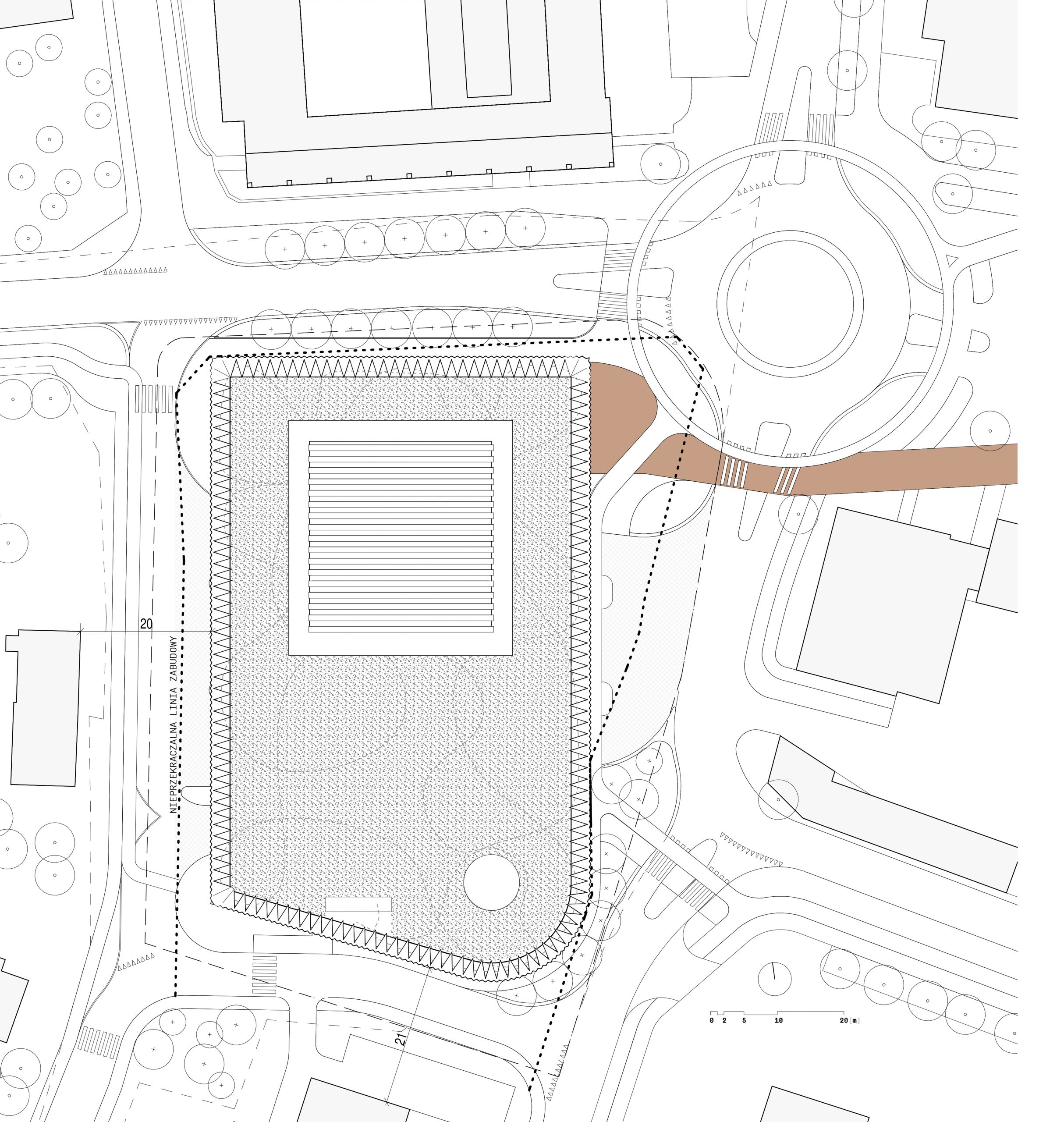 Odstępstwem od prostokątnej siatki jest okrągła rampa parkingowa. Ma ona średnicę dwóch naw w osi północ – południe i jest zlokalizowana w południowo – wschodnim narożniku. Jej usytuowanie wykorzystuje kształt działki inwestycyjnej i wydłuża najazd na rampę o połowę szerokości budynku. Przestrzeń do kolejkowania samochodów będzie wystarczająca nawet w godzinach szczytu.