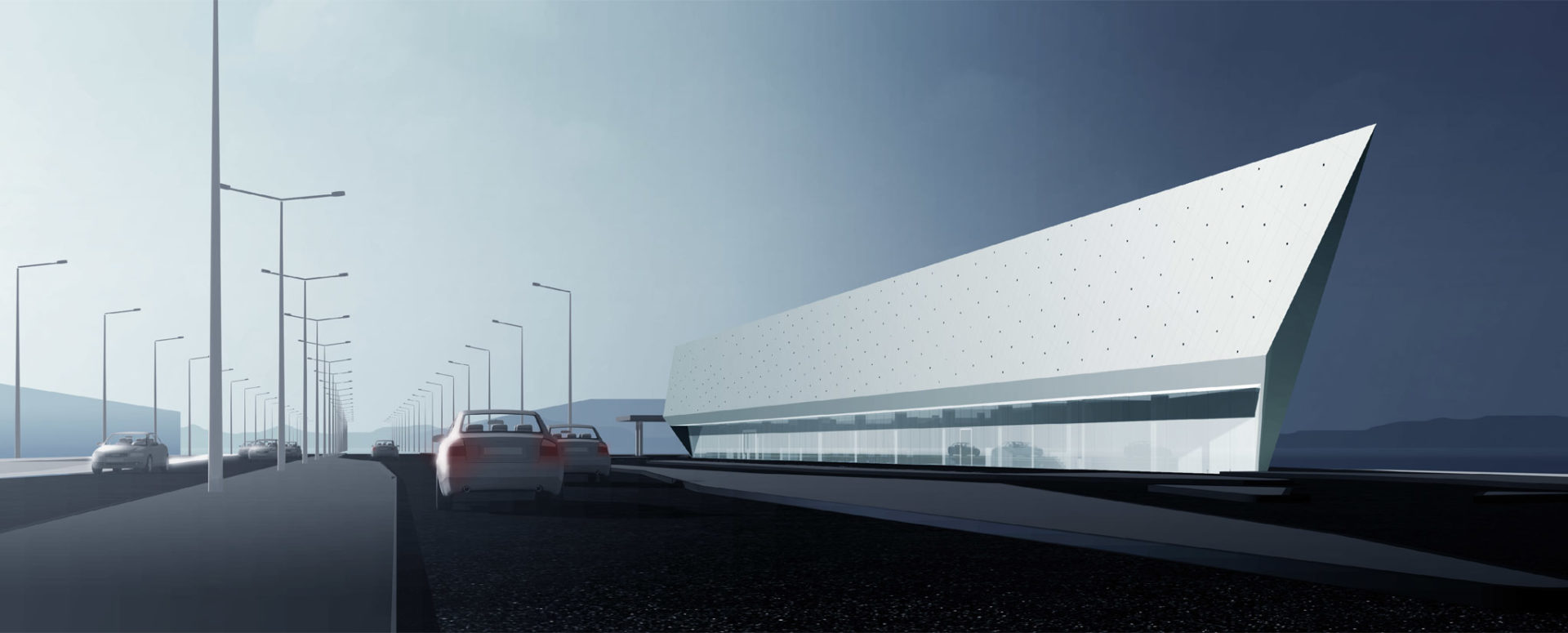 Na terenie stacji paliw znajdować się będą 2 wysepki z dystrybutorami dwustronnymi, w tym 1 z LPG oraz1 dystrybutor przystosowany do obsługi samochodów ciężarowych. Zaprojektowano także budynek obsługi stacji z kasami, sklepem i zapleczem dla obsługi oraz myjnię bezdotykowa przylegającą do budynku.W projekcie przedstawiono 2 warianty budynku obsługi stacji, różniące się powierzchnią pomieszczenia obsługi klienta. Na parterze będzie znajdować się hall wejściowy z recepcją, bar i restauracja wraz zapleczem, sala wielofunkcyjna,pomieszczenia administracji, pralnia i toalety ogólnodostępne. Hall, bar, restauracja i sala wielofunkcyjna otwierają się na niezadaszone, zielone atrium. Na 2 kolejnych kondygnacjach projektuje się pokoje motelowe (razem 33 pokoje 2-osób z łazienkami).