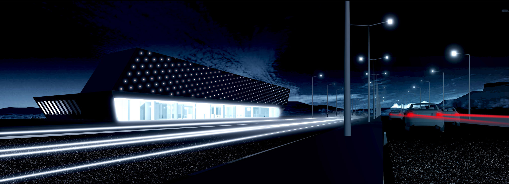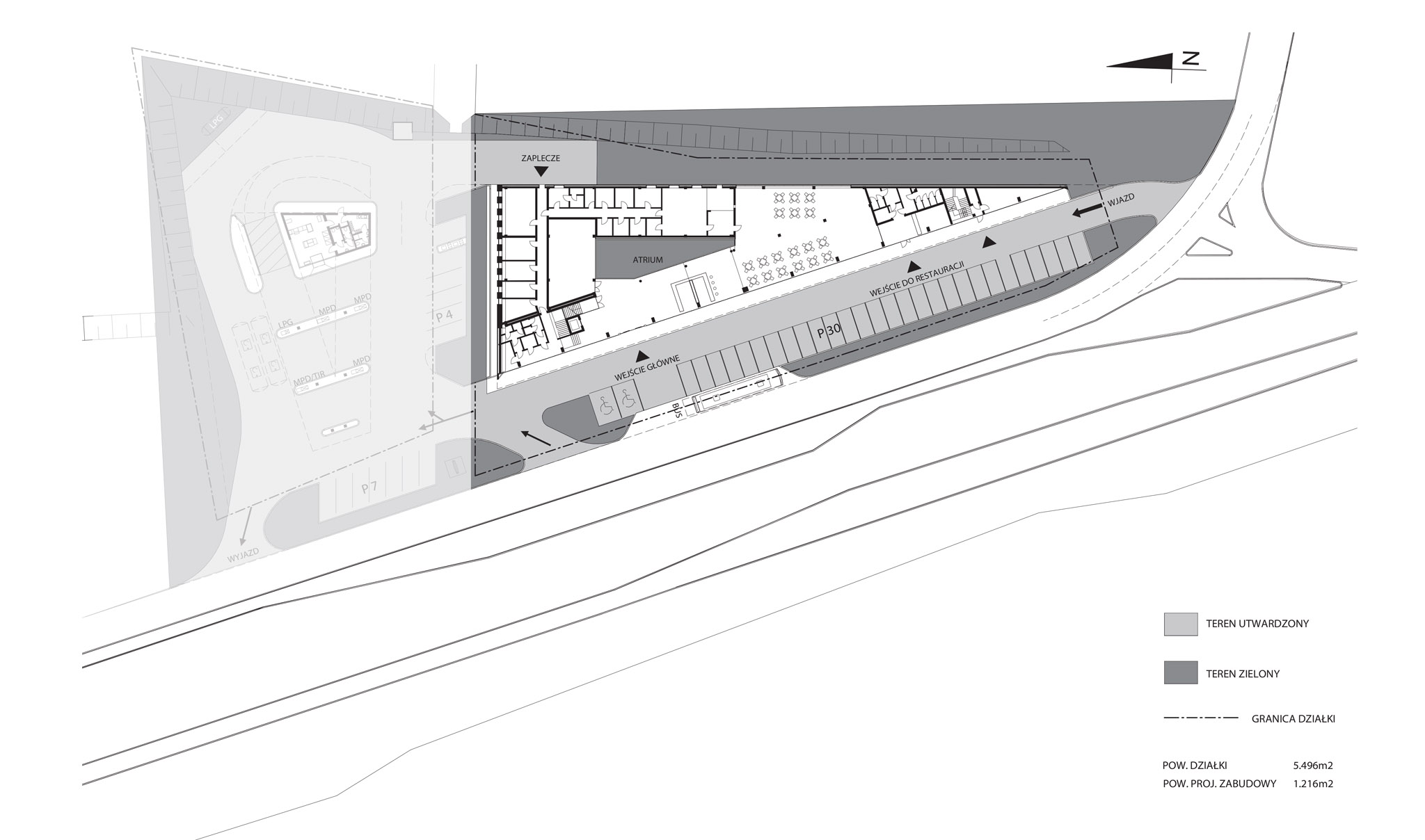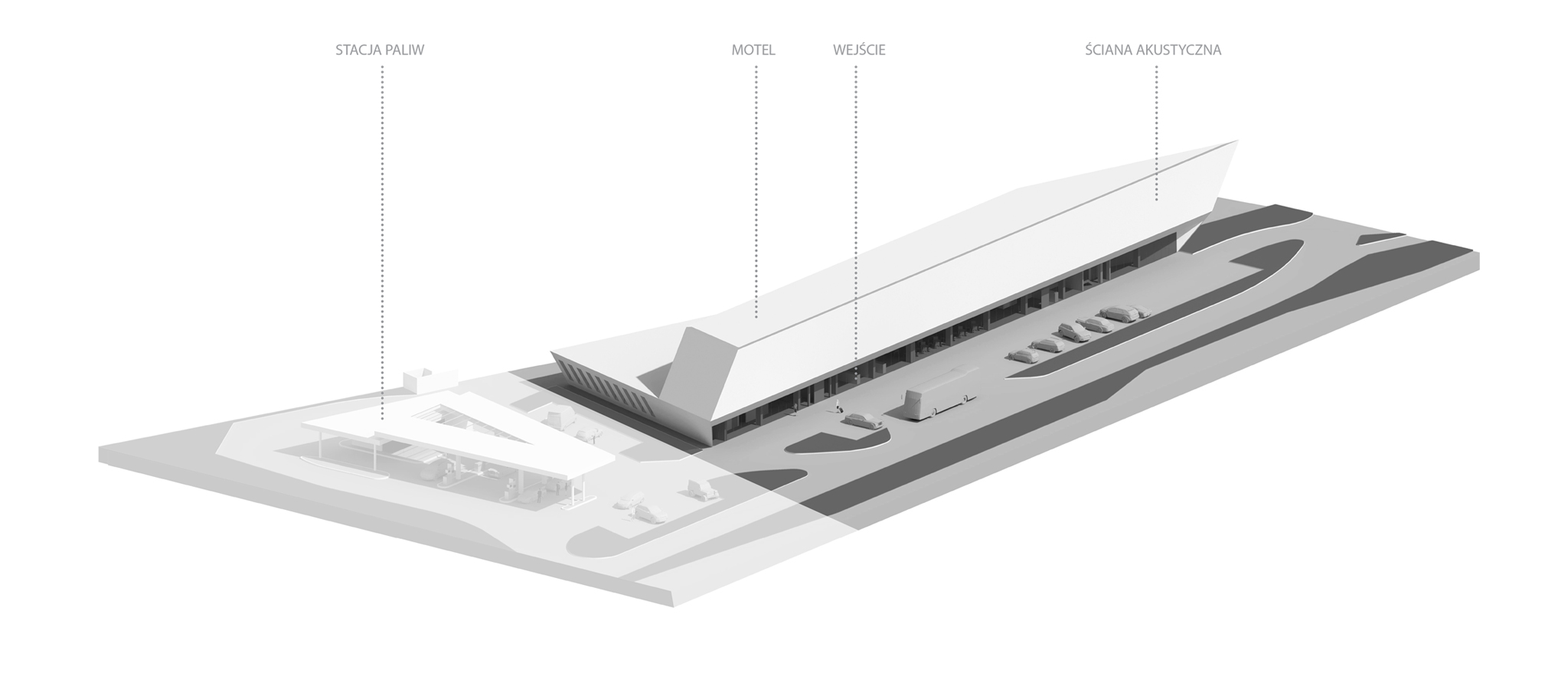Na terenie stacji paliw znajdować się będą 2 wysepki z dystrybutorami dwustronnymi, w tym 1 z LPG oraz1 dystrybutor przystosowany do obsługi samochodów ciężarowych. Zaprojektowano także budynek obsługi stacji z kasami, sklepem i zapleczem dla obsługi oraz myjnię bezdotykowa przylegającą do budynku.W projekcie przedstawiono 2 warianty budynku obsługi stacji, różniące się powierzchnią pomieszczenia obsługi klienta. Na parterze będzie znajdować się hall wejściowy z recepcją, bar i restauracja wraz zapleczem, sala wielofunkcyjna,pomieszczenia administracji, pralnia i toalety ogólnodostępne. Hall, bar, restauracja i sala wielofunkcyjna otwierają się na niezadaszone, zielone atrium. Na 2 kolejnych kondygnacjach projektuje się pokoje motelowe (razem 33 pokoje 2-osób z łazienkami).