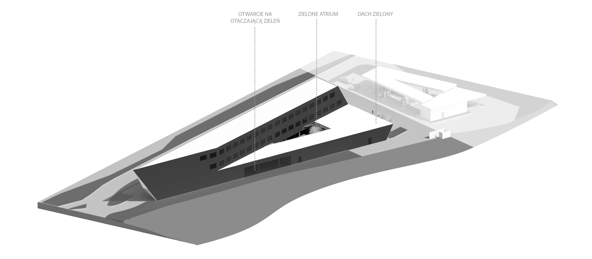 Na parterze będzie znajdować się hall wejściowy z recepcją, bar i restauracja wraz zapleczem, sala wielofunkcyjna, pomieszczenia administracji, pralnia i toalety ogólnodostępne. Hall, bar, restauracja i sala wielofunkcyjna otwierają się na niezadaszone, zielone atrium. Na 2 kolejnych kondygnacjach projektuje się pokoje motelowe (razem 33 pokoje 2-osób z łazienkami).