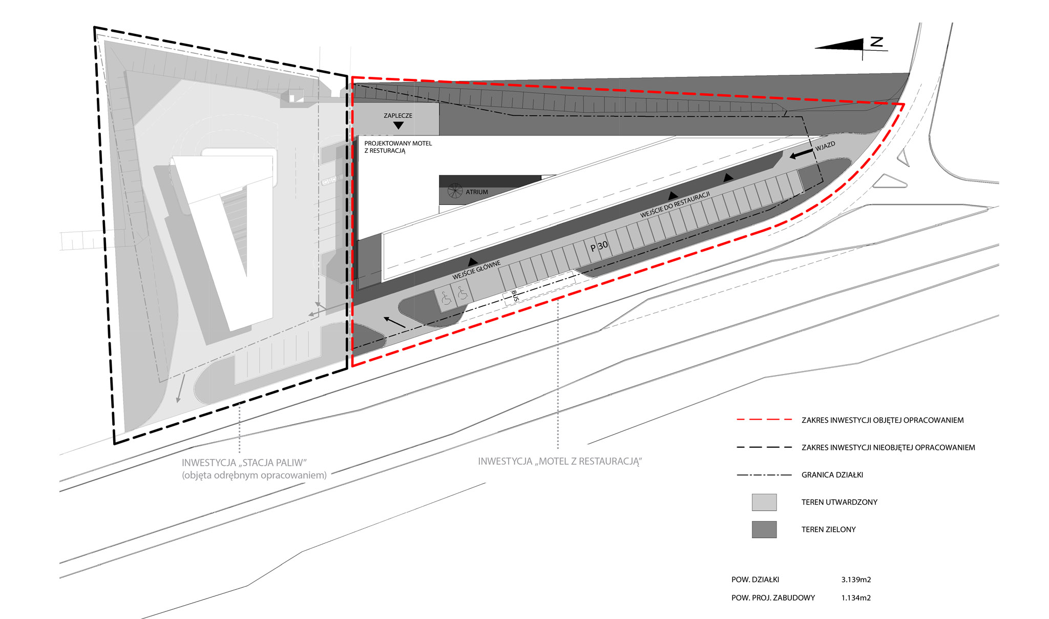 Projektowany motel z restauracją wraz z planowaną na działce od strony północnej stacją paliw stanowią Kompleks Obsługi Podróżnych i objęte są wspólnym projektem zagospodarowania terenu. Budynek motelu został zlokalizowany w centralnej części działki. Część motelowa budynku jest 3-kondygnacyjna, pozostała część – parterowa. Zaprojektowano 2 wjazdy na działkę od drogi stanowiącej zjazd z ul. Kościuszki, jeden w południowym krańcu działki, drugi – przy północnym. Wzdłuż granicy zachodniej projektuje się strefę parkingową, przewiduje się 30 miejsc postojowych, w tym 2 dla osób niepełnosprawnych. Przewidziano także stanowisko postojowe dla autokaru wzdłuż parkingu od strony drogi. Zaprojektowano 2 wejścia do budynku od strony parkingu, 1 wejście od strony wschodniej dla pracowników i dostaw. Tereny projektowanego motelu i sąsiedniej stacji paliw zostaną połączone poprzez zabudowany ciek wodny.