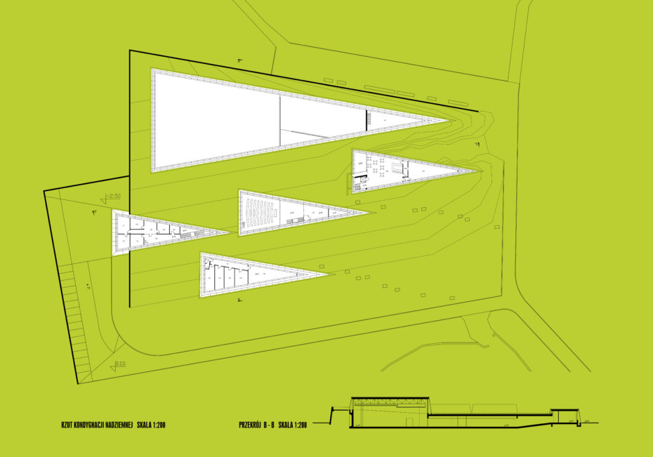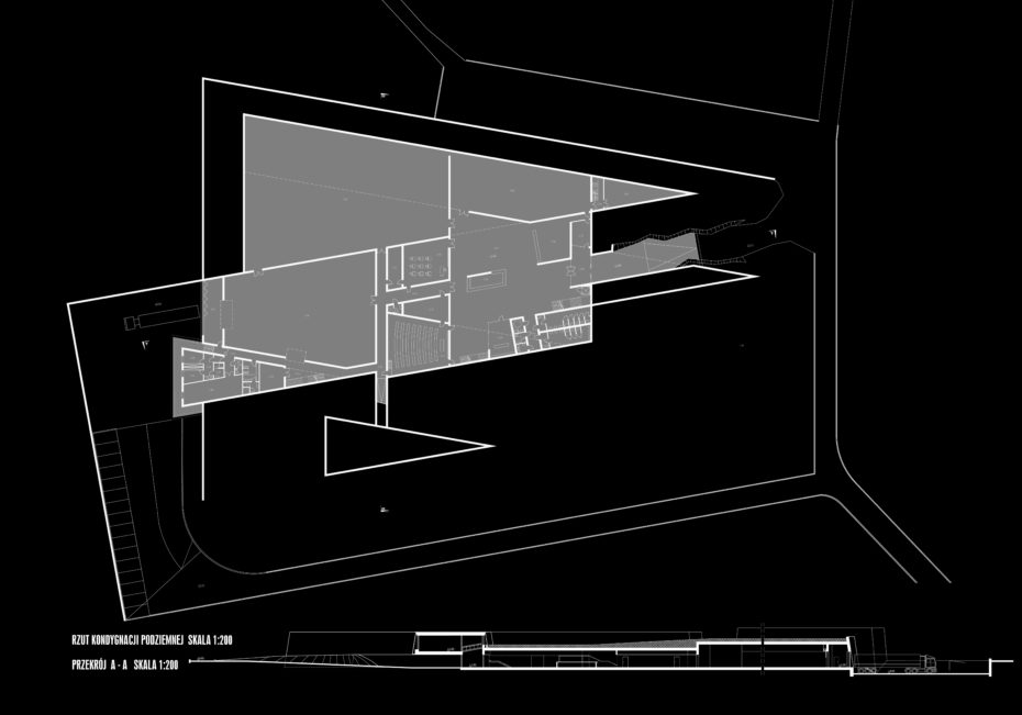 Znaki pozostawione na ścianach wyrobisk i inne świadectwa kultury materialnej pochodzące z okresu neolitu mają w sobie niezwykłą pierwotną wrażliwość. W swojej prostocie wydają się być zaskakująco współczesne w wyrazie. Koncepcja muzeum stanowi próbę przekazania tego niezwykłego napięcia. Bezpośrednią inspiracją były megalityczne zespoły budowli, jakimi były grobowce kujawskie pochodzące z okresu eksploatacji kopalni neolitycznych na terenie Krzemionek. Założenia te są w krajobrazie znakami, sygnałami ukrytej wewnątrz wartości. Takim samym znakiem ma być przedstawiona koncepcja muzeum. Funkcja ulokowana jest na 2 kondygnacjach. Z części podziemnej ponad powierzchnię gruntu wyłania się 5 brył zakomponowanych na pochyłym nasypie. Na tym poziomie mieszczą się funkcje wymagające doświetlenia, takie jak biura, pracownie archeologiczne, kawiarnia. Zasadnicza część założenia mieści się na poziomie -1.30 m, tam też znajdują się hall, sale wystawowe, edukacyjne, konferencyjne oraz archiwum.