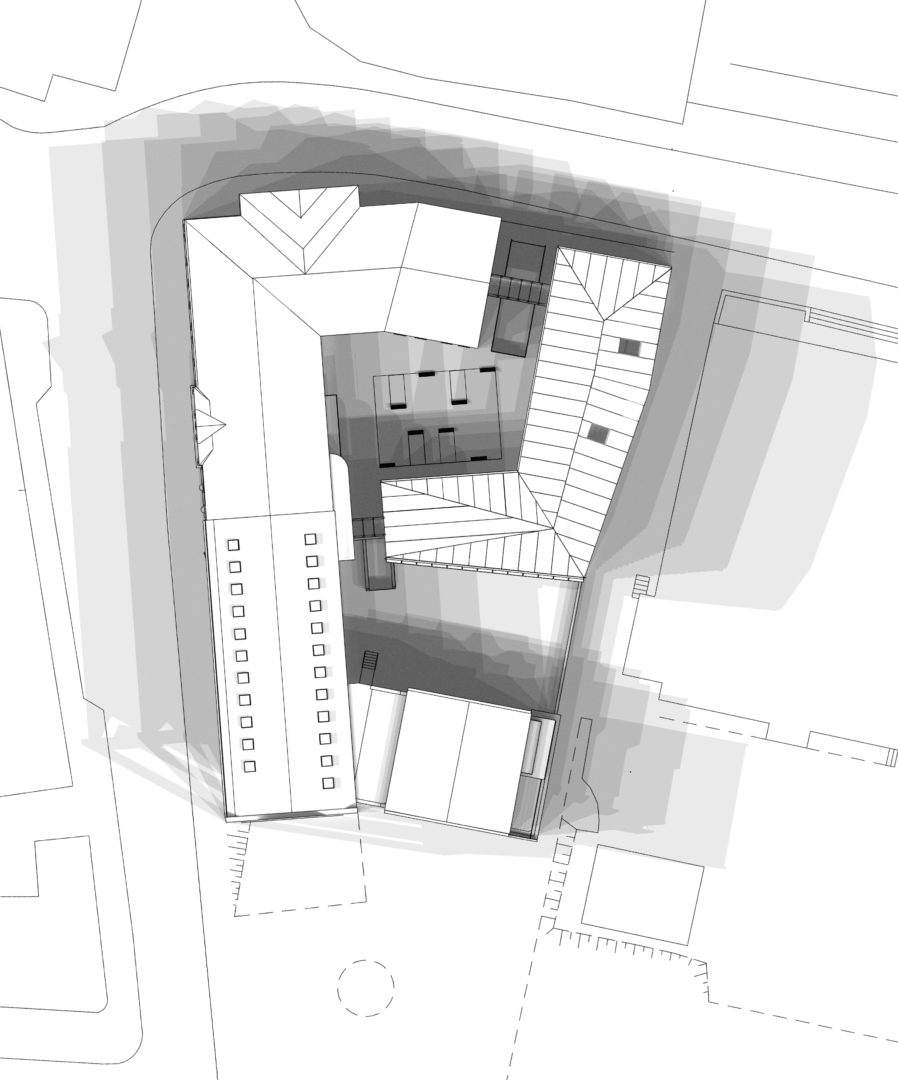 Nowy obiekt na rzucie w kształcie lustrzanego odbicia litery „L”, usytuowany w północnej części wewnętrznego dziedzińca urzędu. Nowa kubatura w połączeniu z najstarszym budynkiem istniejącym, stworzą układ zamknięty z wewnętrznym placem – dziedzińcem, stanowiącym miejsce relaksu i odpoczynku dla petentów jak również przechodniów.