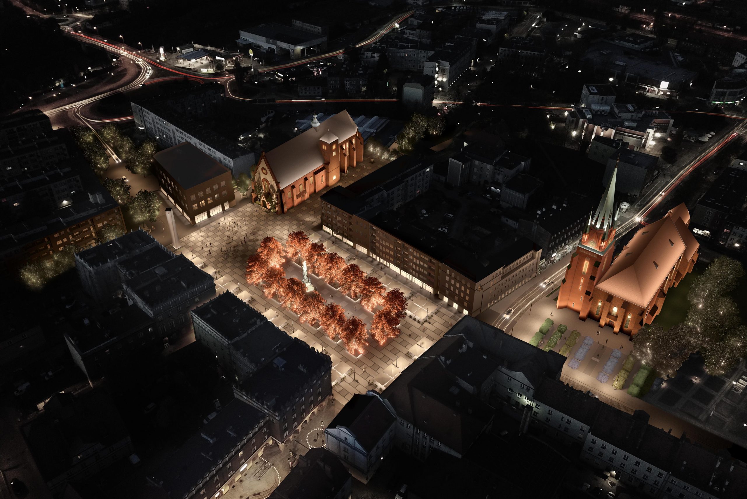 Dwa gotyckie kościoły i utworzona z drzew „żywa katedra” stanowią główną ideę kompozycyjną raciborskiego rynku.