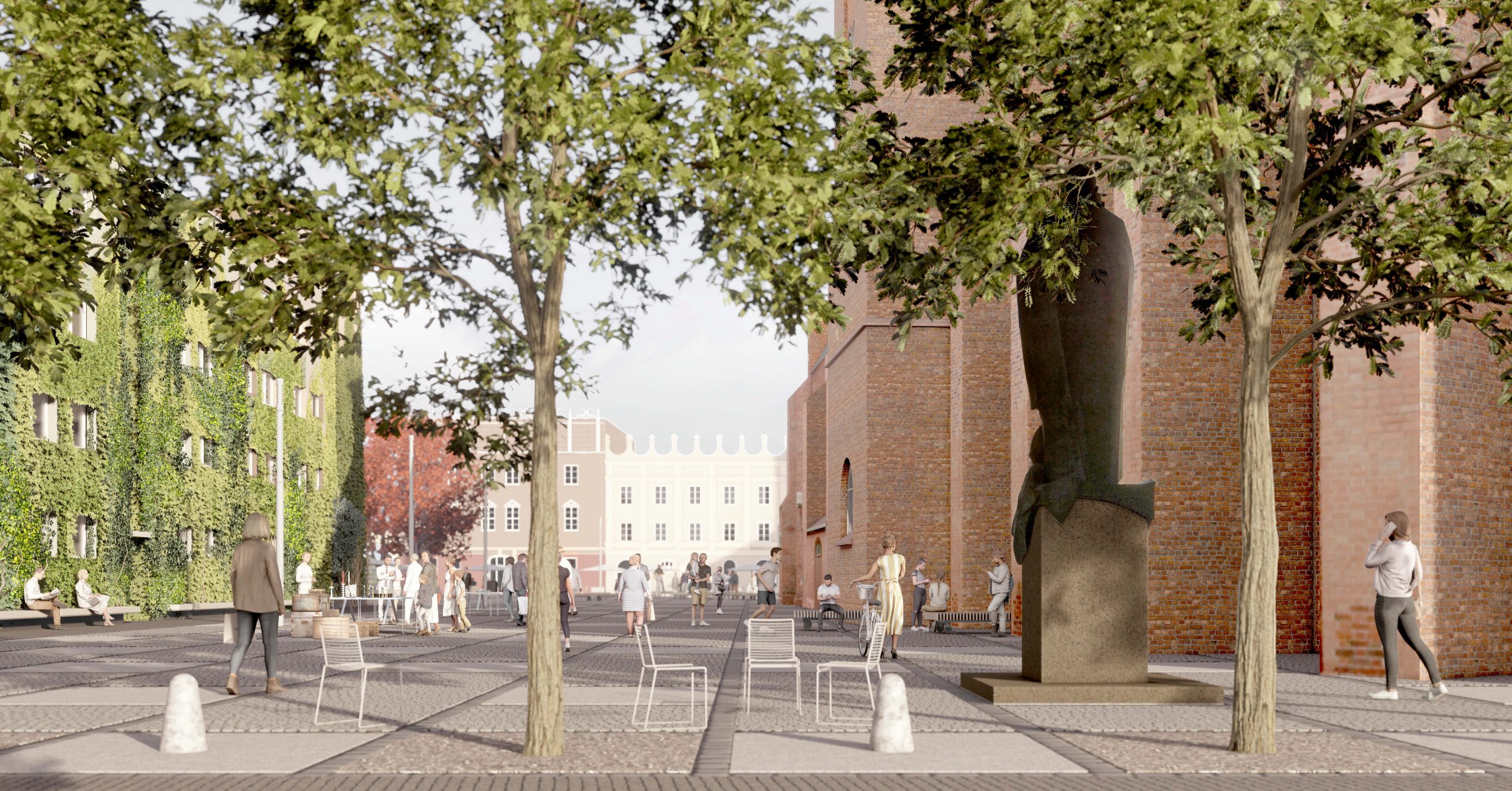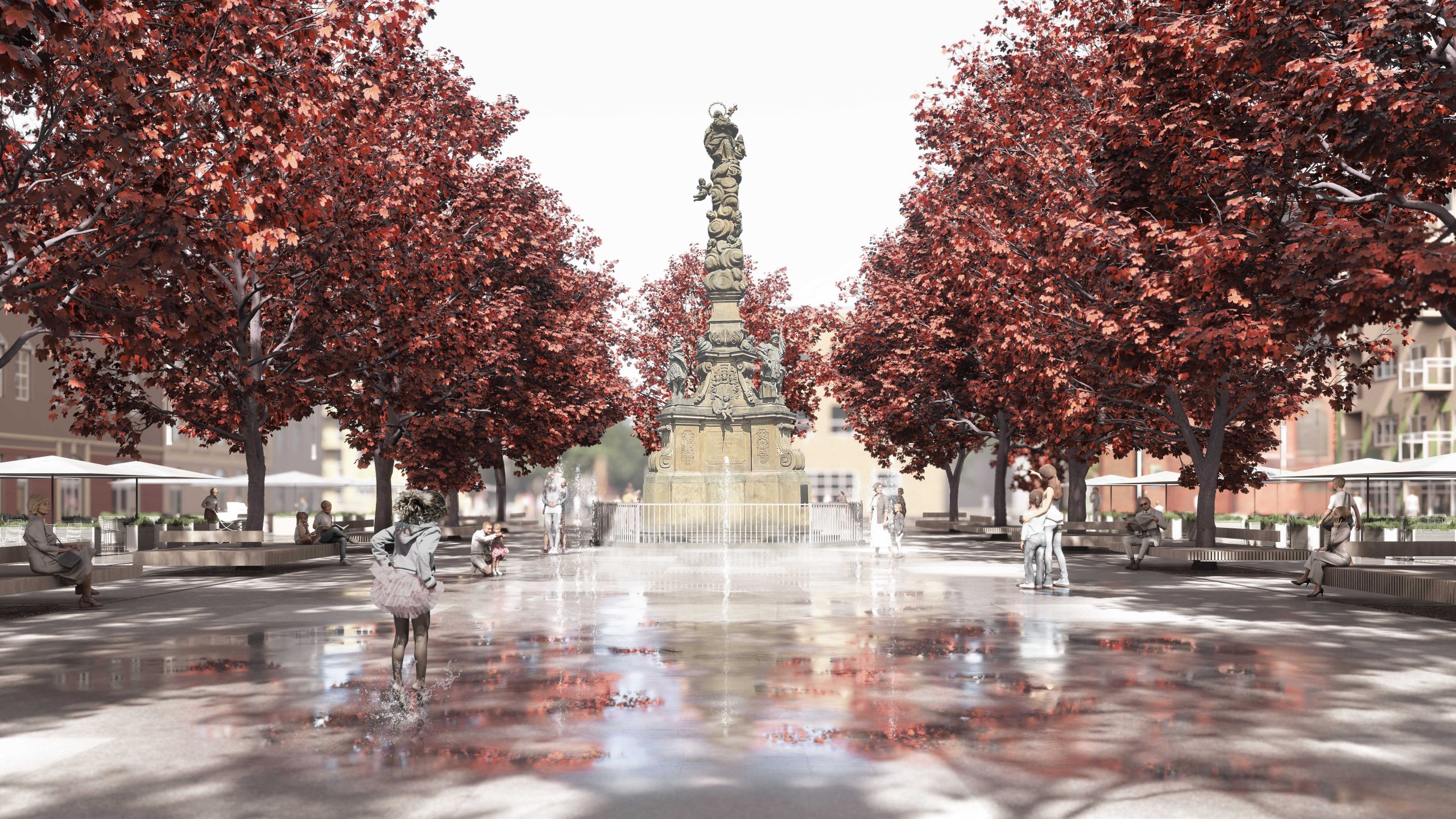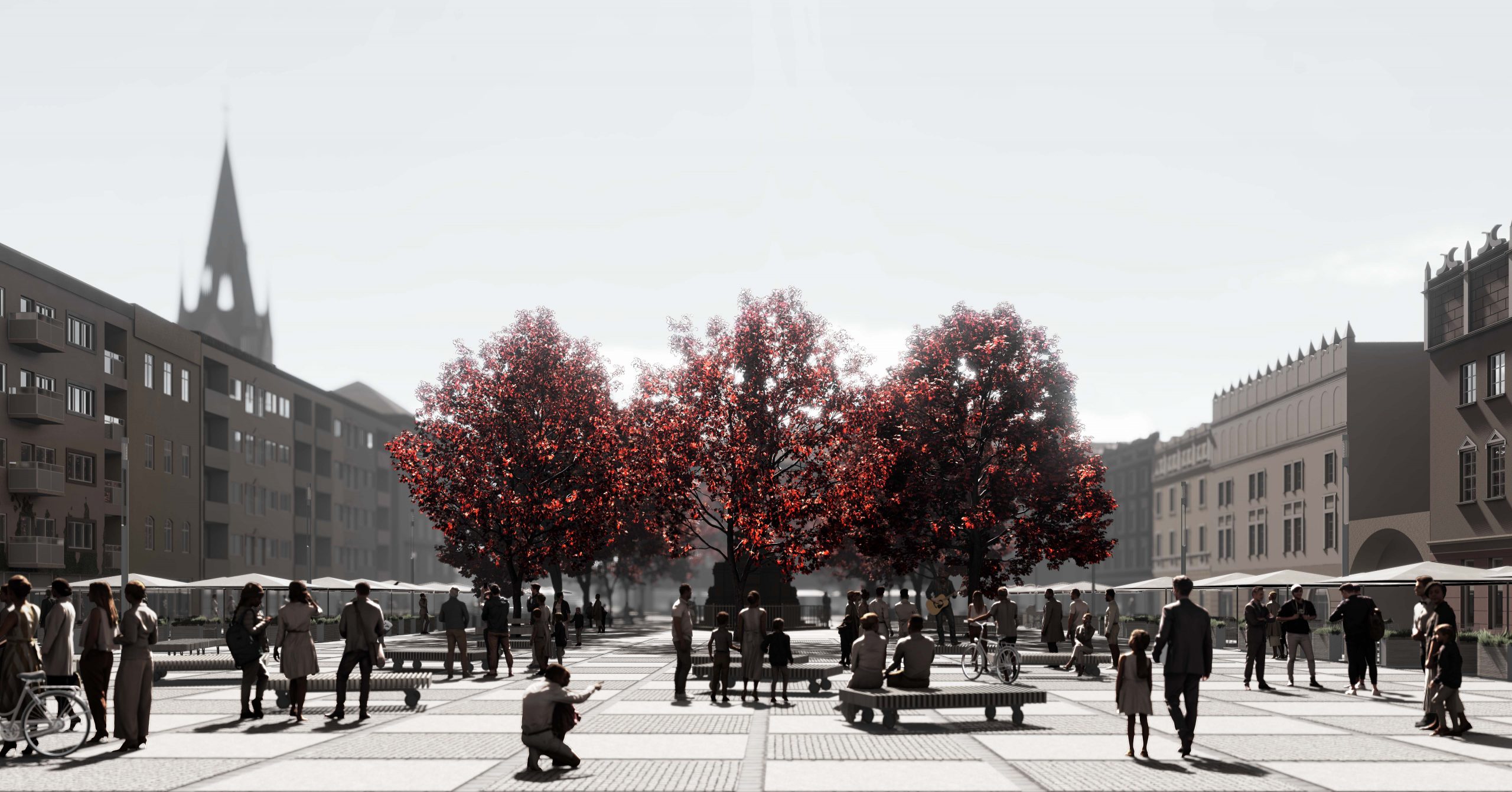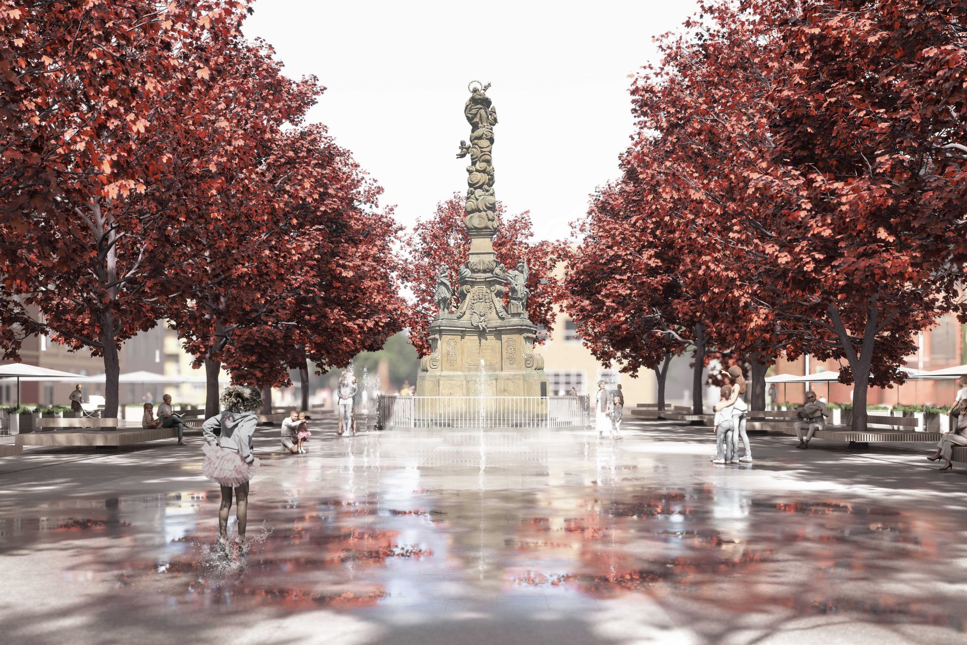 Najistotniejszą decyzją zmierzającą do przełamania pustki Rynku jest wprowadzenie szpaleru docelowo pełnowymiarowych drzew wokół kolumny Najświętszej Marii Panny, fontanny (mokrego chodnika) i poidła zaprojektowanych w miejscu historycznej rorkastli. Drzewa mają stworzyć rodzaj wnętrza we wnętrzu, miejsca do wytchnienia, kontemplacji kolumny maryjnej i refleksów w wodzie rozlewającej się po posadzce. Jednocześnie będzie można stamtąd obserwować cały Rynek. Schłodzenie centralnej części płyty poprzez zacienienie i parowanie wody wywoła ruch powietrza od pierzei zacienionych do nasłonecznionych. Dzięki temu w upalne dni temperatura może obniżyć się nawet o kilka stopni w stosunku do odnotowywanej obecnie. Korony i korzenie drzew łącząc się ze sobą utworzą mały ekosystem i pozwolą na przemieszczanie się mikroorganizmów. Oczywiście będzie to możliwe jedynie kiedy drzewa osiągną odpowiednie rozmiary, dlatego nie powinno się ograniczać ich wzrostu poprzez sztuczne formowanie i już na wstępie należy nasadzić możliwie duże, co najmniej kilkunastoletnie egzemplarze. Infrastruktura podziemna będzie chroniona przed uszkodzeniem przez rozrastającą się masę korzeniową za pomocą ekranów przeciw korzennych. Baldachim koron utworzy na rynku żywą katedrę o skali nawiązującej w rzucie do obu gotyckich kościołów. Również czerwony kolor listowia klonu „Royal Red” sugerować będzie związki z przepaloną cegłą występującą w murach.