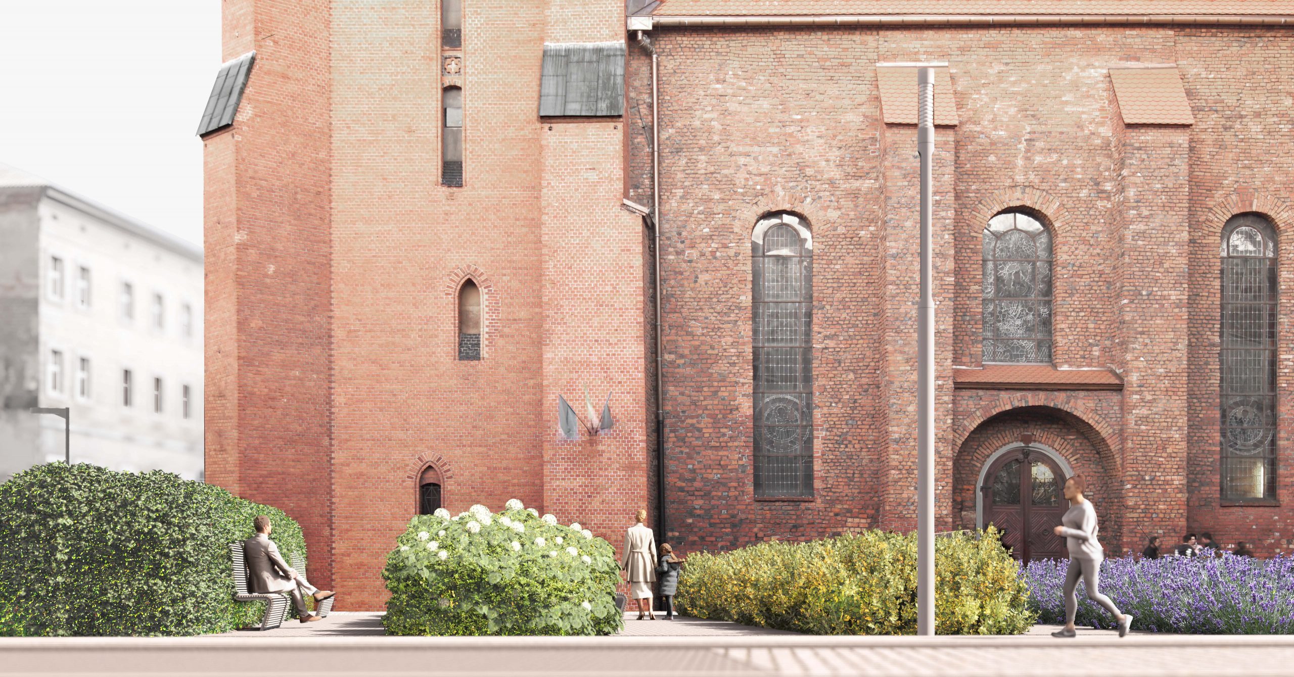 Plac przed kościołem Wniebowzięcia NMP leżący pomiędzy Rynkiem, a skwerem ks. Pieczki sam w sobie nie przyciąga spacerowiczów mimo pięknej fasady kościoła z imponującą wieżą zegarową. Zieleń, która się na nim znajduje, trudno nazwać atrakcyjną. Brak również miejsc do siedzenia. Nowa kompozycja placu w rysunku nawiązuje zarówno do podziałów na Rynku jak i na niedawno odrestaurowanym skwerze. Zastosowano zieleń okrywową i formowane krzewy w prostopadłych do fasady kościoła pasach, pomiędzy którymi zaprojektowano wygodne ławki z oparciami. Układ zieleni nie przesłania widoku na elewację kościoła farnego osobom znajdującym się na placu i przemieszczającym się wzdłuż ulicy Nowej.