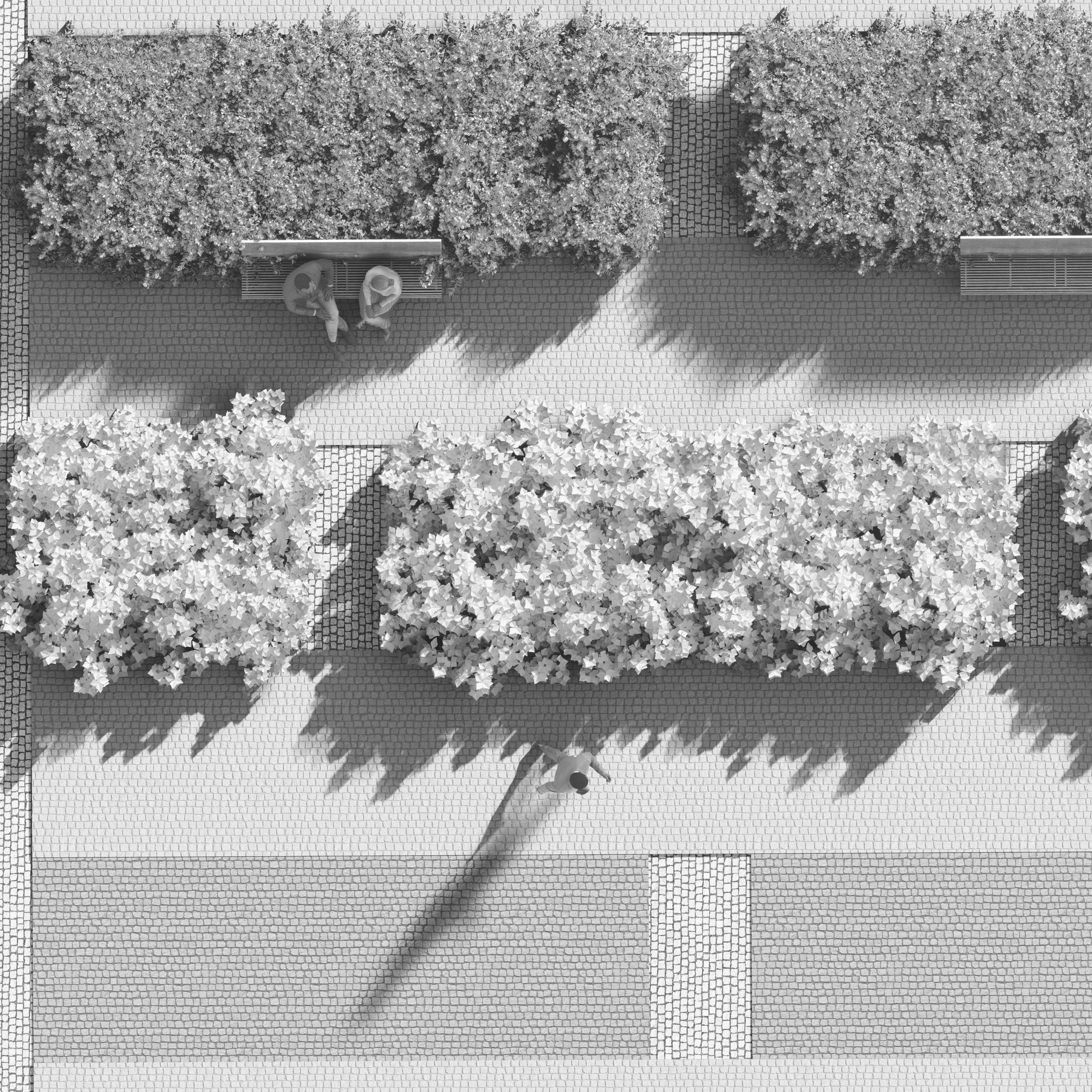 Zestaw małej architektury uzupełniają skrzynie na donice z roślinami służące do wydzielania ogródków gastronomicznych, granitowe słupki ograniczające wjazd samochodów i kosze do segregacji odpadów.