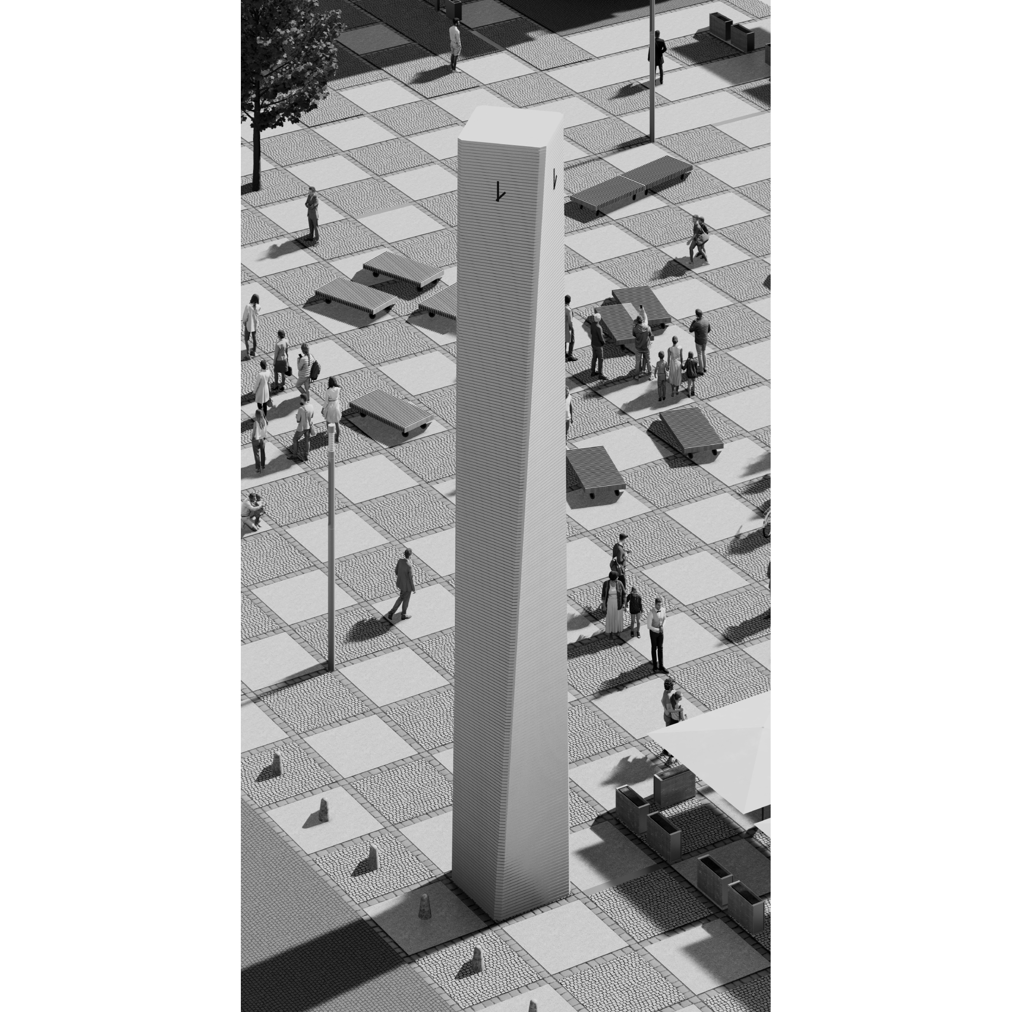 Wysoki zegar jest największym elementem małej architektury zaproponowanym w projekcie. Wbrew sugestiom zawartym w warunkach, zdaniem autorów pracy umieszczanie stylizowanego zegara w części centralnej nad bramą zamykającą ulicę Rzeźniczą nie jest najlepszym wyborem. Z większości miejsc na Rynku (oprócz tych które znajdują się blisko wschodniej pierzei) bardzo dobrze widoczny jest zegar na wieży kościoła farnego. Najlepszym miejscem na drugi zegar wydaje się narożnik po przekątnej Rynku. Kontrola czasu możliwa będzie nie tylko z dotychczasowych „martwych pól” na płycie, ale także z dalekiej perspektywy dla osób napływających na Rynek od północy. Przede wszystkim prosta wieża zbudowana z cegły w kolorze posadzki domknie lukę w północnej pierzei i nie będzie sugerowała jakiejś prawdy historycznej.