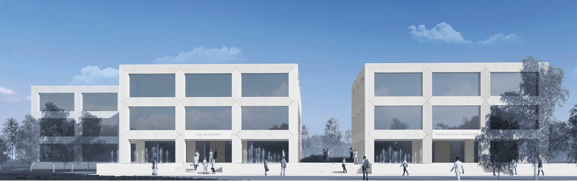 W chaotycznym otoczeniu, projekt proponuje spokojną i klasyczną architekturę zarówno w kształcie brył, jak i detali architektonicznych. Prostopadłościan o podstawie kwadratu został podzielony na ćwiartki, z których jedną oderwano i przesunięto na południe. Dzięki temu prostemu zabiegowi powstał niezależny budynek prokuratury, a cały układ zmieścił się na nieregularnej działce. Elewacje każdej z ćwiartek zostały podzielone na trzy części w poziomie i w pionie. Słupy, rygle i cokoły mają taką samą szerokość. W żłobieniach prefabrykatów, z których są zbudowane można dostrzec inspirację kanelurami doryckich kolumn. Fasady różnią się od pozostałych elewacji głębokimi podcieniami. Mimo jednorodnej struktury elewacji zespół z każdej strony wygląda inaczej. Podcienia, monumentalny taras z szerokimi schodami i pochylniami oraz płac wejściowy tworzą reprezentacyjne przedpole dla budynków, wokół obiektów i pomiędzy nimi powstają półotwarte wnętrza o różnym charakterze.
