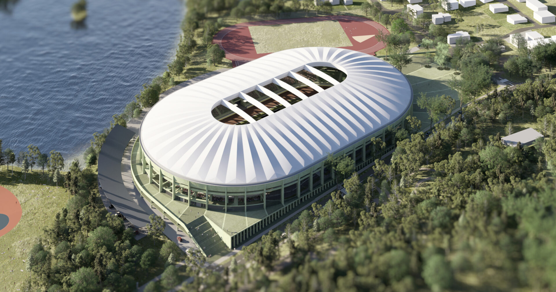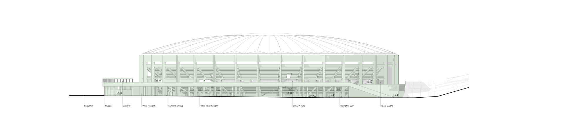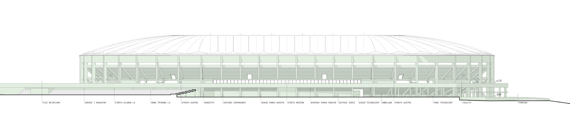 Koncepcja stadionu opiera się na prostocie i oszczędności formy. Architektura obiektu pozbawiona jest zbędnych dekoracji – dominują logiczne rozwiązania konstrukcyjne i starannie dobrane proporcje. Minimalizm sprzyja ponadczasowości, a zastosowanie trwałych, odpornych na starzenie materiałów przekłada się na przewidywalnie niskie koszty budowy i eksploatacji. Powstaje wizja stadionu funkcjonalnego, długowiecznego i estetycznie powściągliwego.