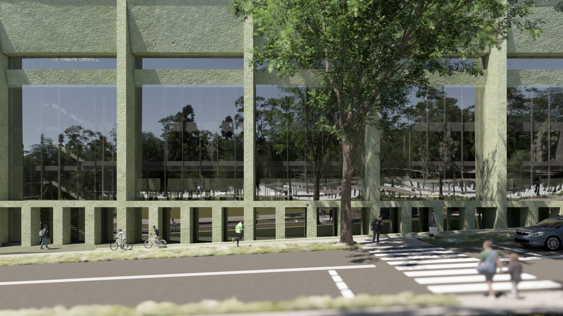Zamiast surowego betonu zaproponowano beton barwiony w masie na zielono – subtelne nawiązanie do lokalnego krajobrazu i historii Rybnika. Taka kolorystyka harmonizuje z otoczeniem: wzgórzem Wiśniowiec, starodrzewem szpitala, Kąpieliskiem Ruda oraz terenami sportowymi. Odwołuje się również do barw historycznego ROW-u Rybnik, obecnych w herbach działających tu klubów sportowych oraz w logotypie MOSiR.