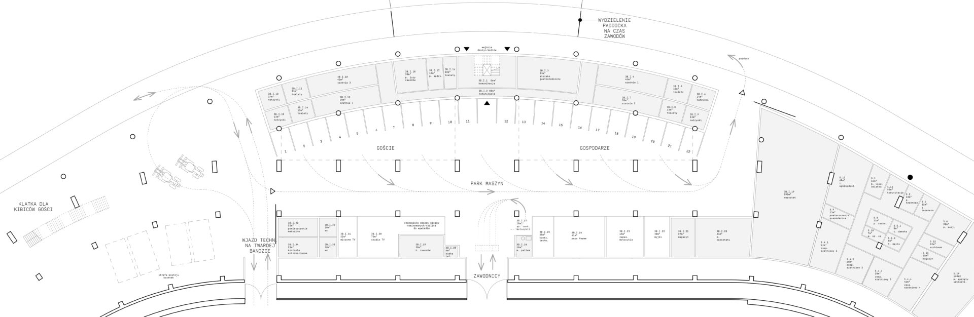 Podczas zawodów park maszyn wraz z padokiem stanowić będzie wydzieloną strefę o przejrzystym i bezpiecznym układzie, zgodnym z wytycznymi Polskiego Związku Motorowego. Strefy gości i gospodarzy rozmieszczono symetrycznie względem osi wjazdu na tor. Centrum parku maszyn jest doświetlone poprzez strop z luksferów. Wentylatory kanałowe odprowadzają spaliny ponad pawilonem z szatniami dla zawodników. Bezpośrednio nad parkiem maszyn, na poziomie 0, zlokalizowano strefę przeznaczoną dla mediów.