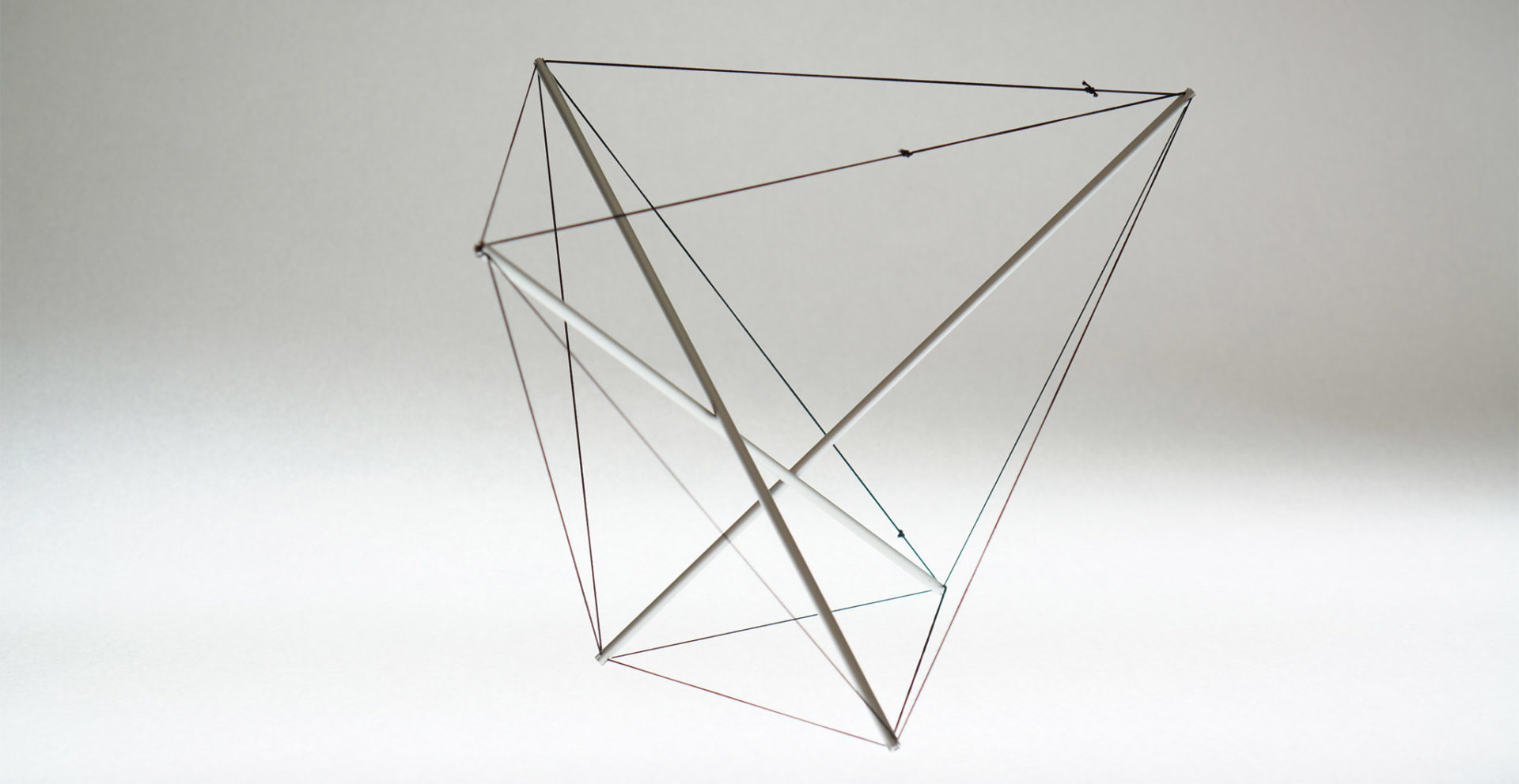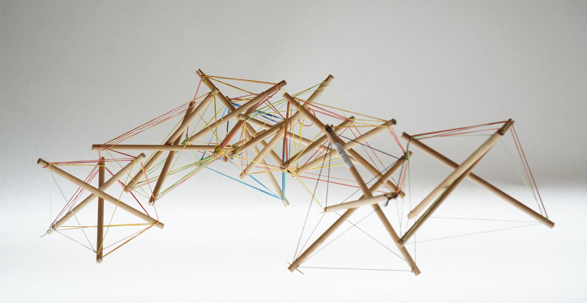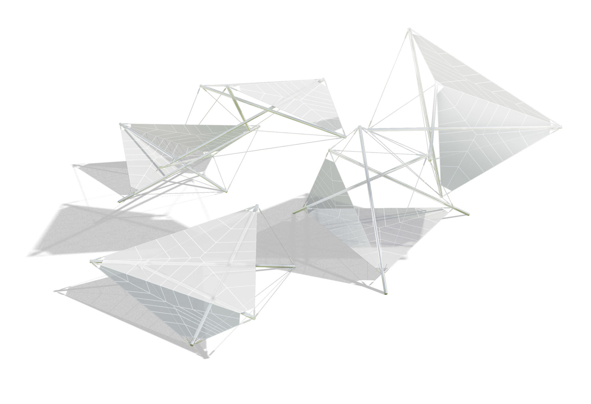 This additive Pavilion structure is freely composed of five tensigrity modules/cells, but it is not difficult to imagine further expansion. Our competition entry consists of fifteen thirteen-foot- long aluminum rods, along with five membranes and steel ties. The membrane consistency limits the distortion of wind and furthermore dematerializes the pavilion object as it blends into its surrounding environment. The rods are finished with simple bolted heads to which the ties are fixed. The bolts located on the ties are used to create tension within the whole system. The ends, that come into contact with the ground, are finished with pins that are firmly screwed into the soil.