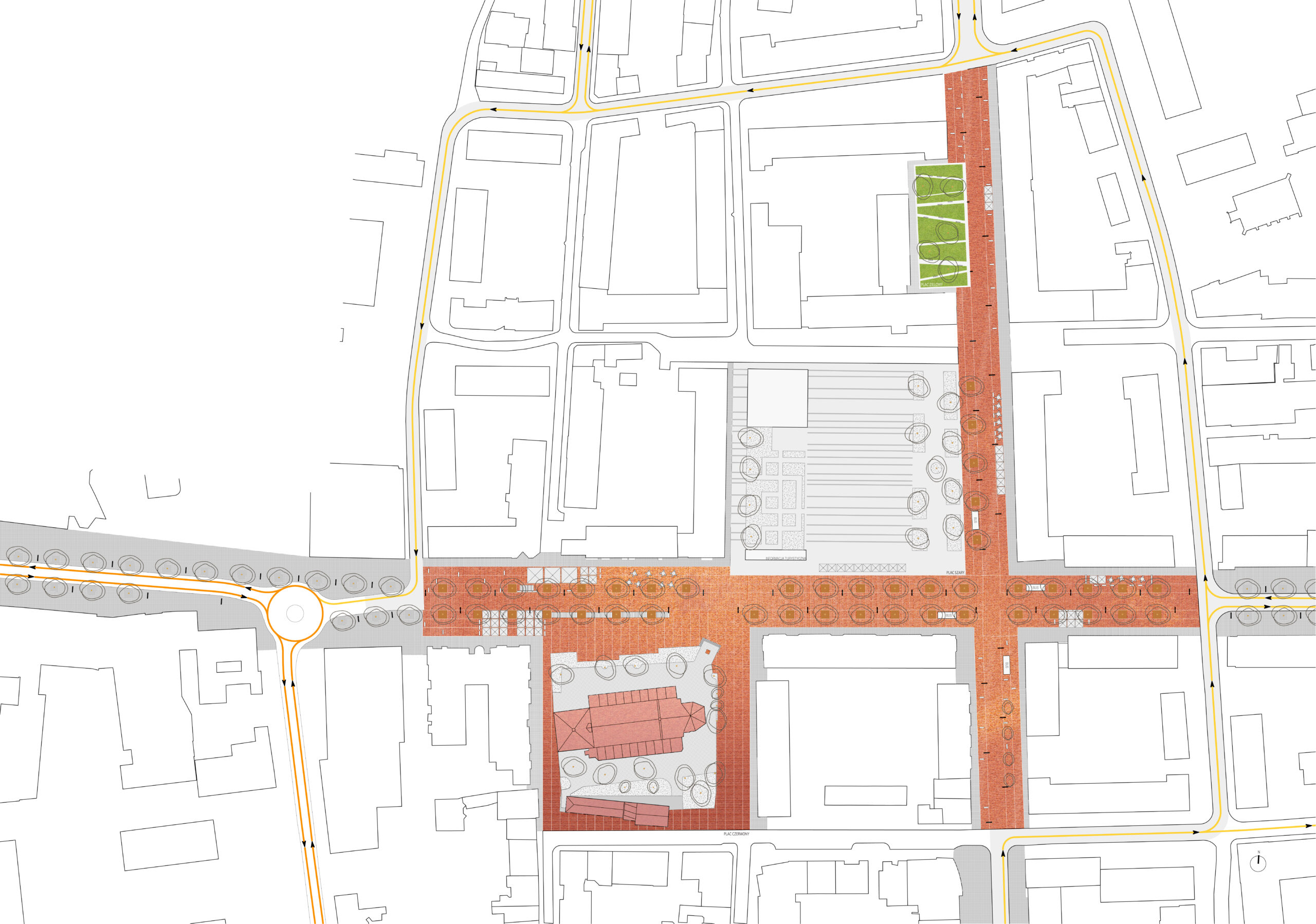 Oprócz placów „czerwonego” i „szarego” zaproponowano dodatkowo kilka mniej lub bardziej domkniętych przestrzeni mających charakter placu. Wprowadzanie ich z jednej strony wyznacza miejsca ważne, z drugiej stanowi przerwanie lub zamknięcie długich osi komunikacyjnych. Dla pieszych taka różnorodność powoduje wrażenie skrócenia dystansów i zachęca do pokonywania ich piechotą.