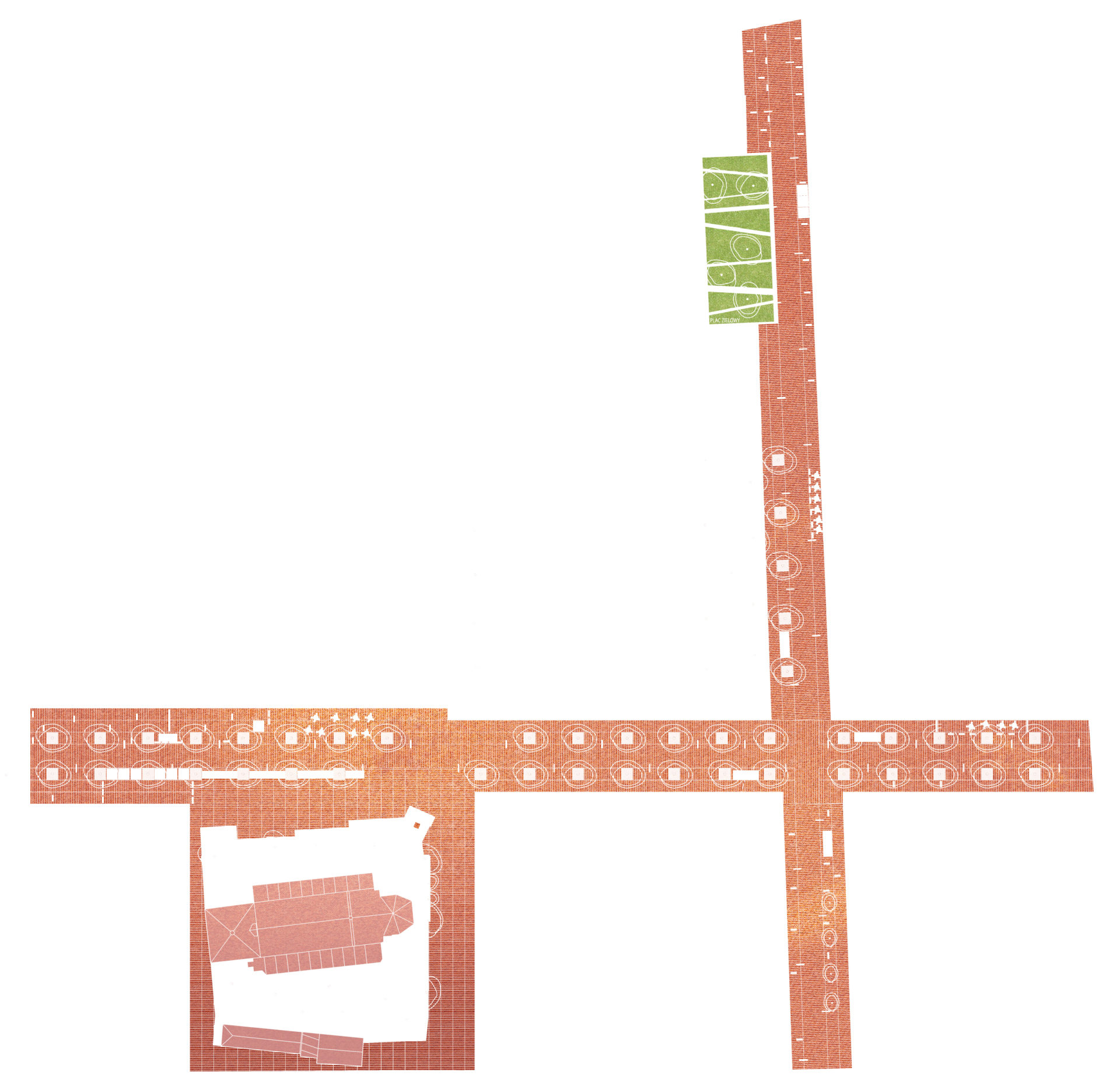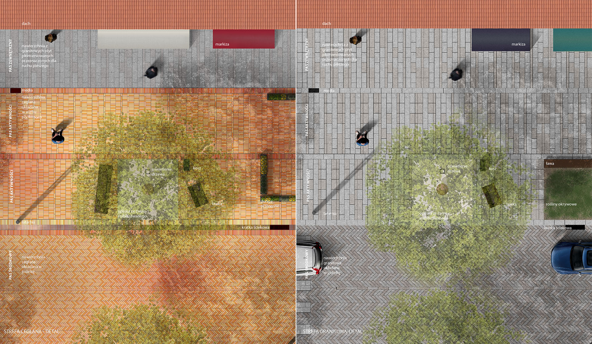 Najpoważniejsze zmiany w zakresie materiałowym i użytkowym na opracowywanym obszarze dotyczą posadzki. Wydzielone zostały dwa obszary, które nazywać można strefą ceglaną i strefą granitową. Obie strefy zbudowane są na tym samym pięciopasmowym schemacie ogólnym w miarę potrzeb modyfikowanym. Schemat ogólny wyznacza rytm drzew, latarni, kratek ściekowych i punktów zasilania pasa aktywności w energię elektryczną i wodę.