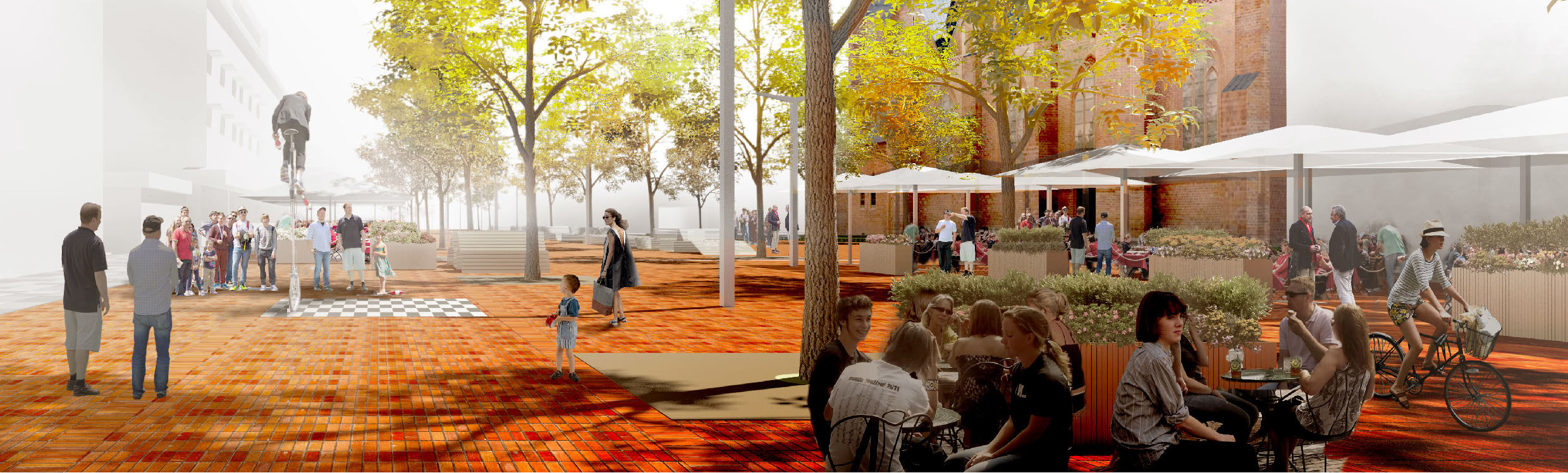 Czerwony, ceglany, stary plac jest równowagą i alternatywą dla szarego, granitowego, współczesnego rynku. Wieży katedry odpowiada wieża ratusza. Razem place tworzą nową jakość