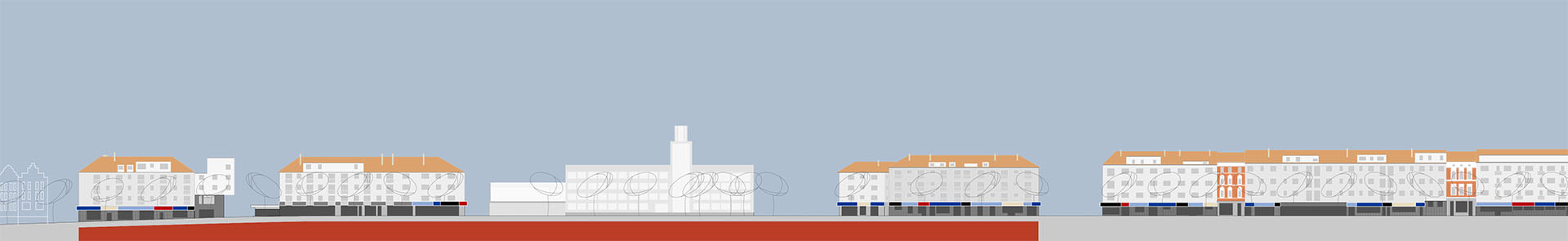 Zwycięski projekt zakłada również uporządkowanie pozostałych elementów definiujących przestrzeń miejską, takich jak elewacje budynków istniejących, których kolorystykę ujednolicono opierając się na gamach ciepłych, z akcentami bieli i czerni. Jednorodne markizy oddzielają usługowy parter od mieszkalnych kondygnacji wyższych. Przestrzeń Starego Miasta oświetlono, w przeciwieństwie do pozostałych ulic, ciepłą barwą światła, co pozwoliło na precyzyjniejsze zdefiniowanie jego nieostrych granic.