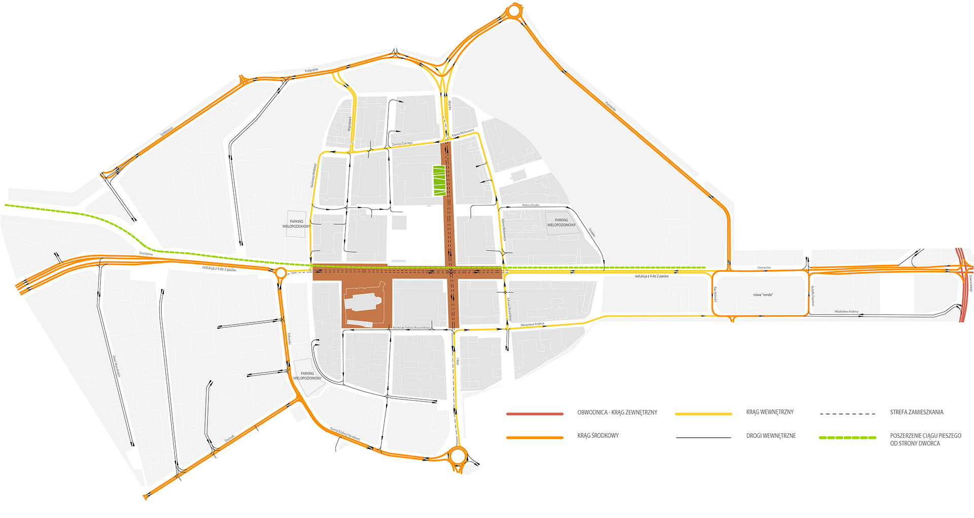 Ciekawym rozwiązaniem ułatwiającym mieszanie się ruchu pomiędzy dwoma wewnętrznymi kręgami jest wprowadzenie ruchu obwodowego w układzie Plac Wolności, Władysława Andersa, Rudolfa Clausiusa, Zwycięstwa.
