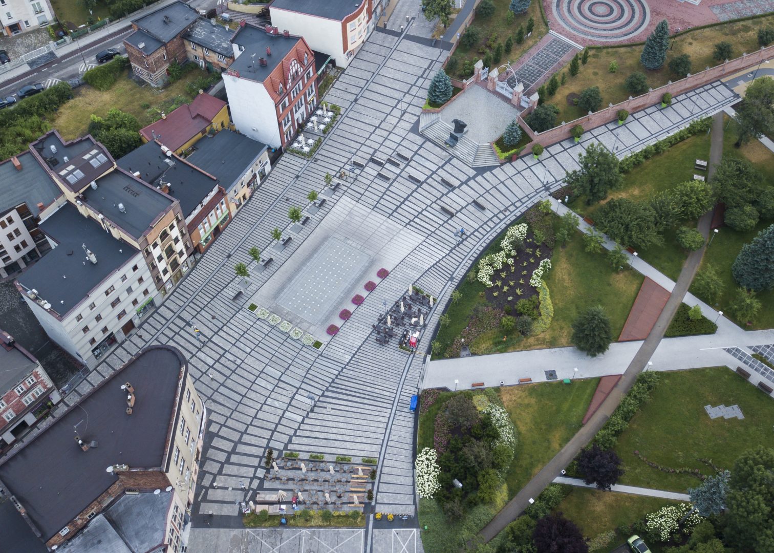Obrys placu od strony południowej został uregulowany i domknięty przeźroczystą, amfiladą okalającą park.