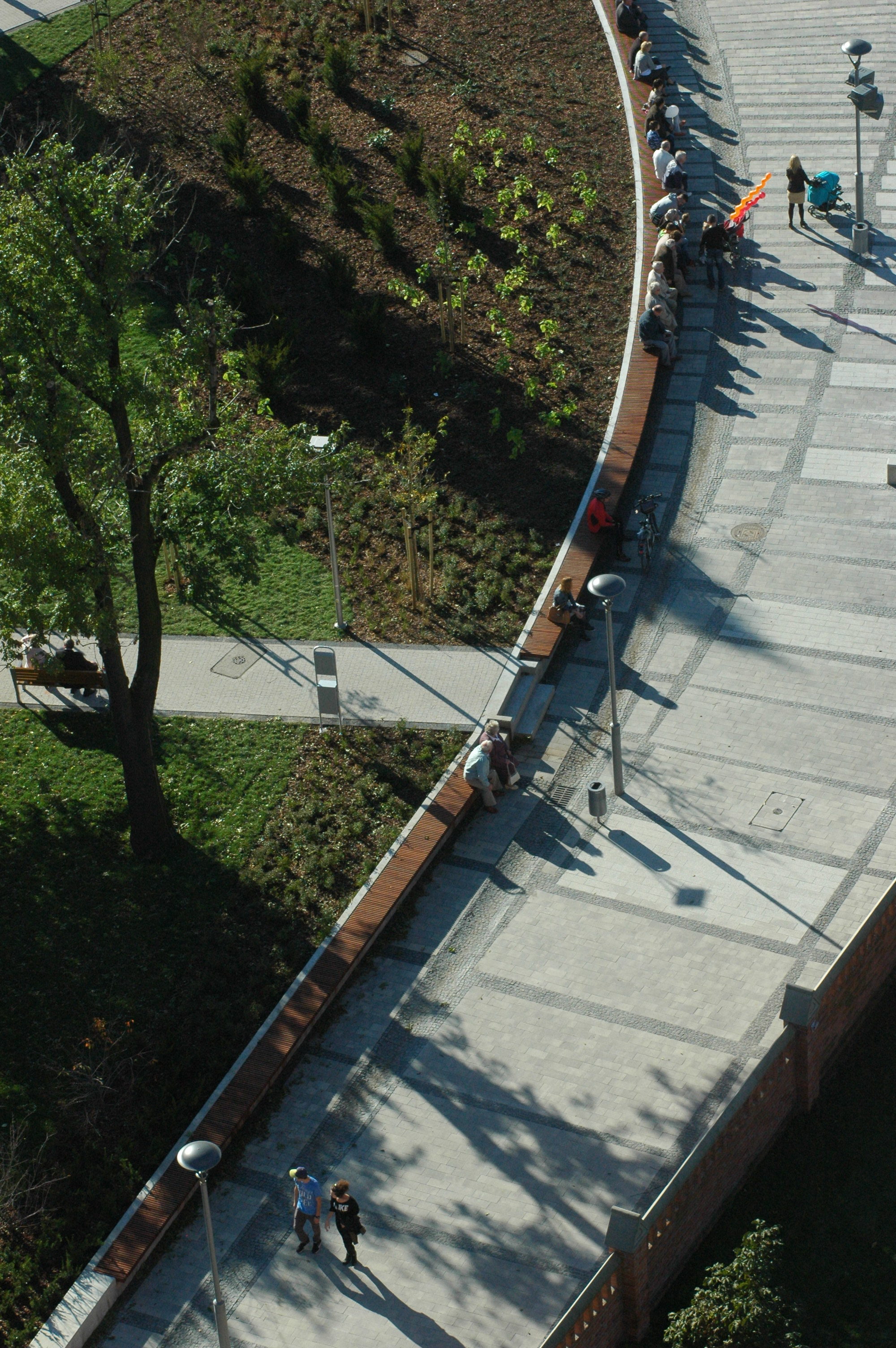 Na styku placu i parku zaprojektowano prawie 60-cio metrową ławę.