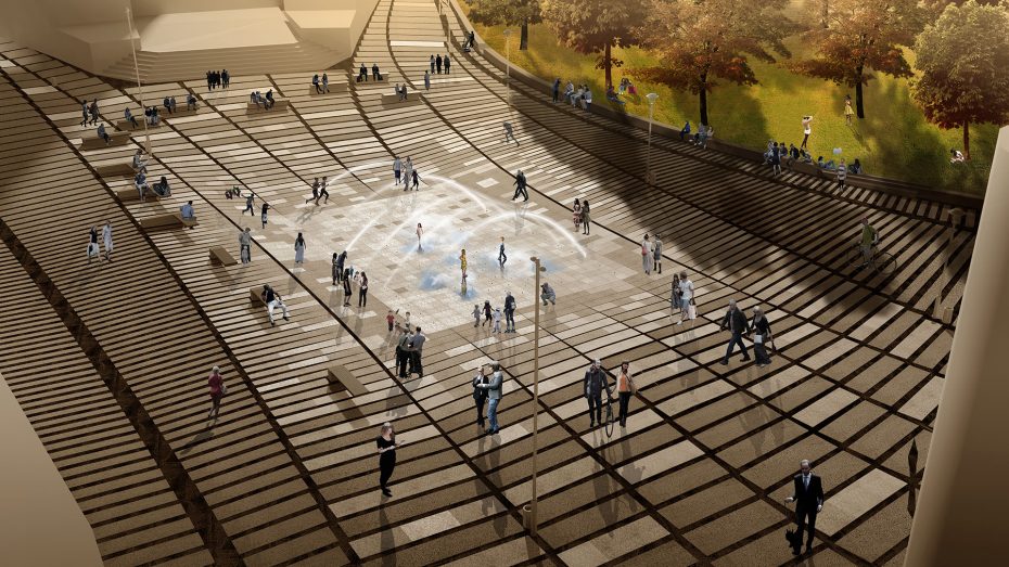 W centrum w obniżeniu posadzki mieścić się ma fontanna sterowana komputerowo. Około 50 dysz w różnych sekwencjach emitować ma strumienie wody. Czujniki ruchu wygaszać będą dysze w przypadku kiedy ktoś zechciałby przejść w poprzek fontanny. Każdy ze strumieni ma być podświetlany, a całości dopełniać ma odpowiednie nagłośnienie.