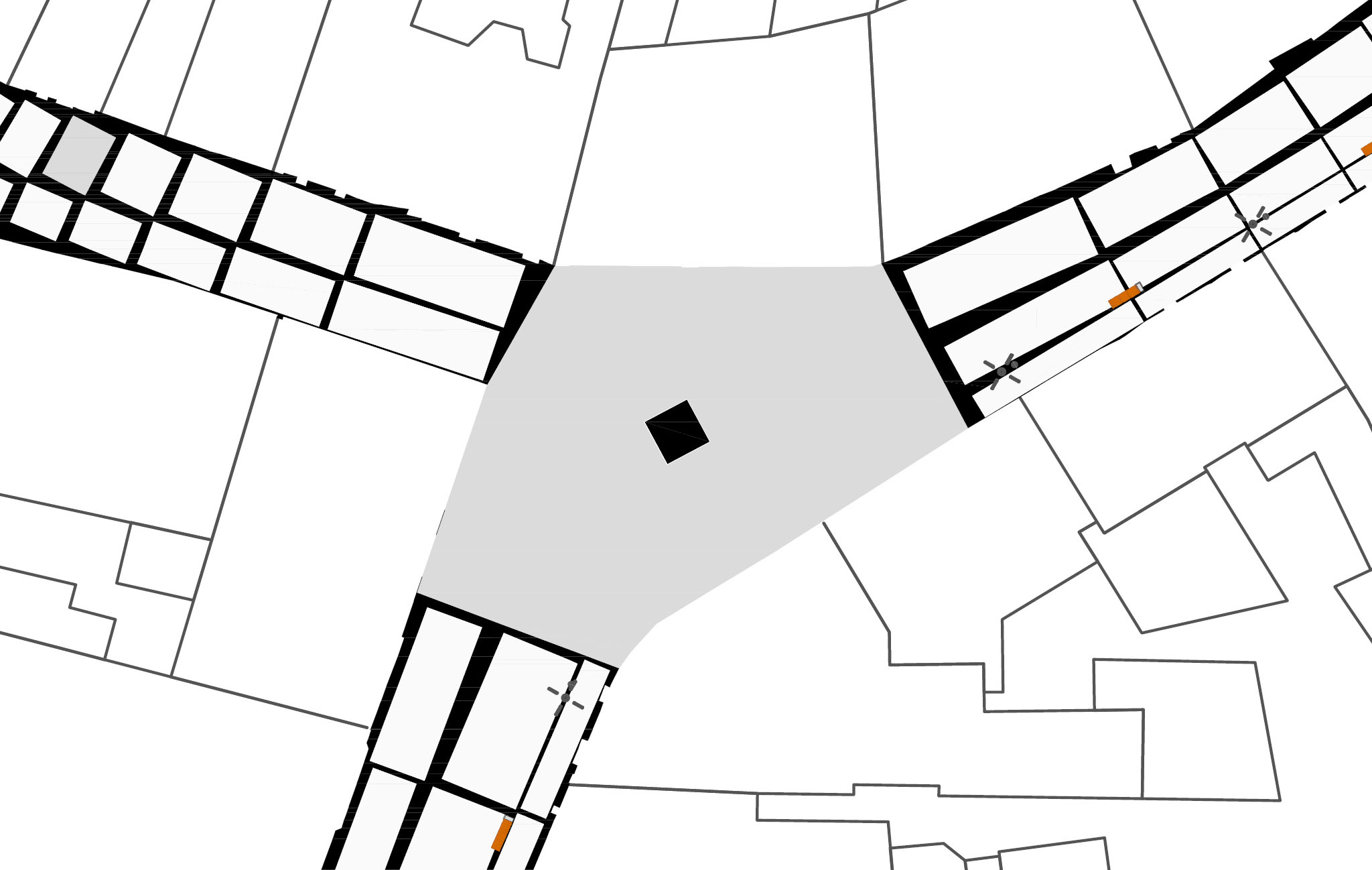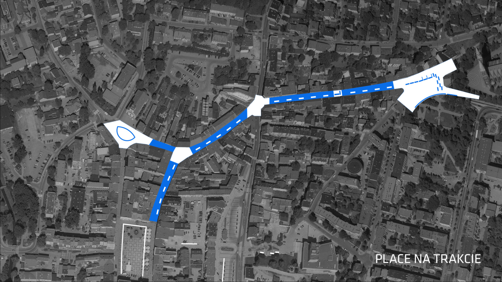 Trakt północ – południe (Gliwicka, Łony ) krzyżuje się z projektowanym deptakiem właśnie na placu Przejścia.