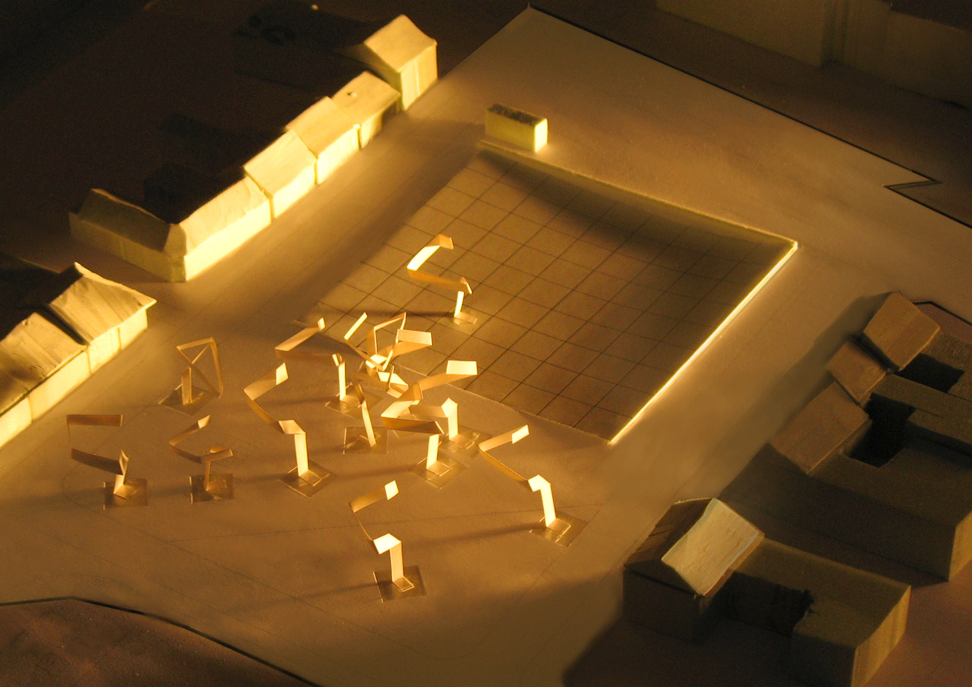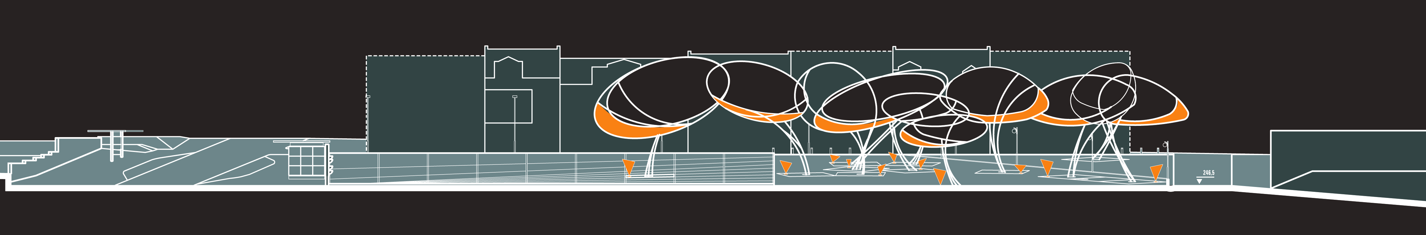Te dwie strefy, pomimo, że stanowią jedną płytę rynku, mają odmienny charakter i przeznaczenie. Pierwsza, granicząca z kościołem „p.w. Św. Marcina” pokryta granitową kostką brukową o miękkim rysunku wyraźnie nawiązuje do ducha miejsca. Korony drzew, które pozostawiono, poddane powinny być odpowiednim zabiegom pielęgnacyjnym. W założeniu tworzyć mają one zawieszony nad powierzchnią placu baldachim wsparty na kolumnach pni. Dla spotęgowania efektu przekrycia zaprojektowano zatopione w powierzchni placu reflektory oświetlające korony drzew po zmroku. Nieco chaotyczny układ zieleni wynikający z poprzednich założeń dodatkowo „zmiękczy” przestrzeń. W modułowe żeliwne zlicowane z powierzchnią kostki okratowania, których zadaniem jest zapewnienie nieutwardzonej powierzchni o wymiarach 5 x 5m wokół pni wkomponowane zostały ławki umożliwiające odpoczynek w miejscu zacienionym.